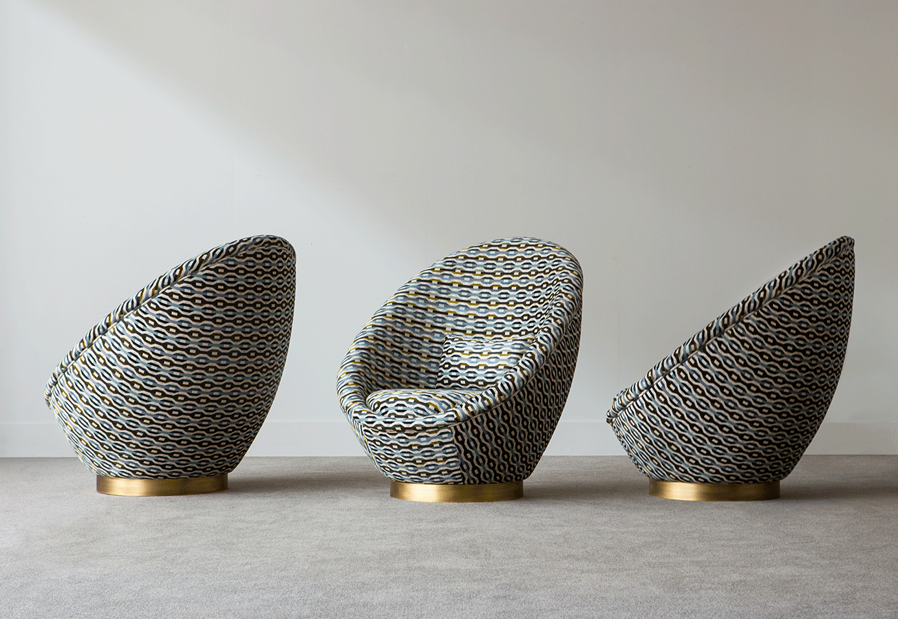 It has a wooden frame and base; the latter is also available with optional brass surround. It is available in fabrics or leathers Cat I-VI (11.5m / un.), with the option of customer’s own material.