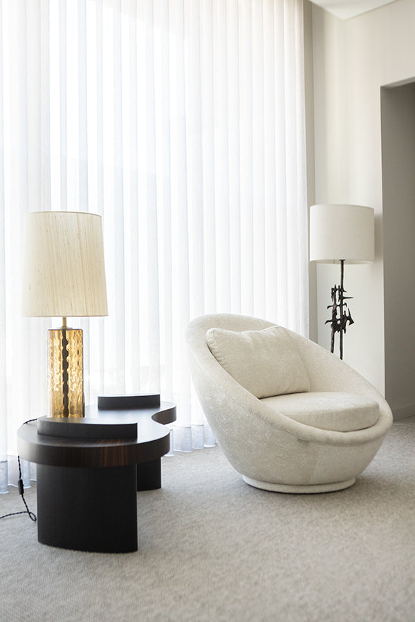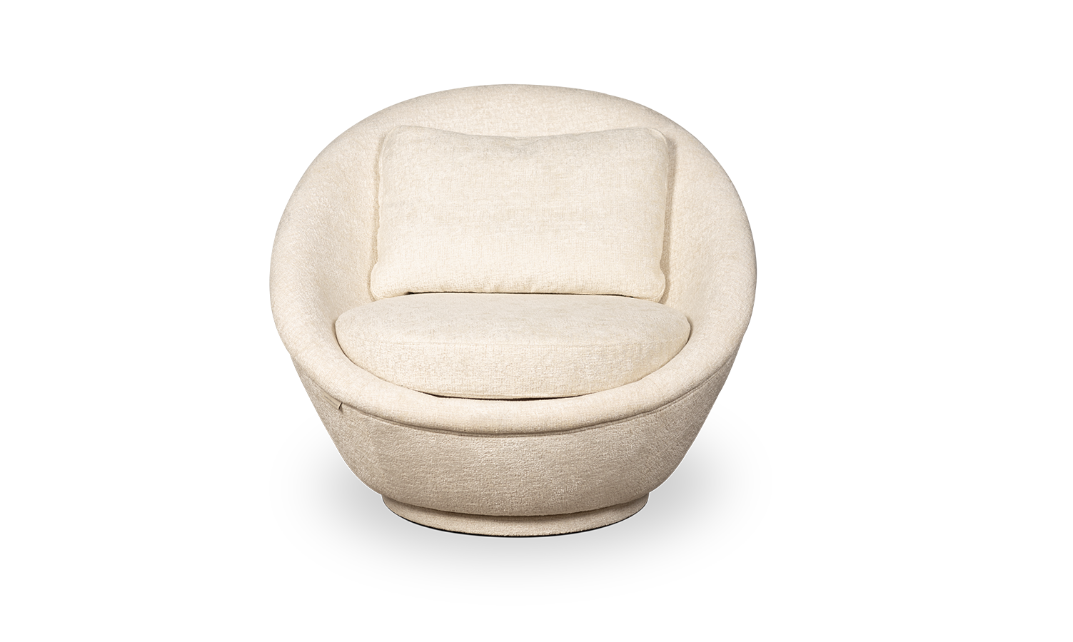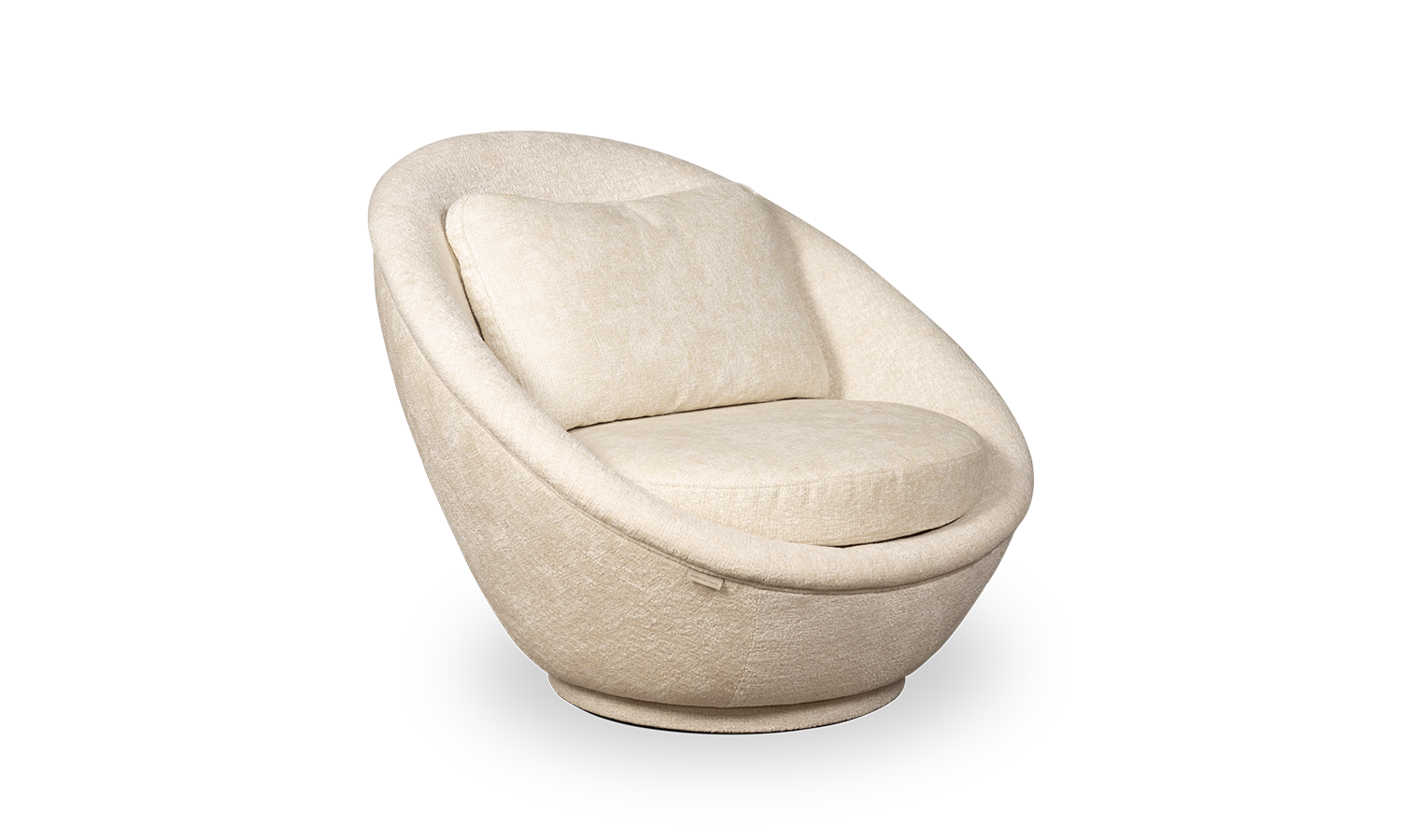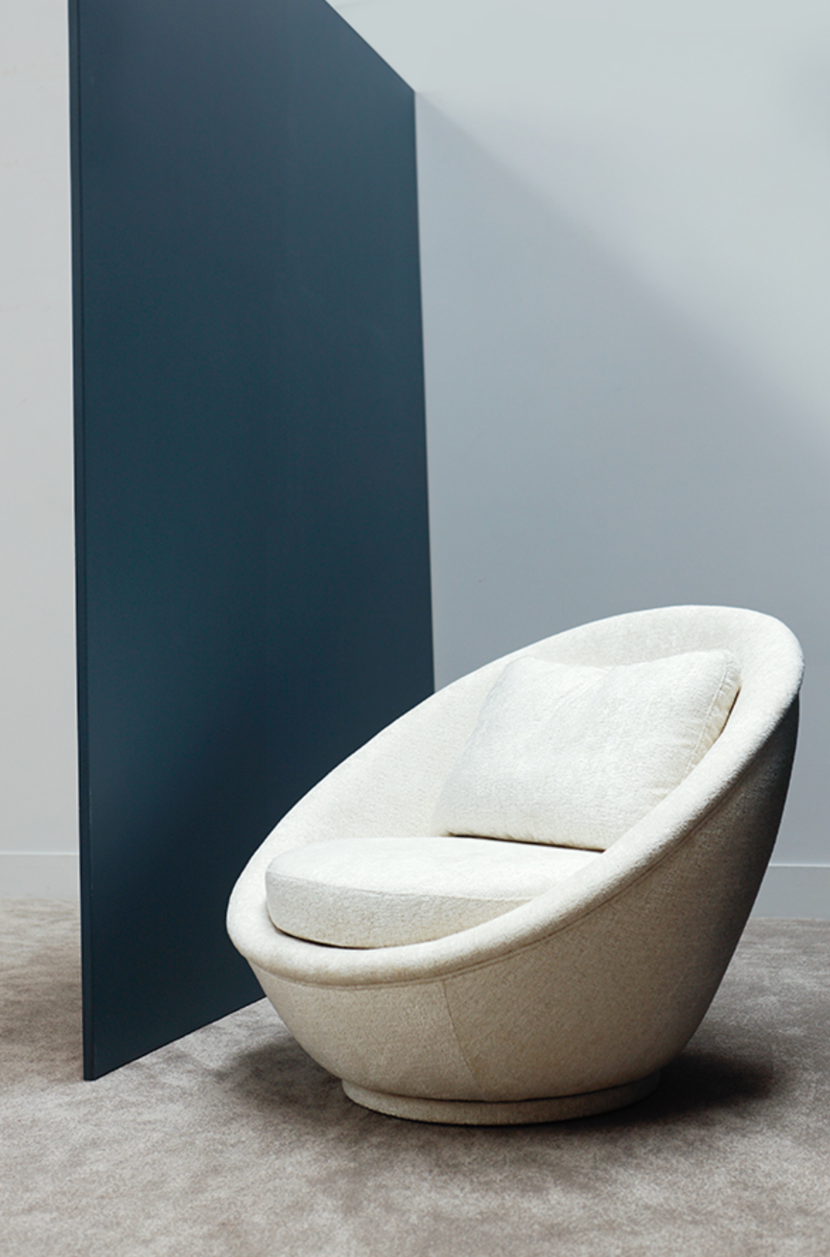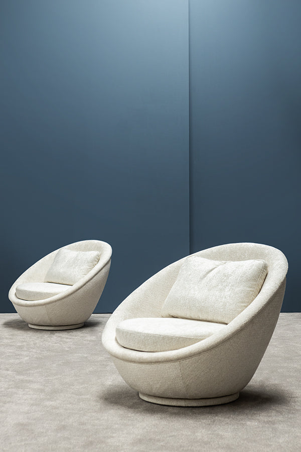 With its enveloping structure framed by piping and its independent seat cushion resting on a swivel base, the Aggi II armchair is a profusion of curves and an explosive aesthetic.
