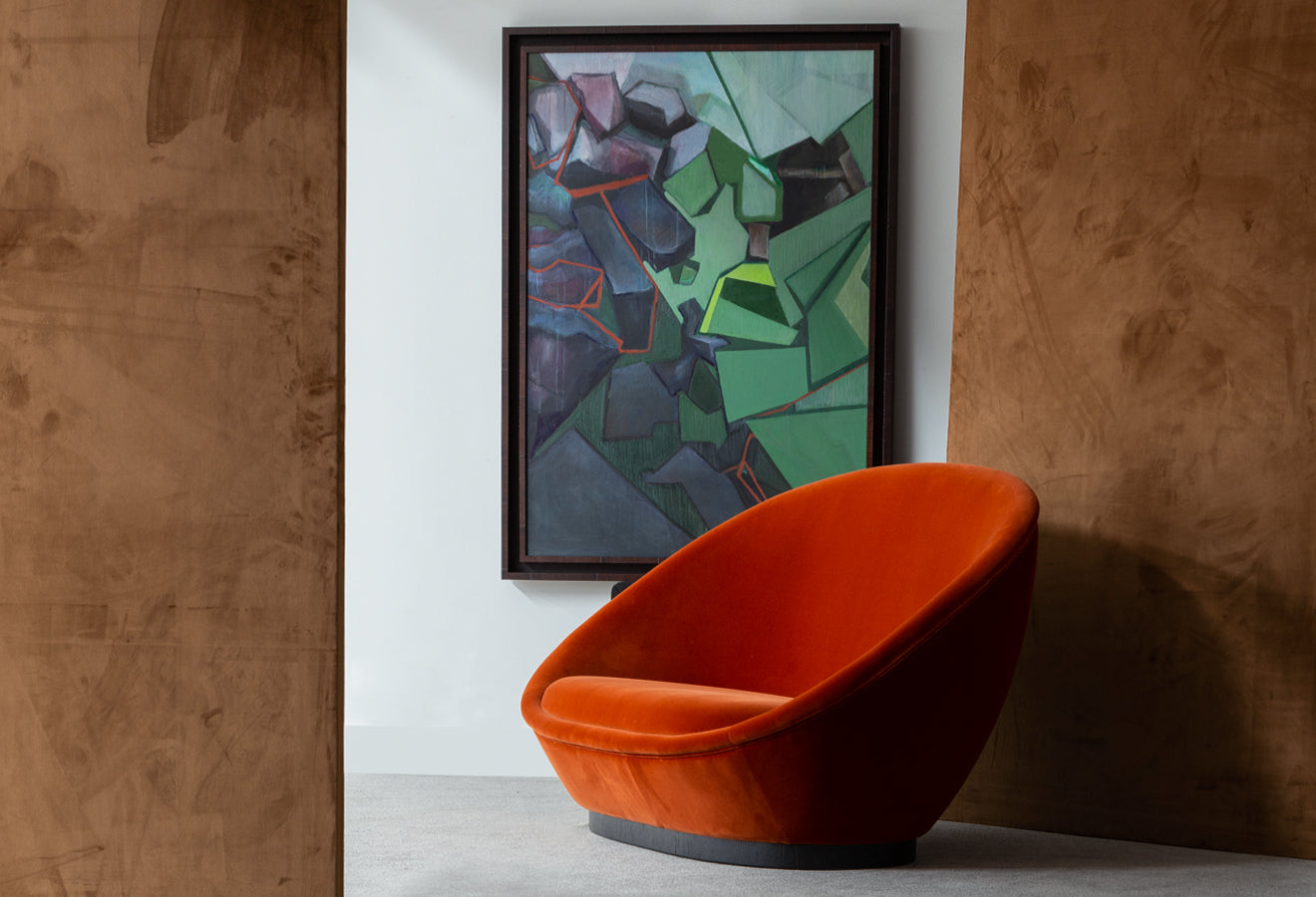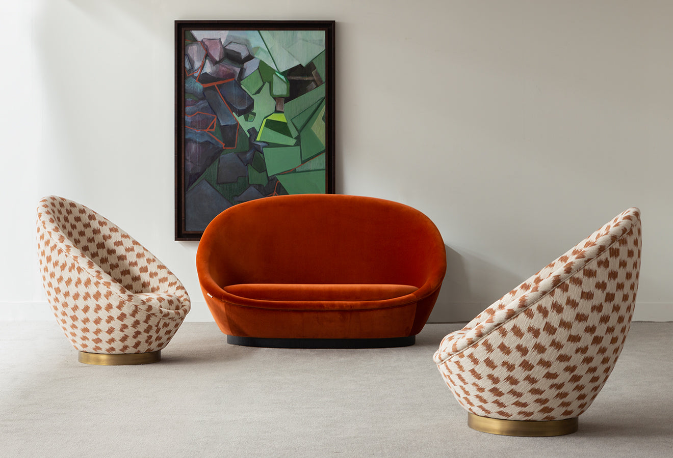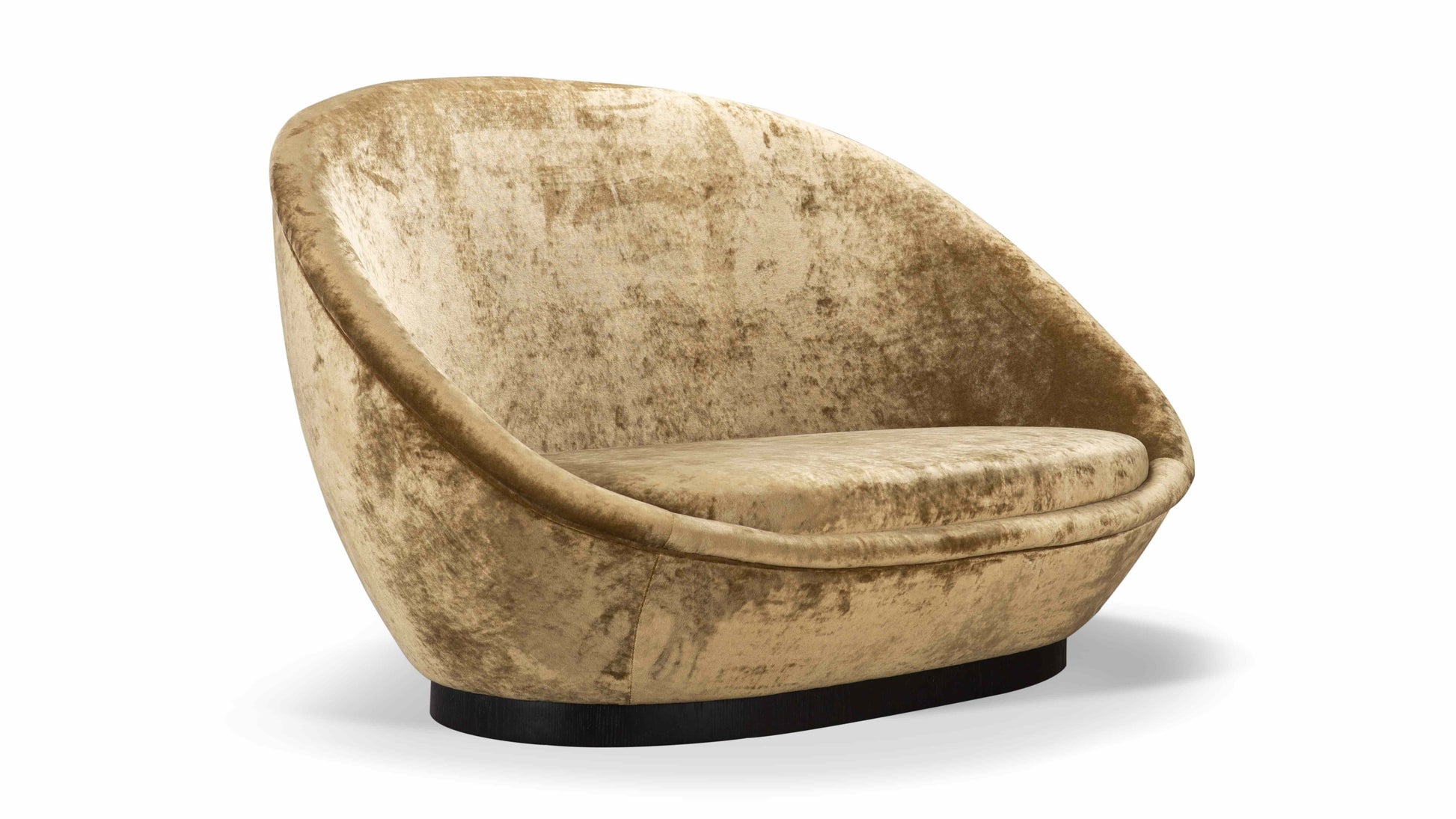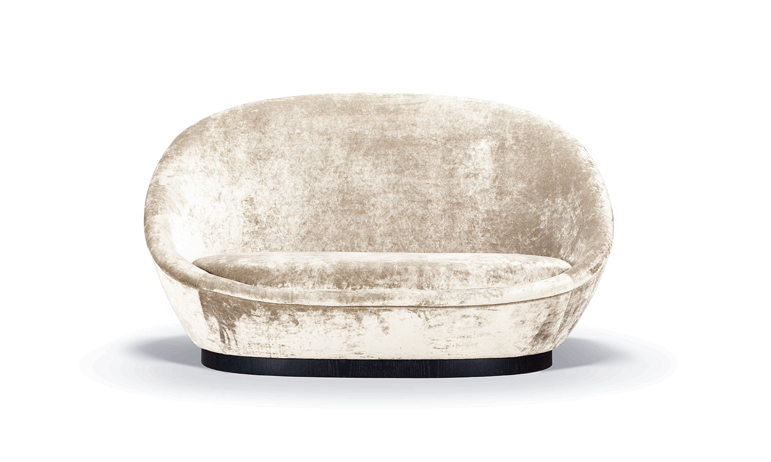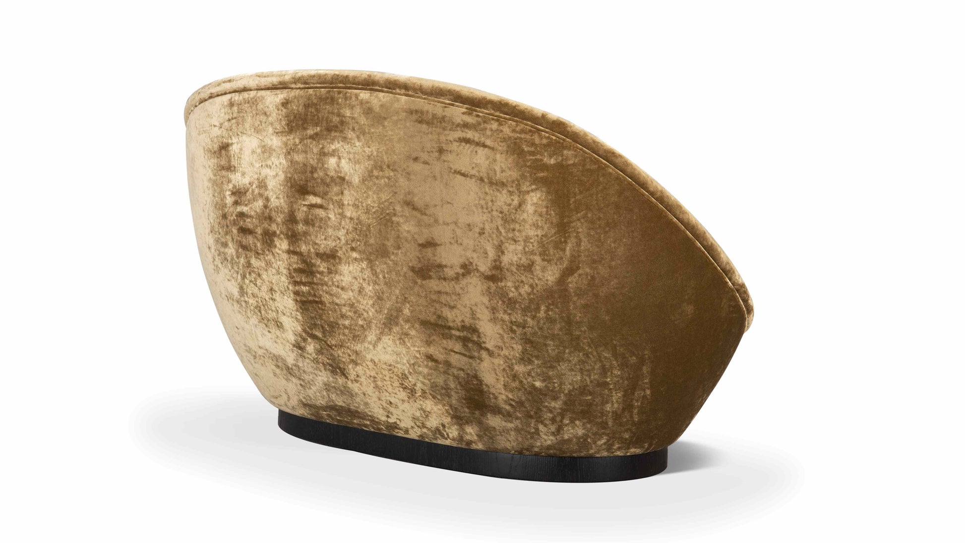 It has a wooden frame and base; the latter is also available with optional brass surround. It is available in Cat I-VI fabrics or leathers with the possibility of client fabrics.