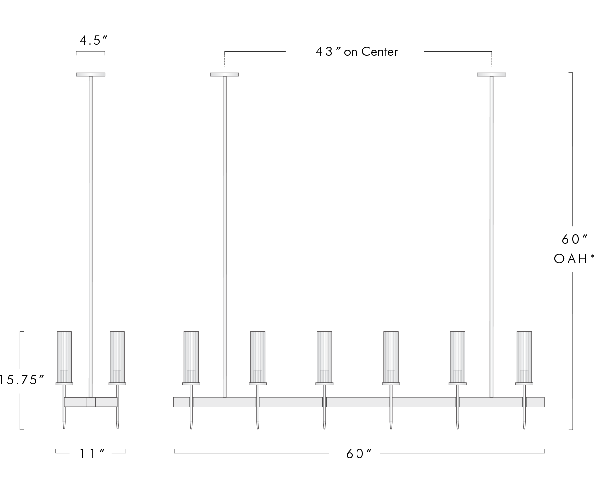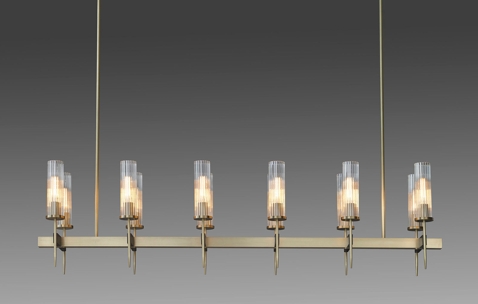 The Alouette Chandelier is machined by hand from solid brass. The shades are reeded borosilicate glass. All parts are hand polished and patina'd or plated.