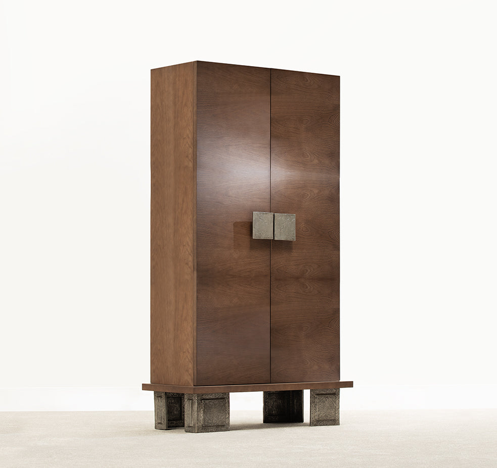 Pure lines and bold volumes give Amedeo armoire a unique look. Unapologetically geometric, this cabinet brilliantly blends materials and proportions to create a refined and modern atmosphere. Amedeo armoire adapts to your space while meeting both your functional needs and aesthetic desires.