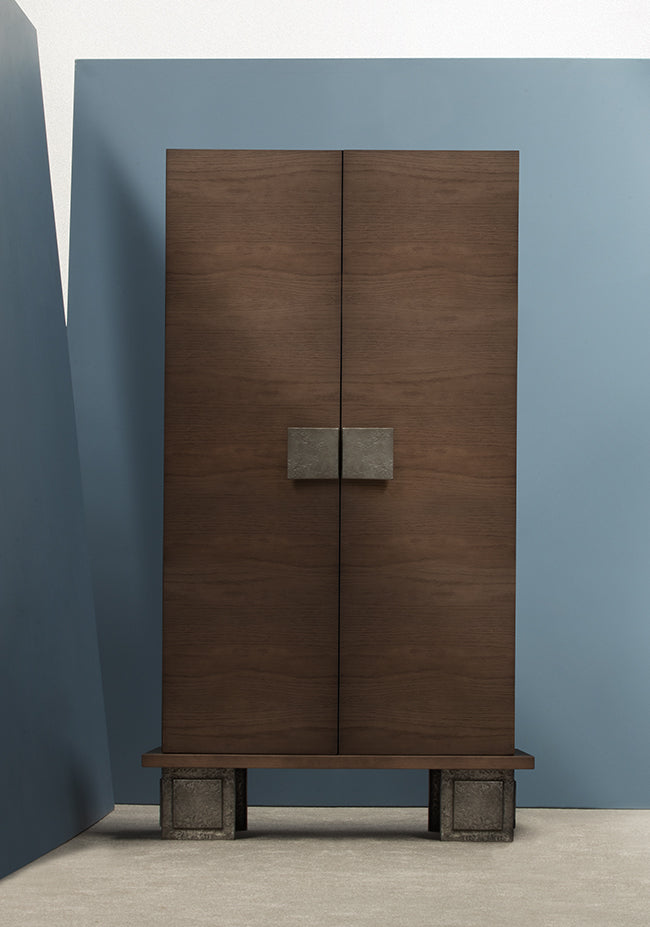 Through a play of shapes, this ‘classic-contemporary’ cabinet showcases the expertise of local craftsmen who have perfected these sculptural cast forms. The structure is in oak veneer, but other woods veneers are possible. Its base and handles are available in both cast aluminium and cast brass.