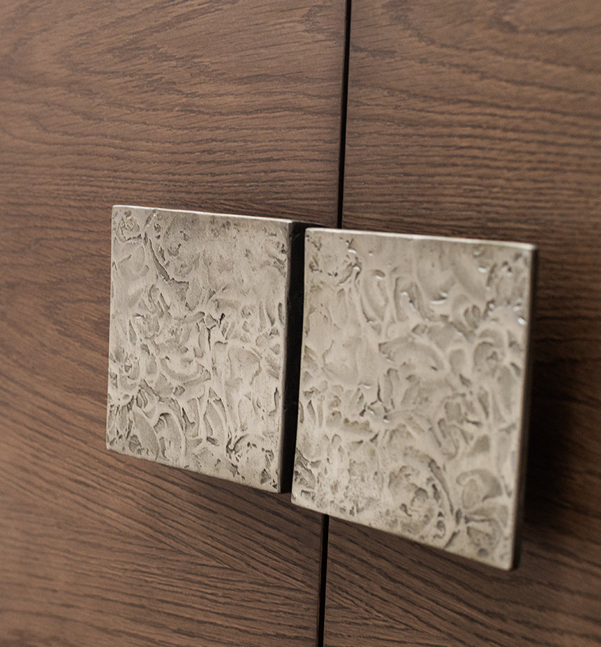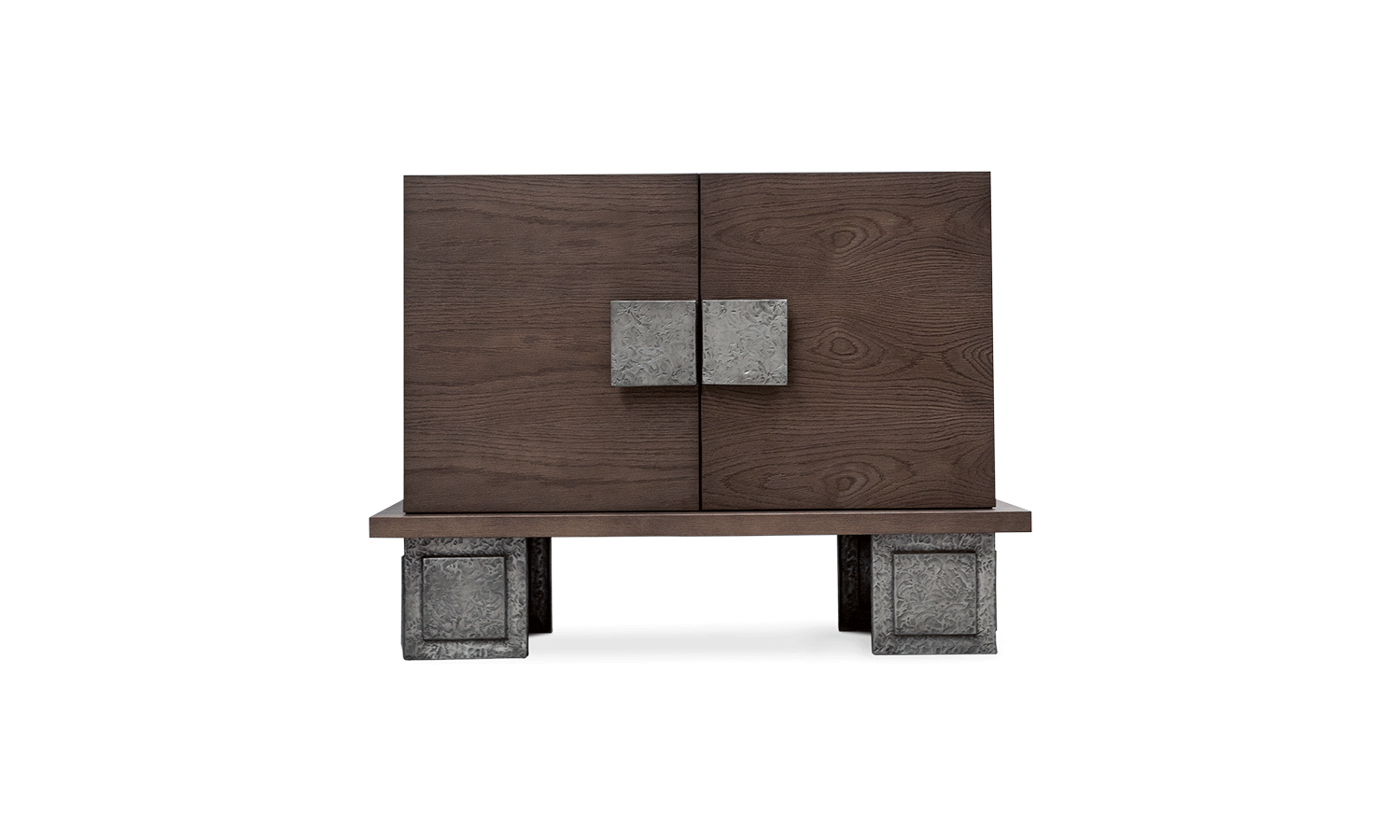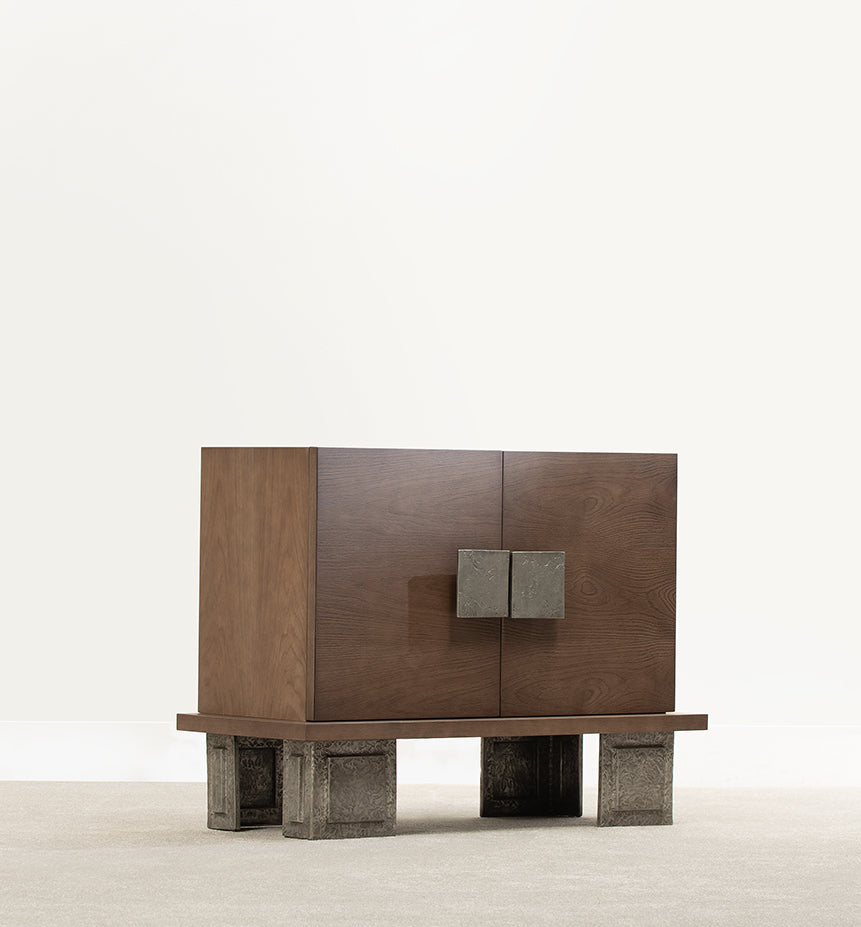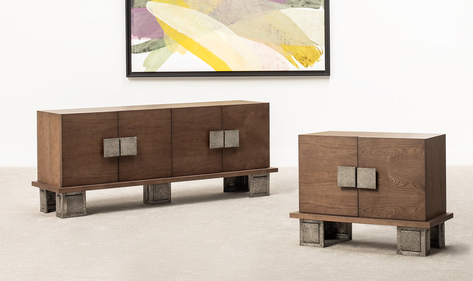 Through a play of shapes, this ‘classic-contemporary’ sideboard showcases the expertise of local craftsmen who have perfected these sculptural cast forms. The structure is in oak veneer, but other woods veneers are possible. Its base and handles are available in both cast aluminium and cast brass.