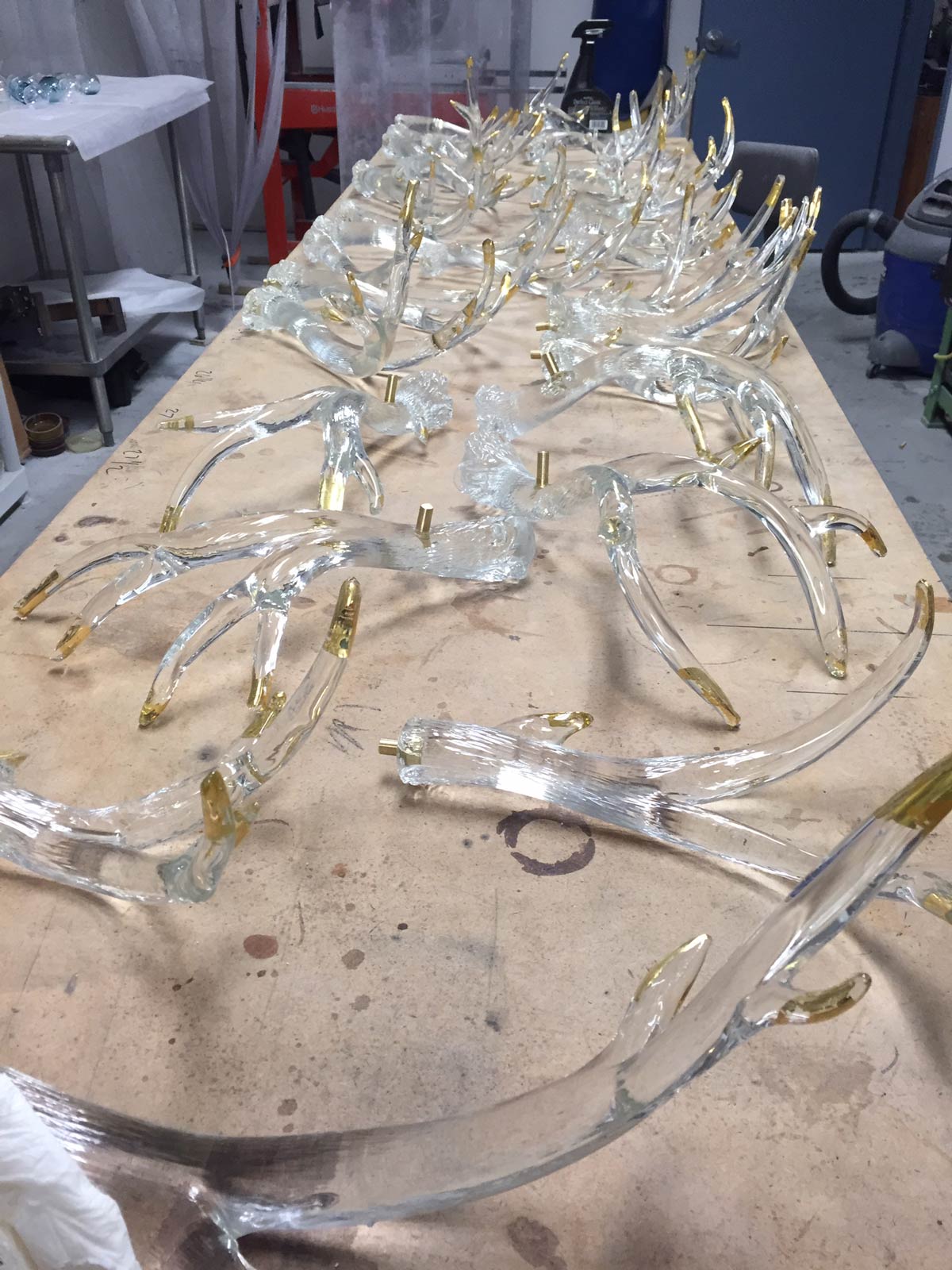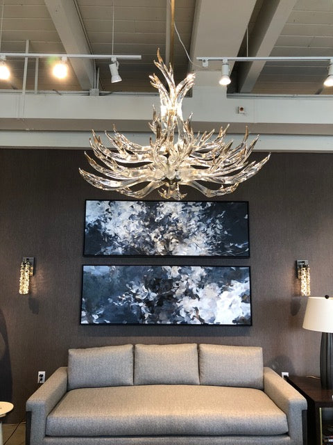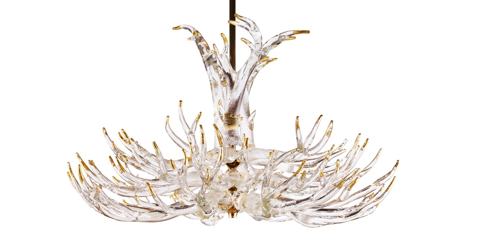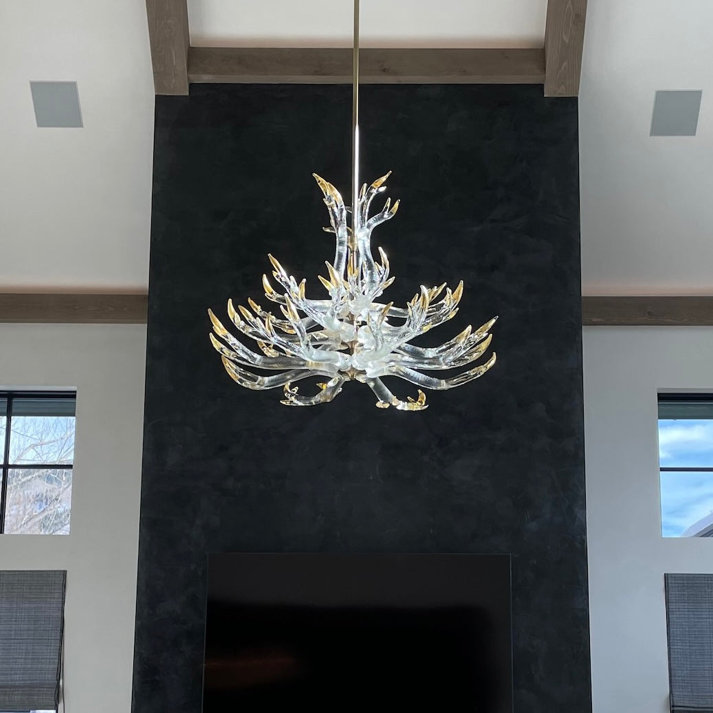 Hand sculpted molten glass formed into 23 antlers with 24k gold leaf tips. 4 maginficent tiers. 45"dia. Polished brass solid hardware construction.