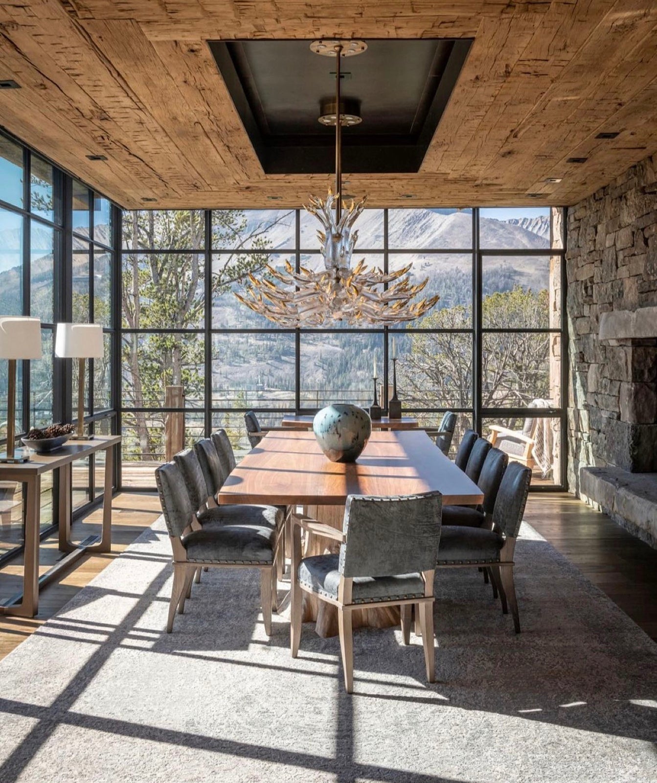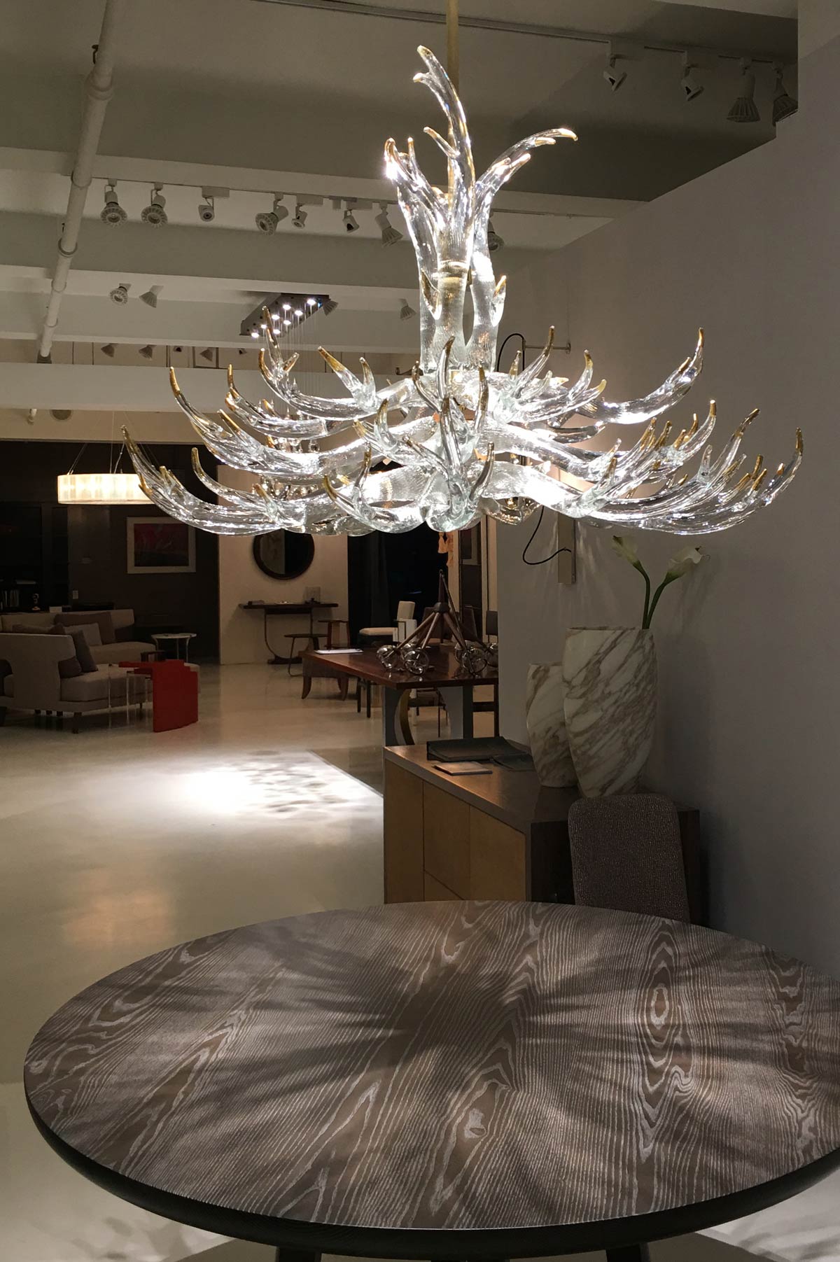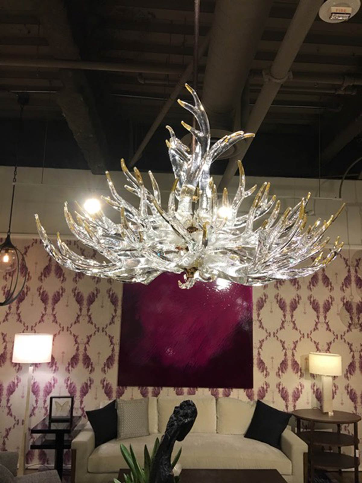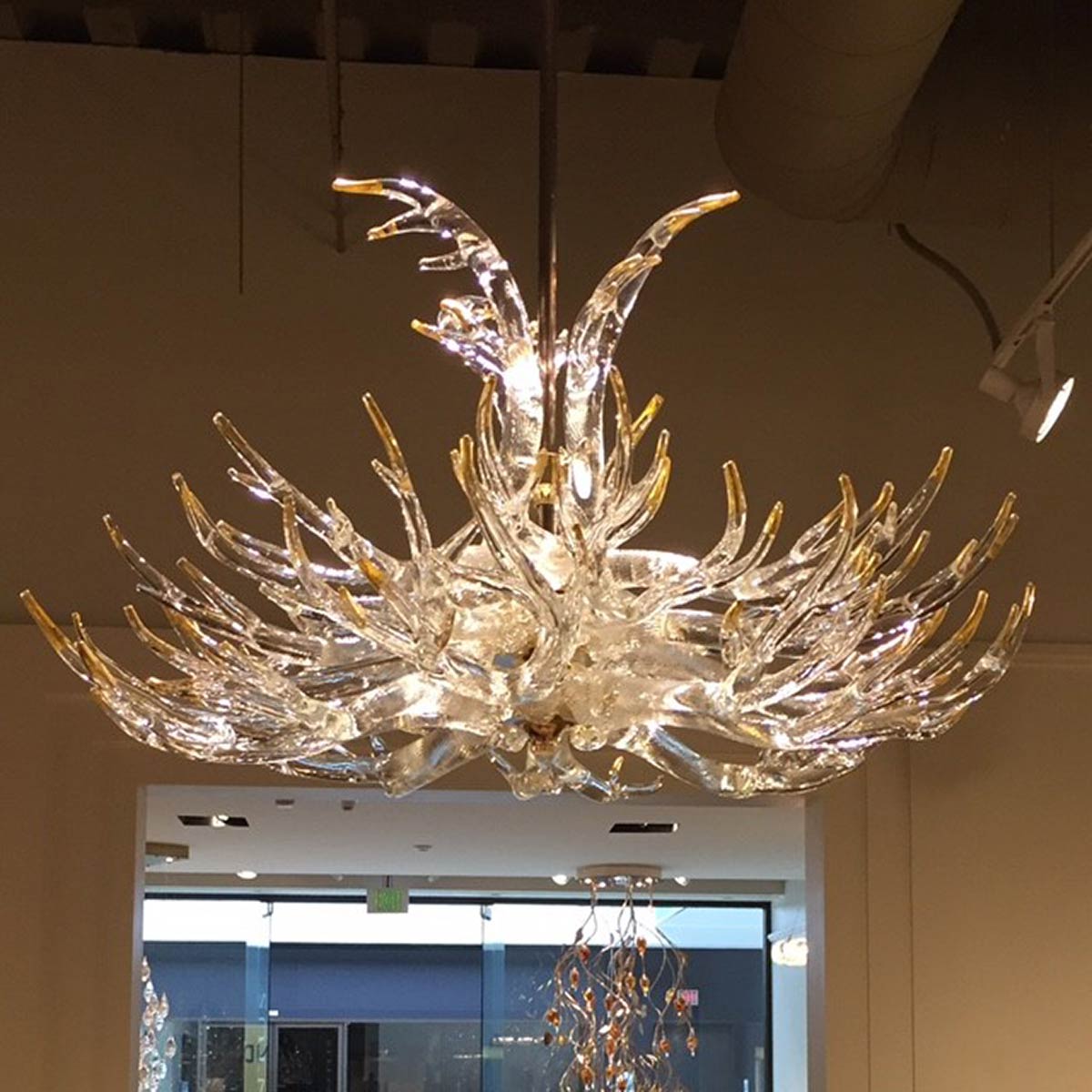 Hand sculpted molten glass formed into 23 antlers with 24k gold leaf tips. 4 maginficent tiers. 45"dia. Polished brass solid hardware construction.