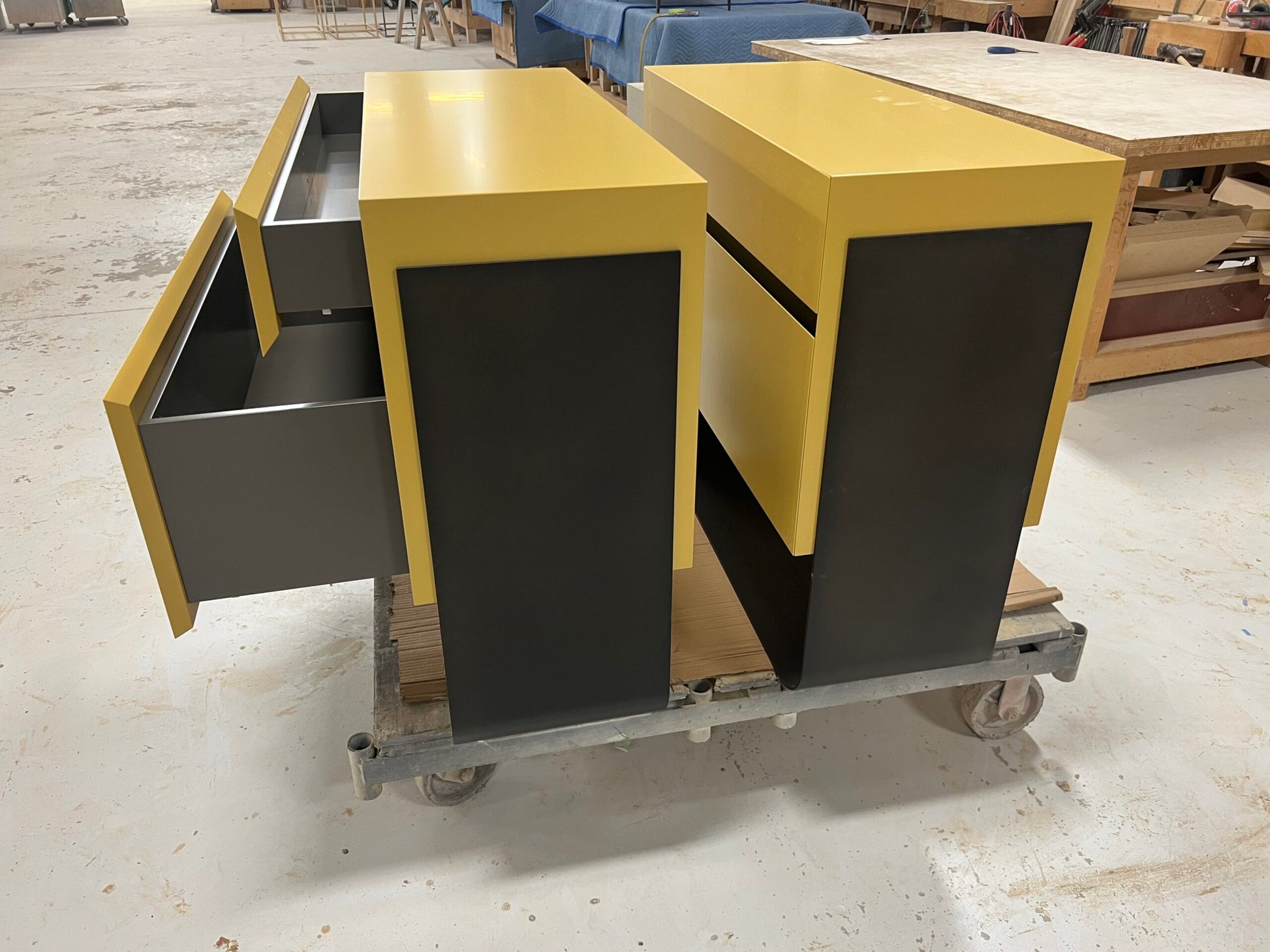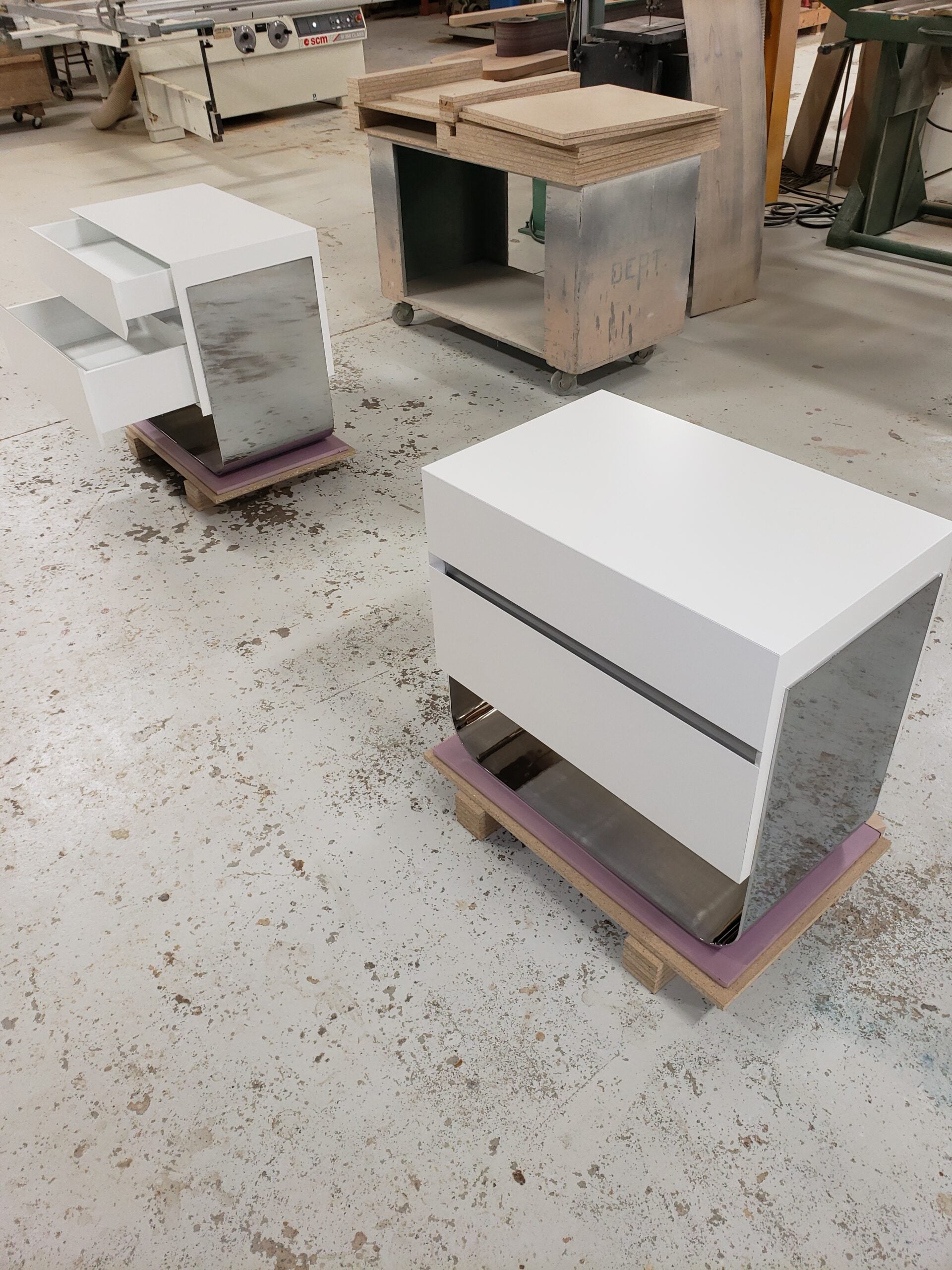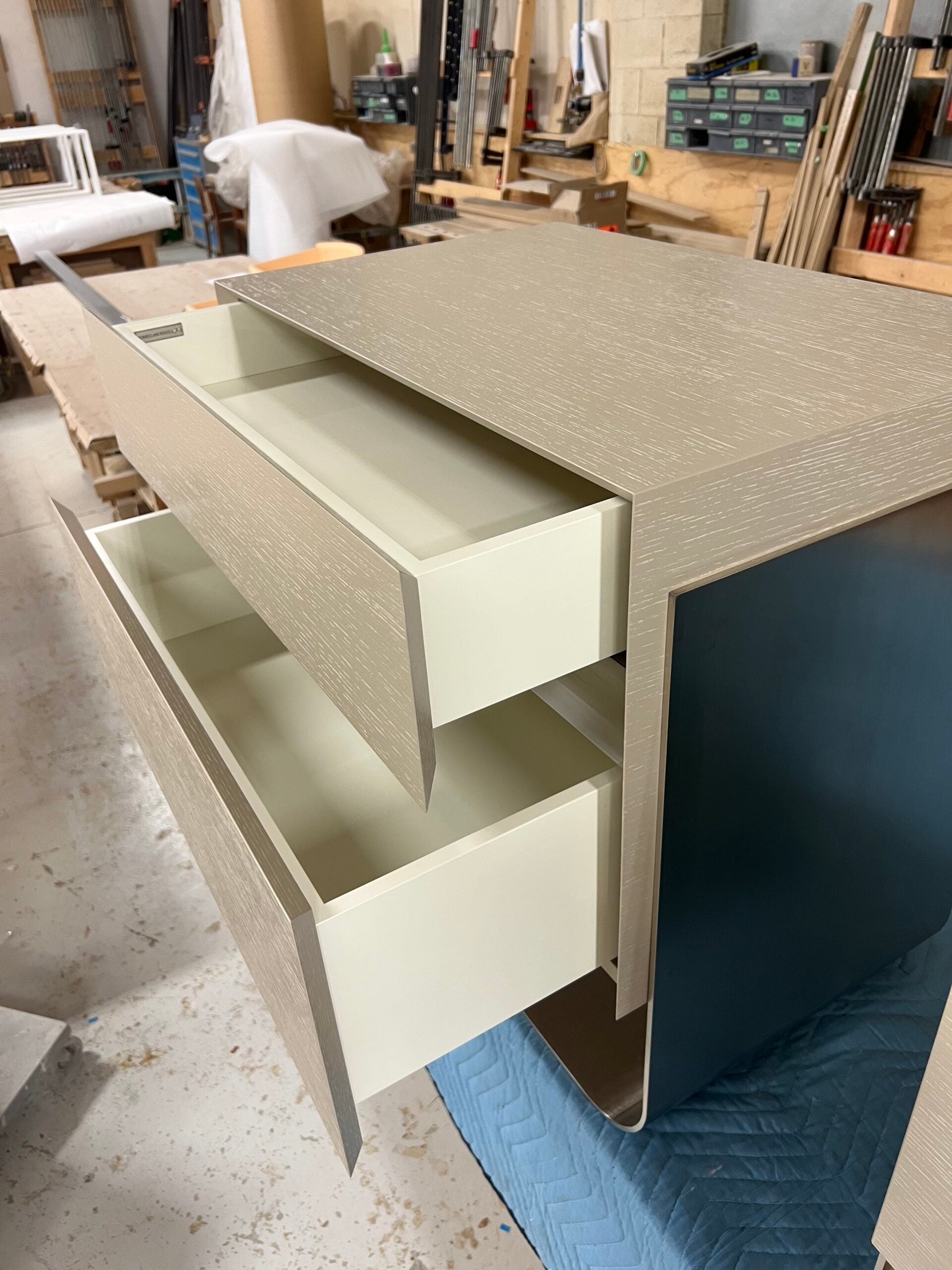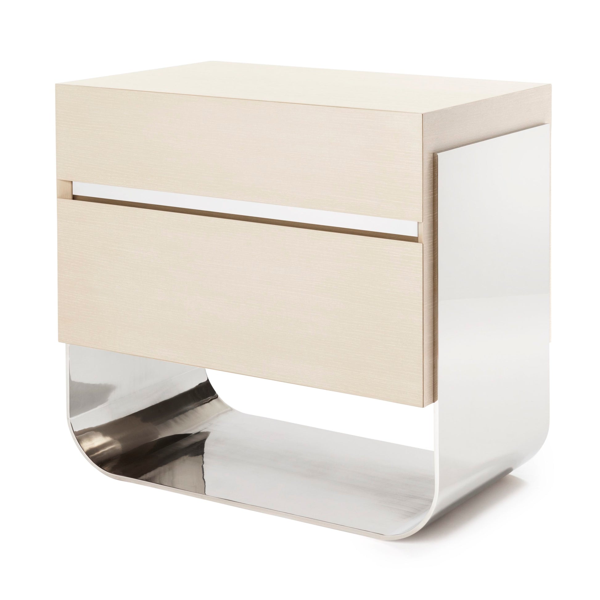 two drawer wood or lacquer cabinet suspended in a rounded steel form base.