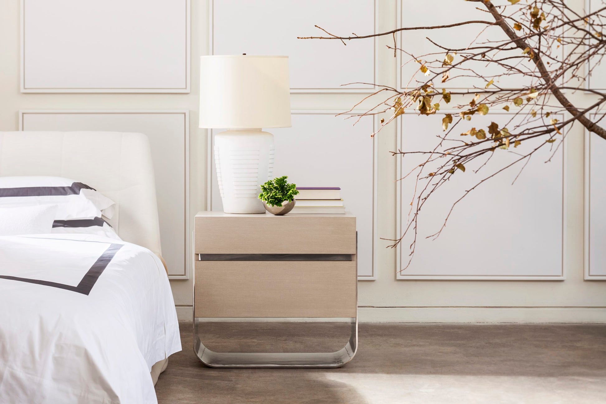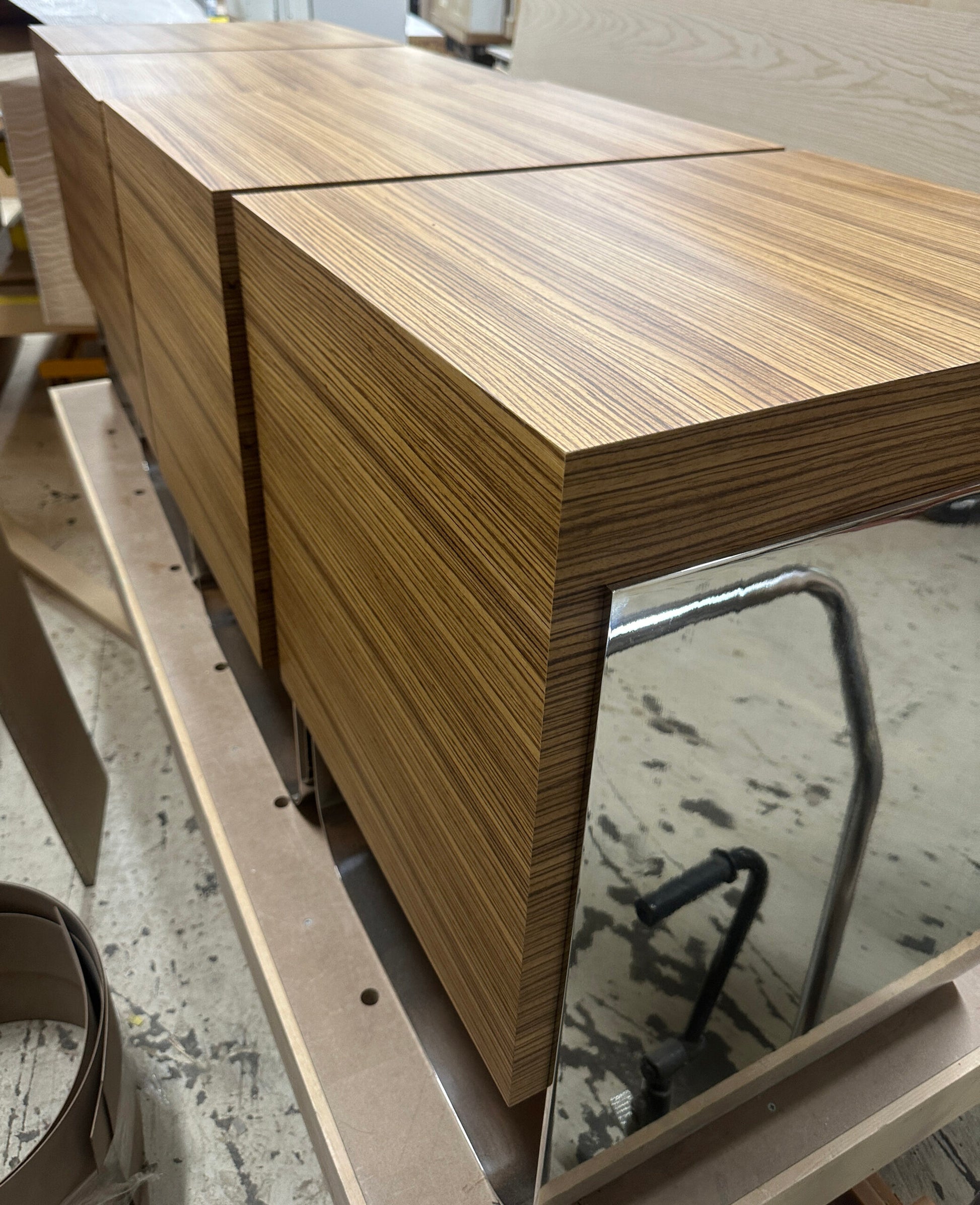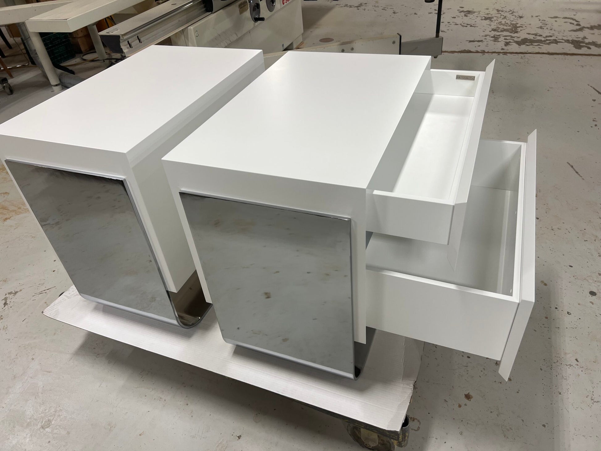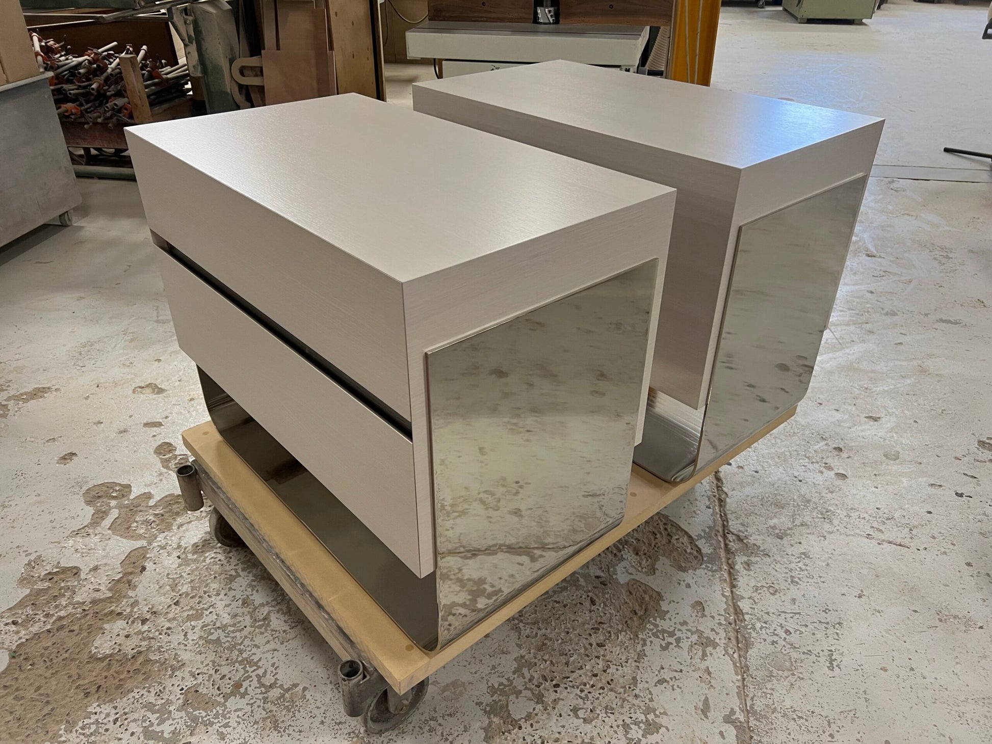 two drawer wood or lacquer cabinet suspended in a rounded steel form base.