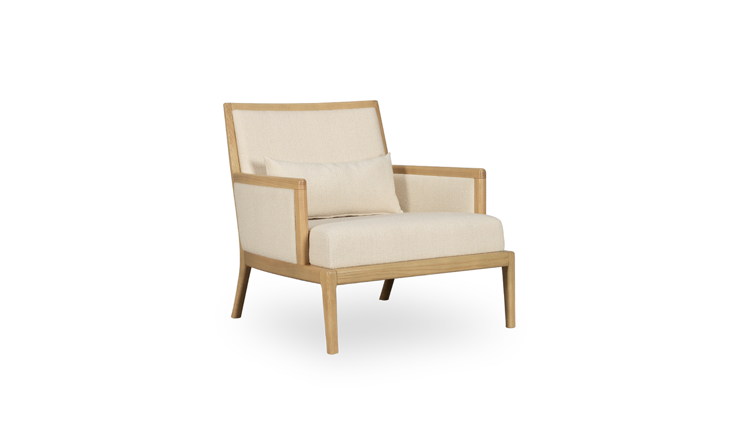Available in with or without armrests, this lounge chair with solid wood structure and legs in standard finishes is available in Cat. I-VI fabrics and leathers (Without arms: 1,6 m/ un. / With arms: 2,5m/un.) with the possibility of client fabric. Also available in sofa version.