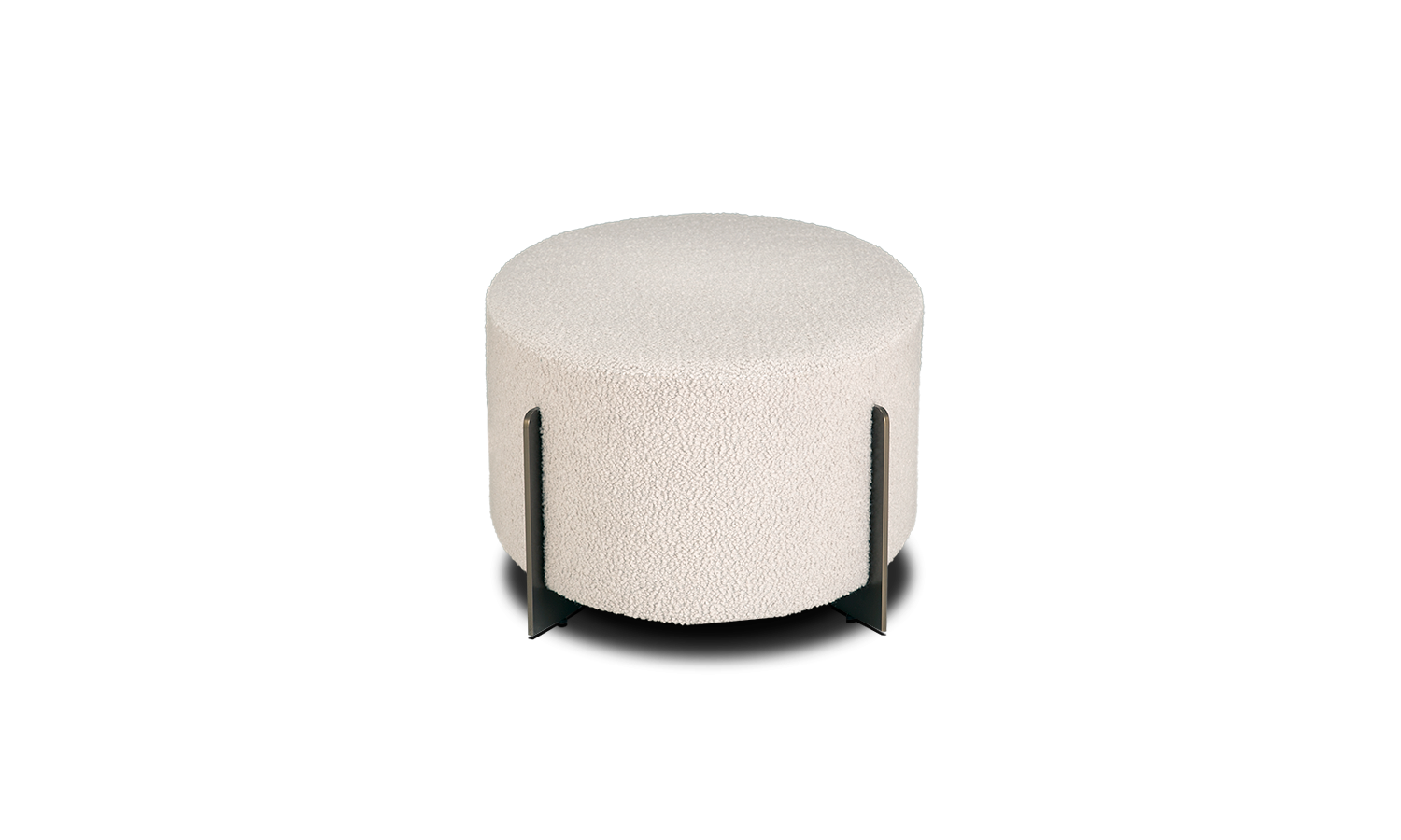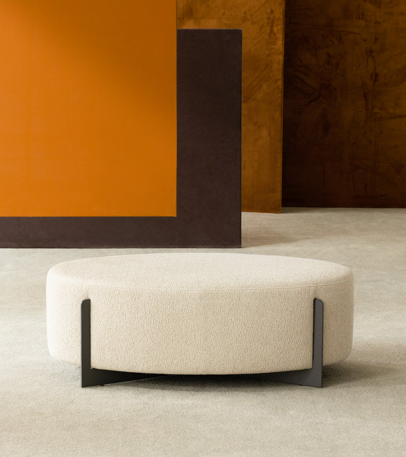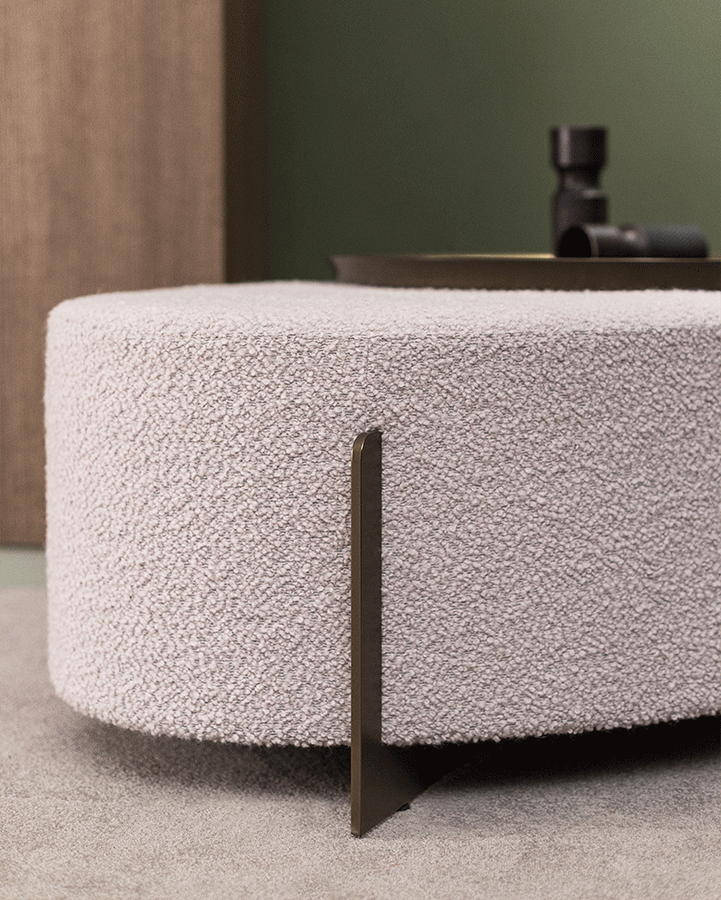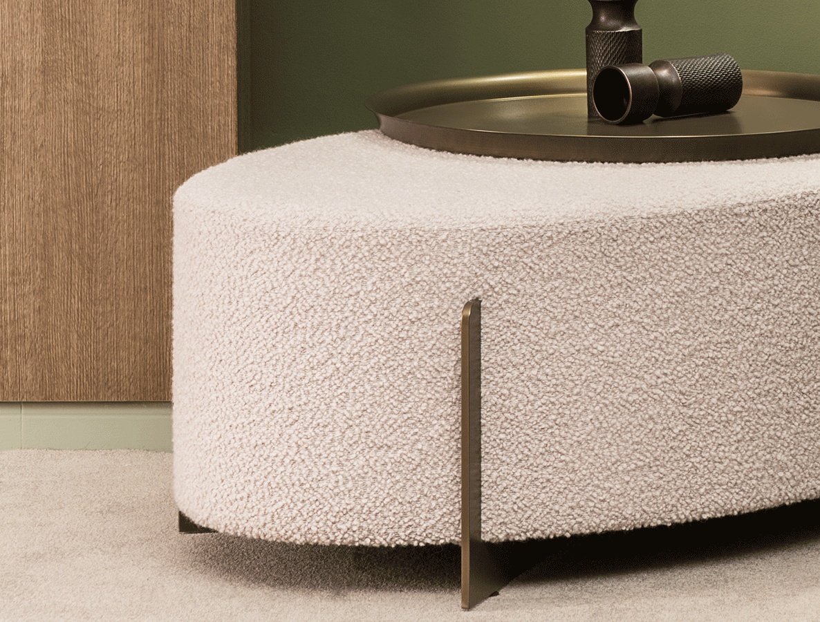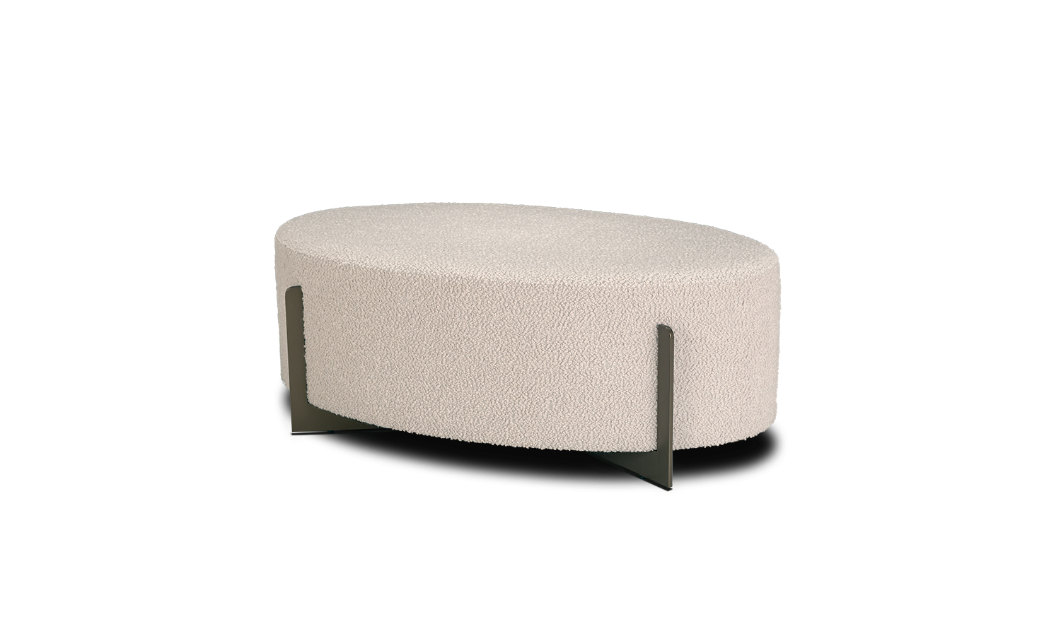 This elegant decorative pouf is available in two sizes, has a solid wood structure and base in enamelled iron. It is available in Cat I-VI fabrics and leathers (S: 1,0 m/un. // L:2,2m / un.) and is possible in customer’s own material.
