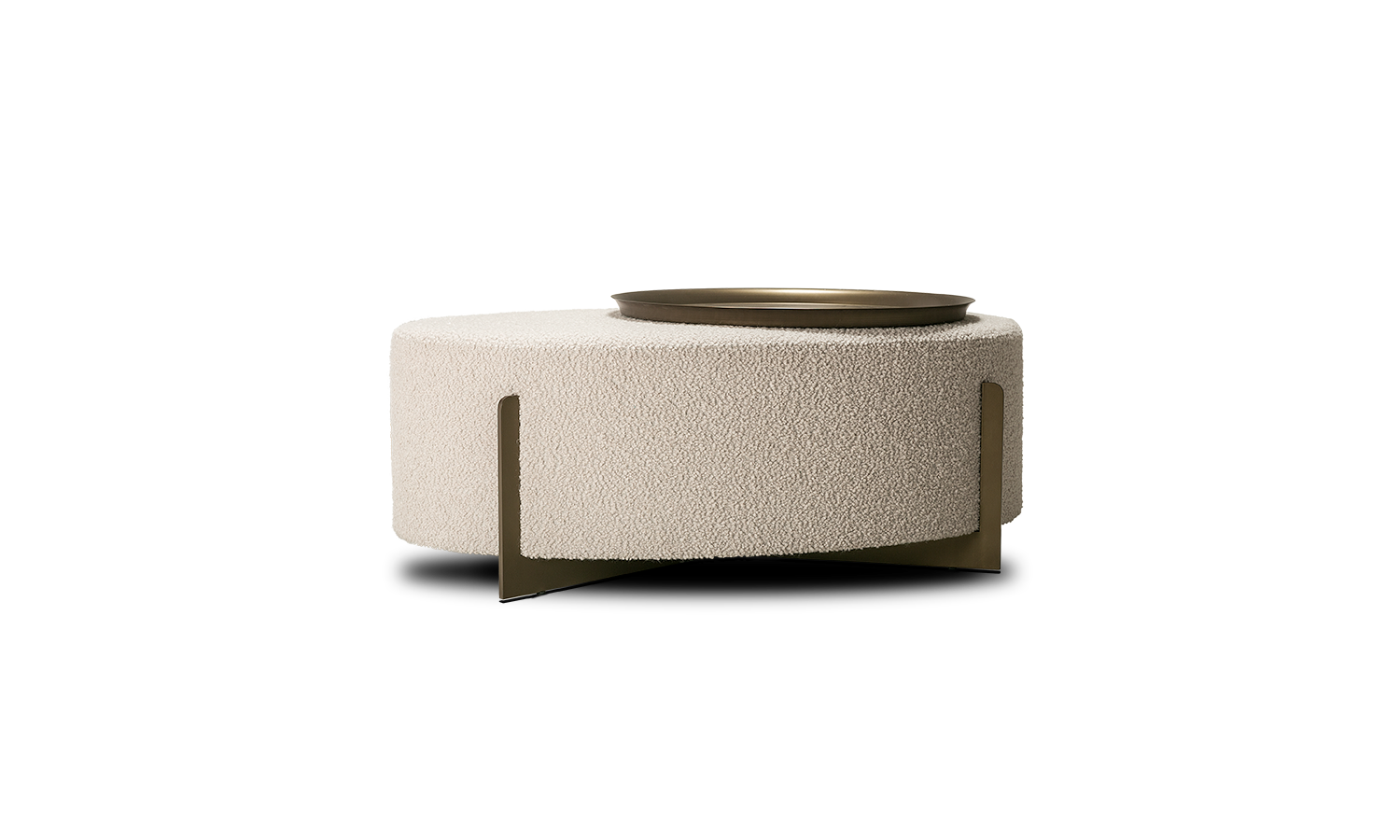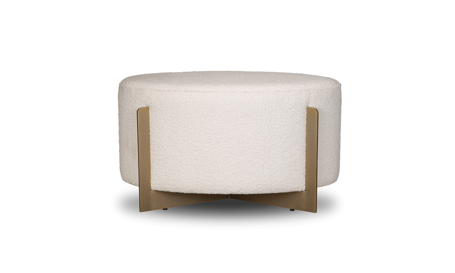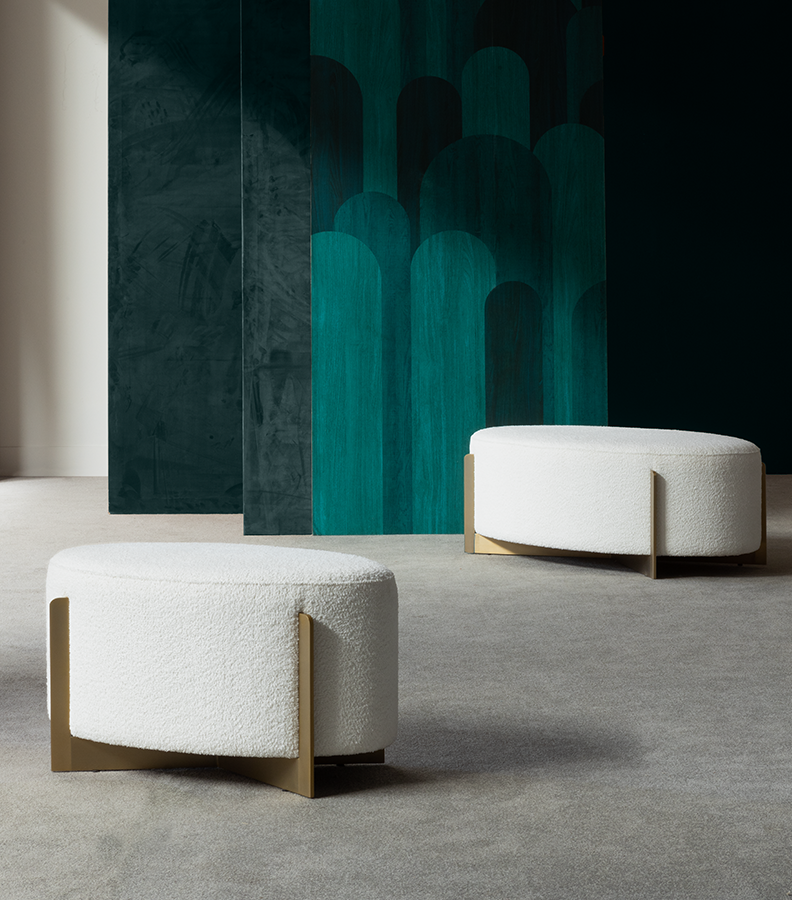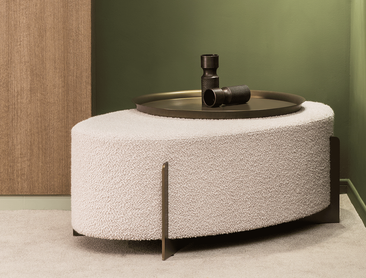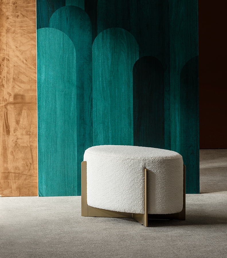 This elegant decorative pouf is available in two sizes, has a solid wood structure and base in enamelled iron. It is available in Cat I-VI fabrics and leathers (S: 1,0 m/un. // L:2,2m / un.) and is possible in customer’s own material.