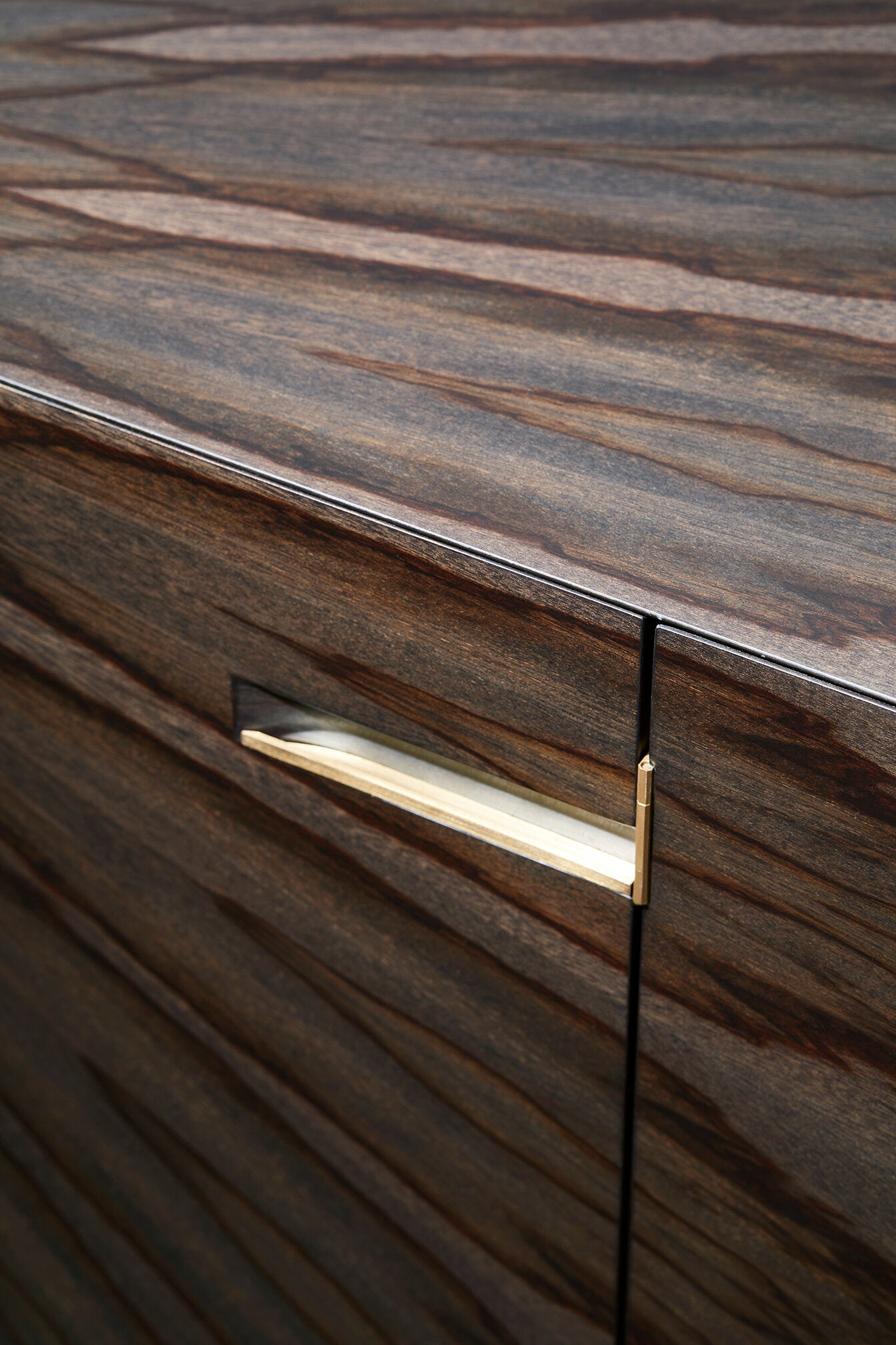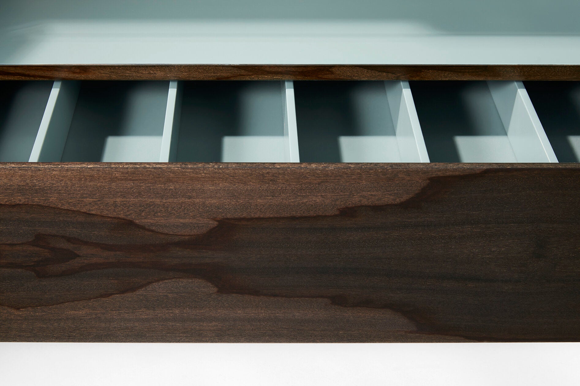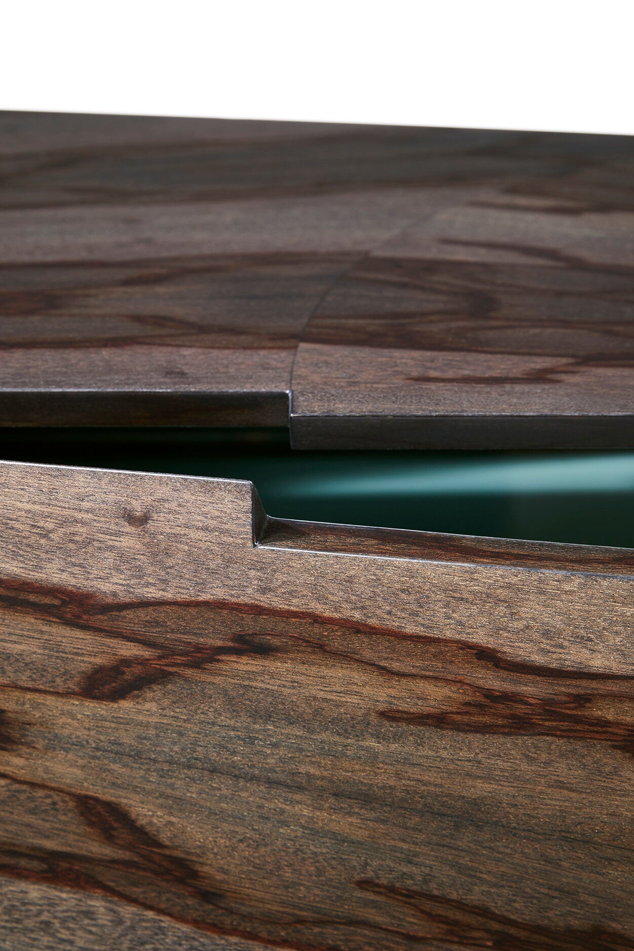 Top in tinted Dogwood 68-2014 with a satin finish, interior in Bleu Orage lacquer, feet and handles in stainless steel with a Bronze Médaille finish.