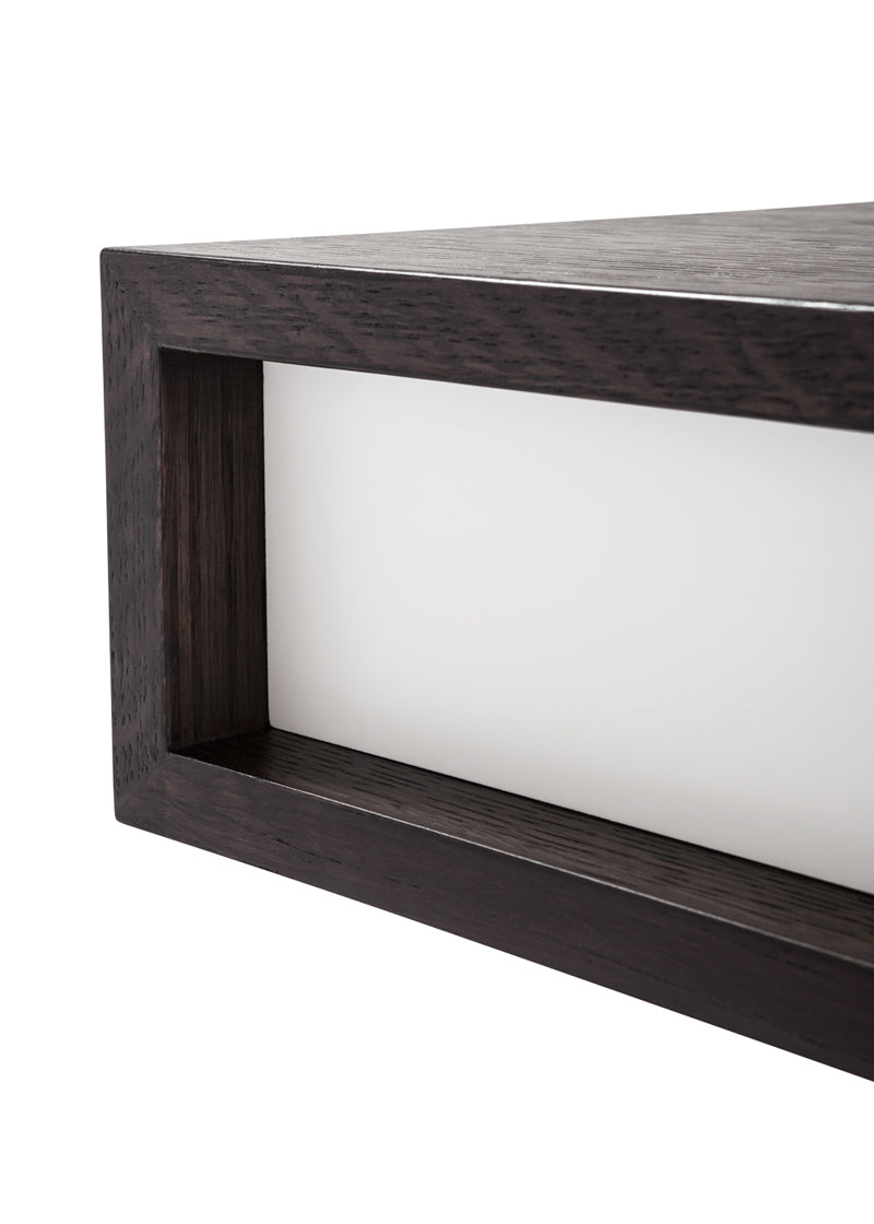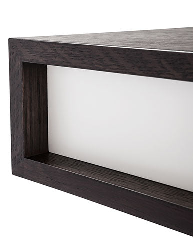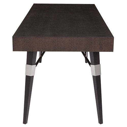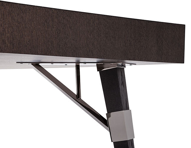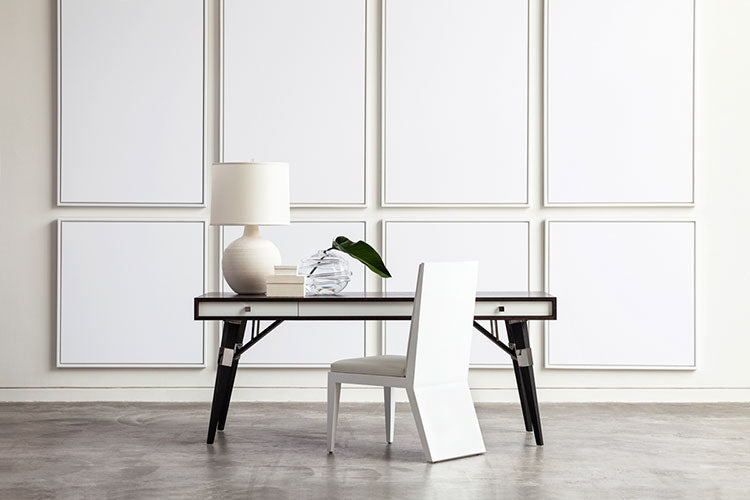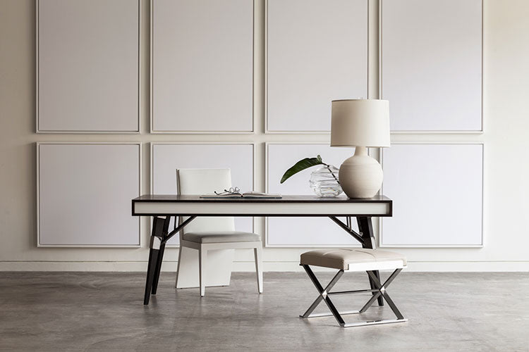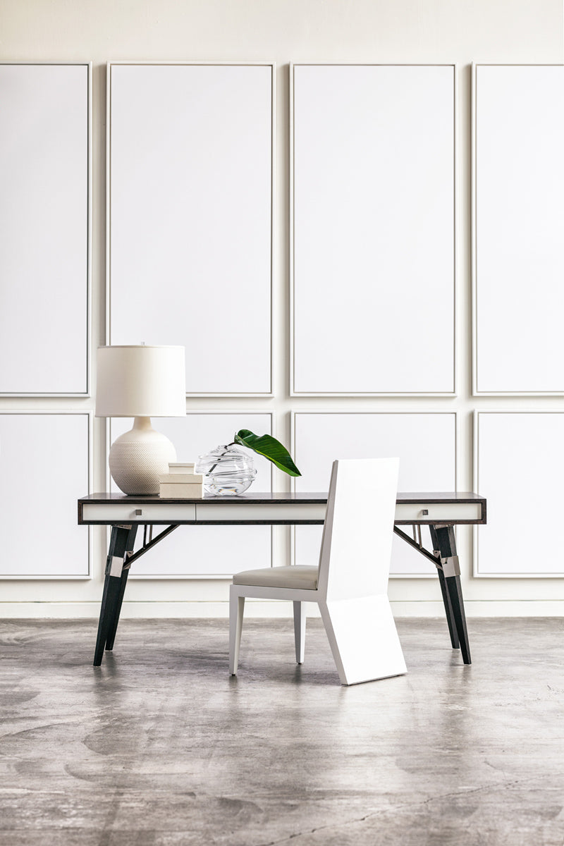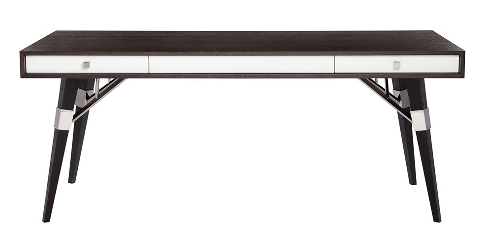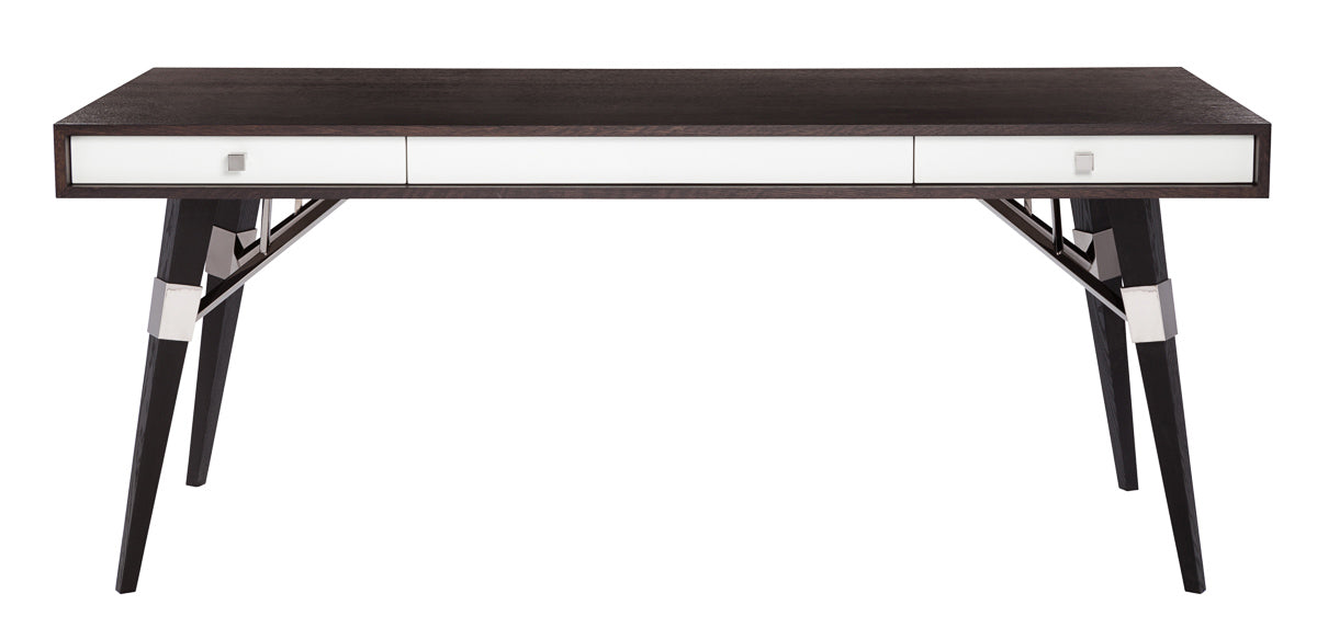 this writing table has a stand-alone pedigree. tapered wood legs featuring unique architectural truss-work holds aloft a waterfall wood top, with inset lacquered apron & pencil drawers.