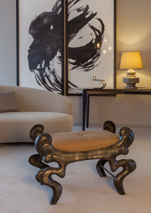 A distinct conversation piece, the contrast and movement in the lines and materials of the sculpted Barocco stool fit with either contemporary or more traditional decors.