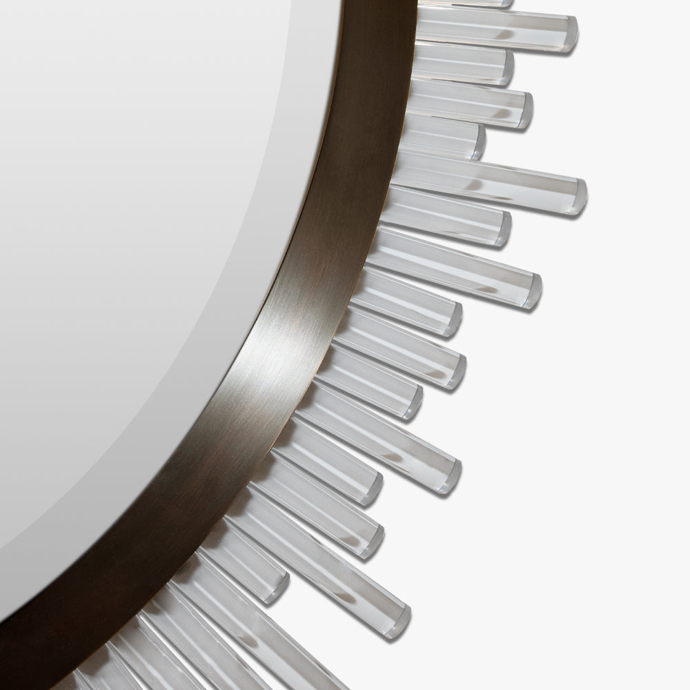 Comprised of sporadic or straight Lucite rods, this mirror is another contemporary addition to the Belgrave Square family from the Mayfair Collection. This ornate mirror can be lit by a long LED strip positioned above the Lucite rods to create a beautifully warm lighting effect which reflects off the distressed glass.