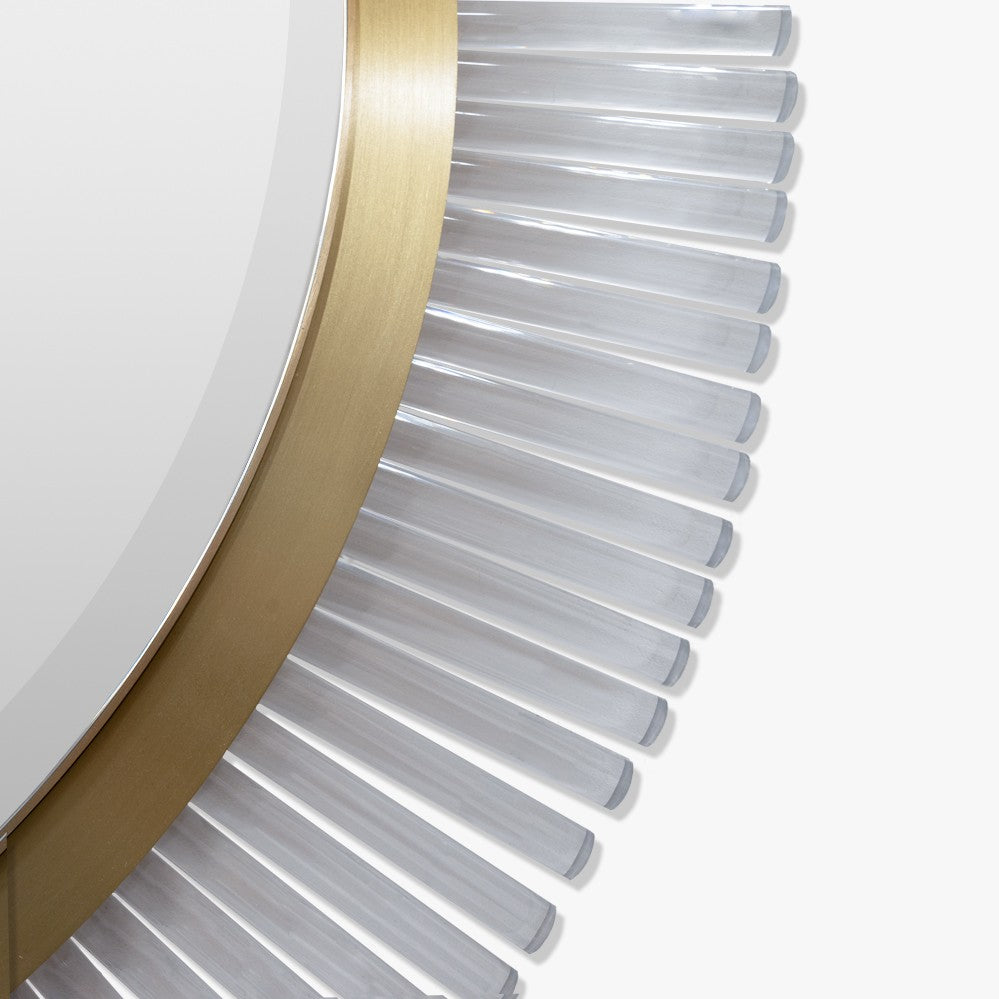 Comprised of sporadic or straight Lucite rods, this mirror is another contemporary addition to the Belgrave Square family from the Mayfair Collection. This ornate mirror can be lit by a long LED strip positioned above the Lucite rods to create a beautifully warm lighting effect which reflects off the distressed glass.