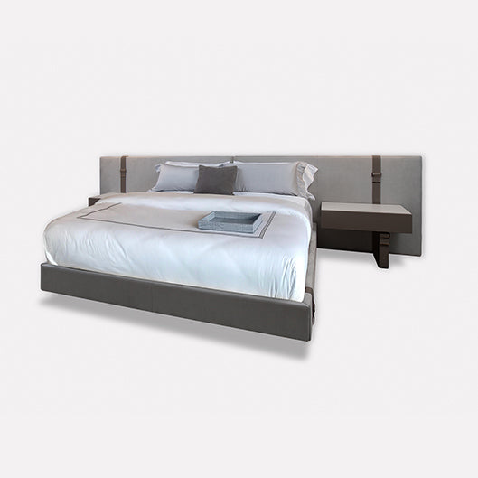 From the BOND Collection – introducing the BOND IMPERIAL bed. This fashionable highlight of your bedroom invites you to rest and lets your mind fantasize. The IMPERIAL edition features an extra-wide headboard with integrated nightstands to achieve a hotel-like look & feel and a frame elevated on belts that wrap around as legs and design elements. The nightstands can be configured with our “touch me” lights for ambiance lighting and our digital booster options like an integrated wireless phone charger or USB connections.