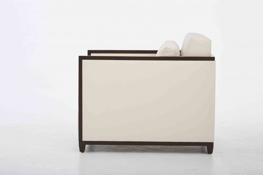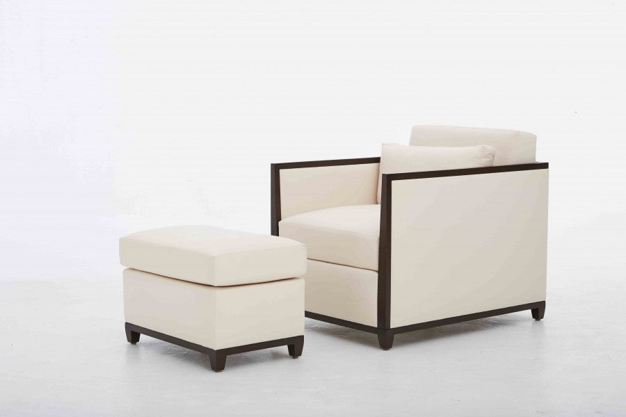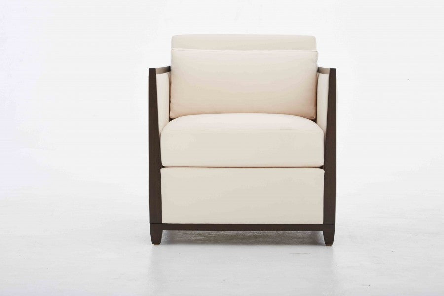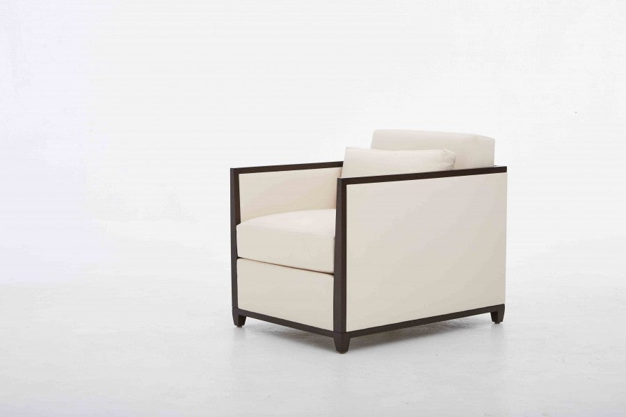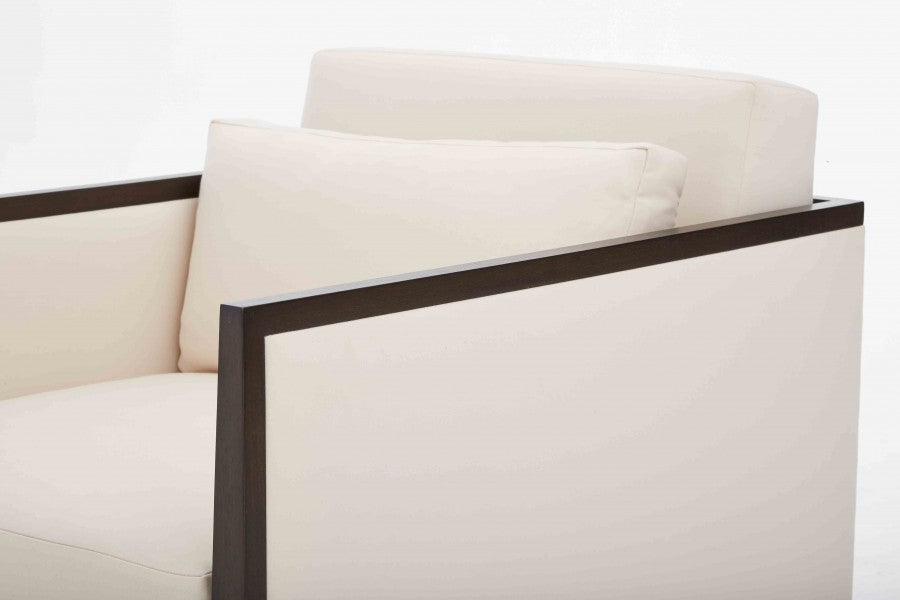 Loose seat and back cushion, boxed with plain seam, 50/50 down and feather fill. Walnut apron and legs in walnut finishes.