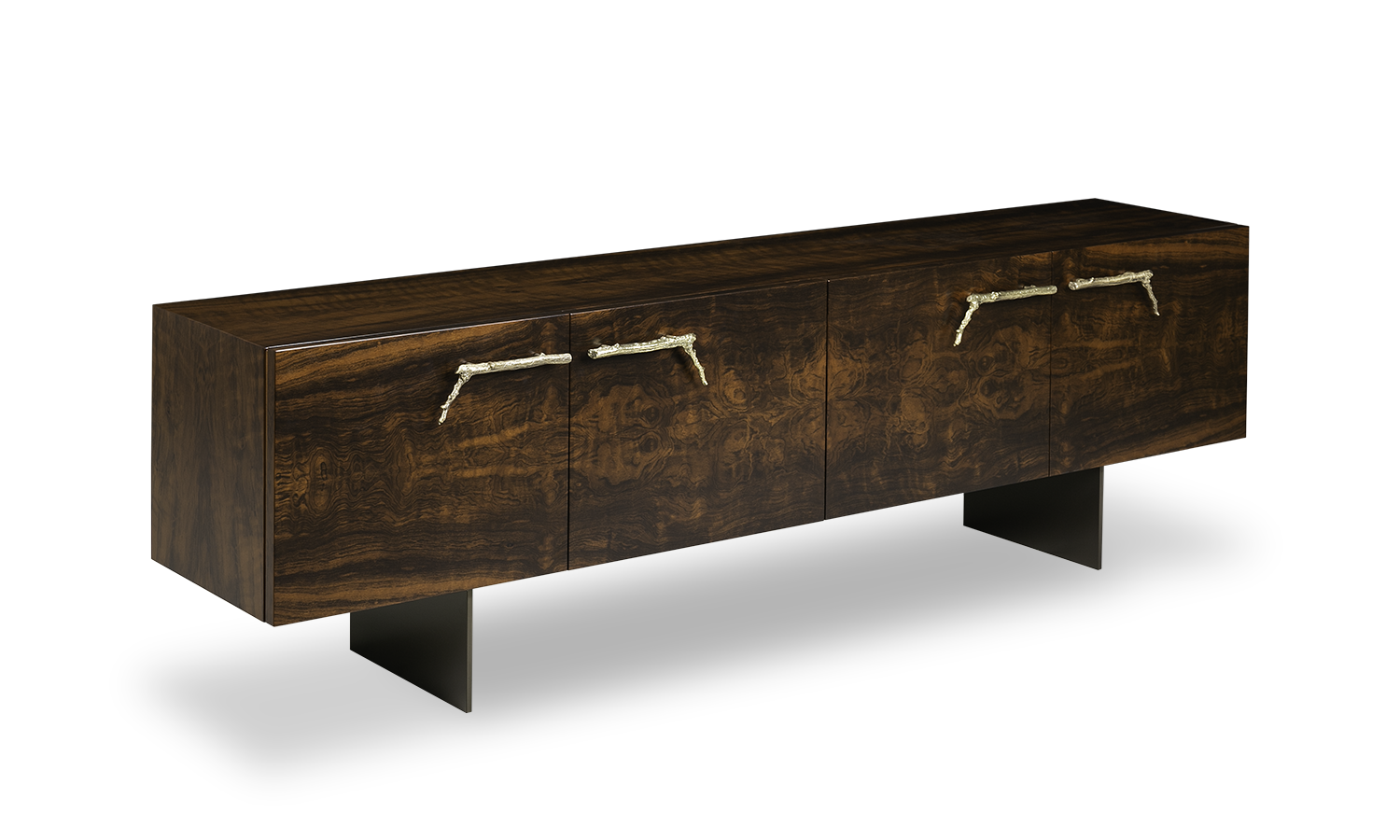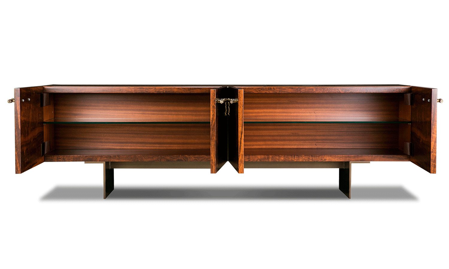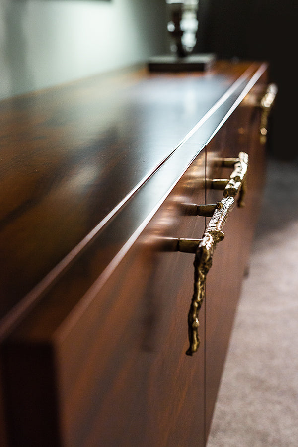 This storage cabinet features imbuia veneers and sculpted cast brass handles. Other dimensions and finishes are available on request.