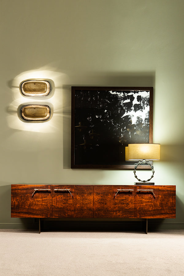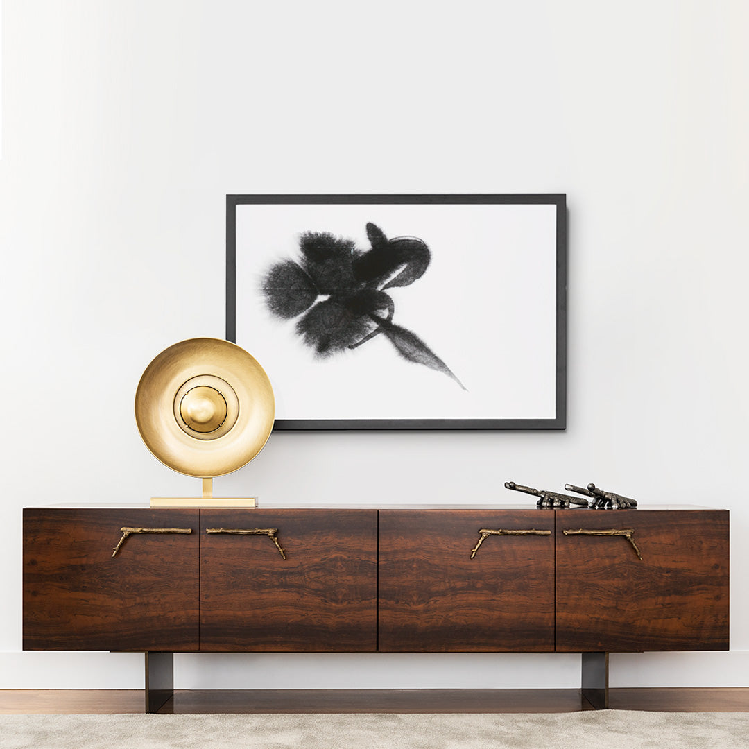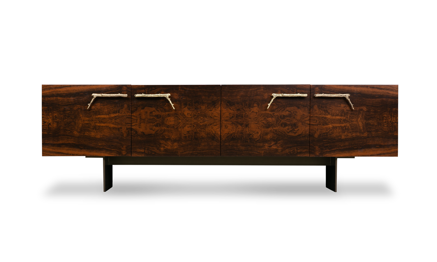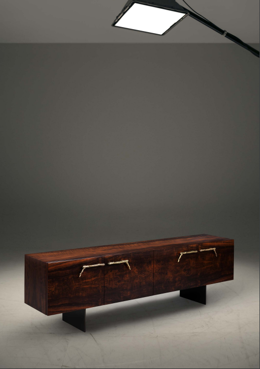 This storage cabinet features imbuia veneers and sculpted cast brass handles. Other dimensions and finishes are available on request.