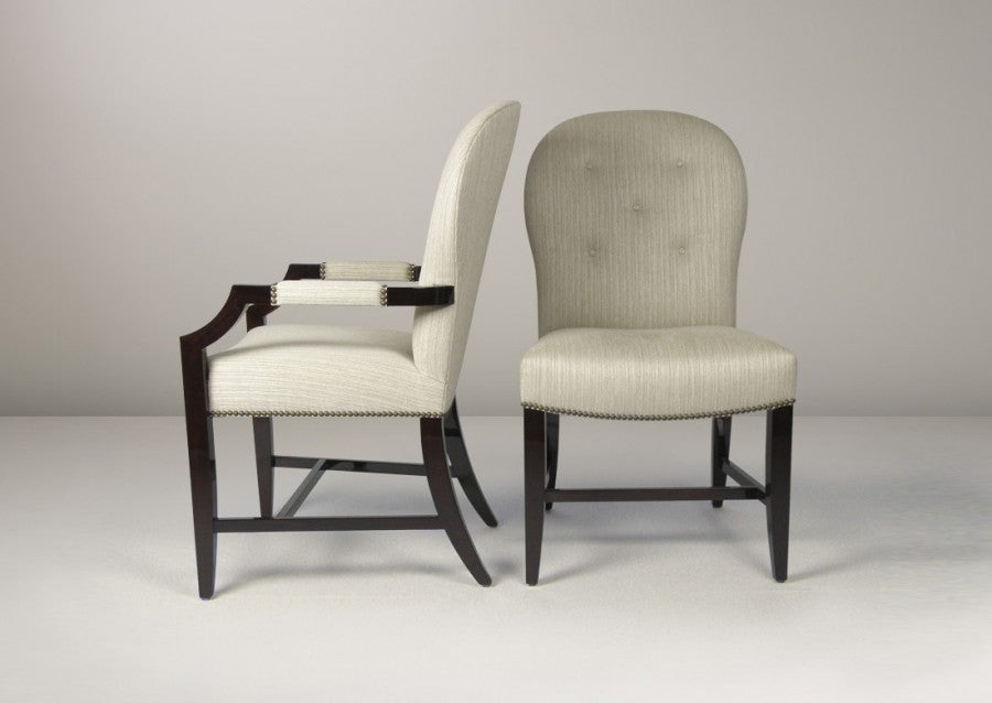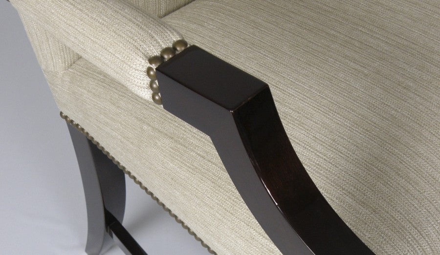 Tight scooped seat and buttoned inside back. Single row of nail head trim at seat base. Wood legs and stretchers in standard mahogany finishes. COL – Rosette optional in place of buttons.
