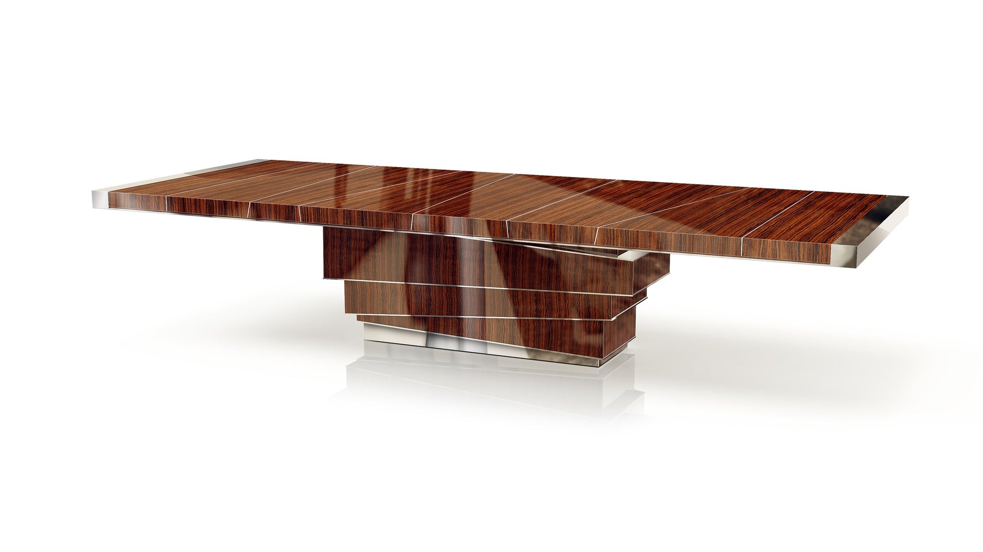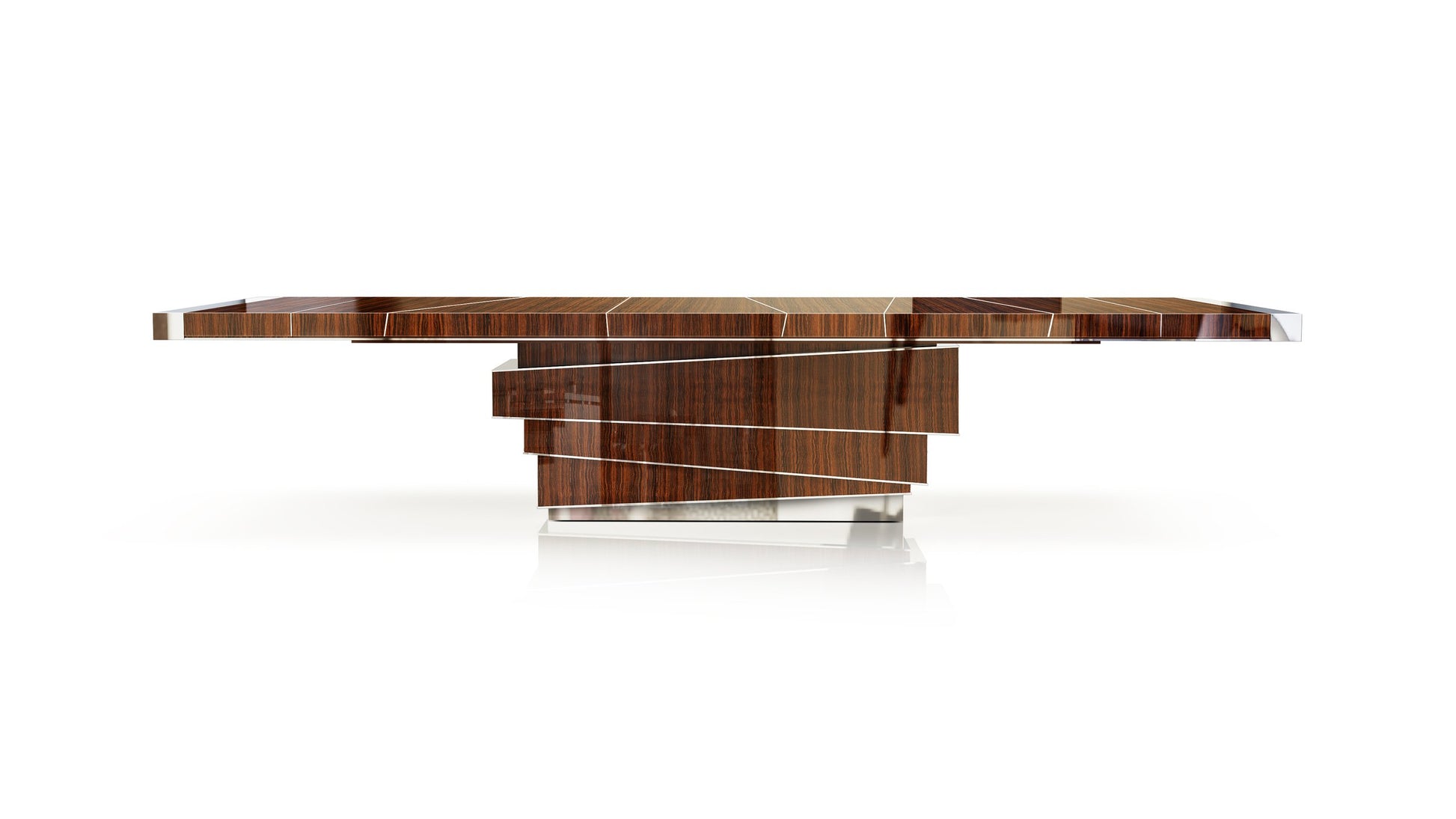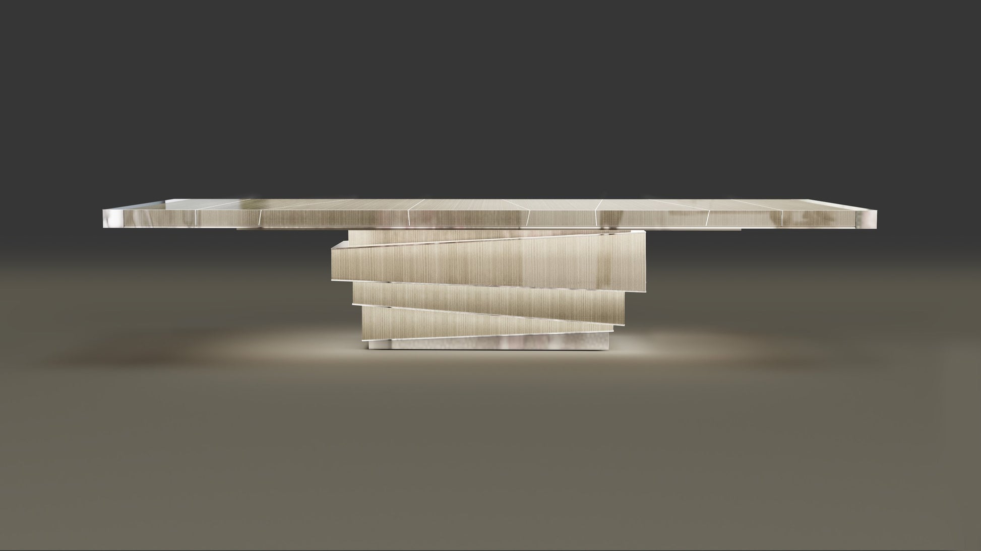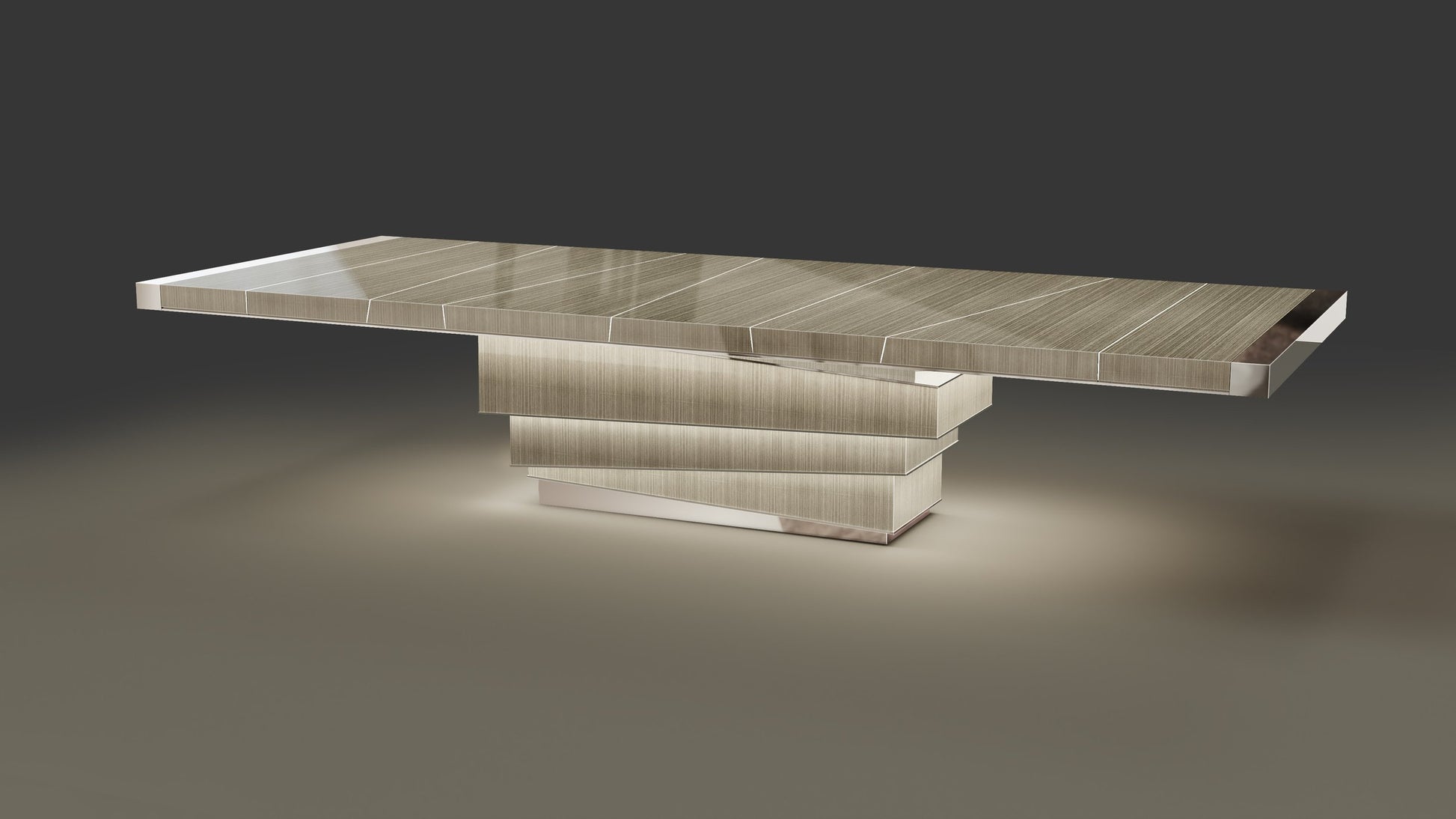 The Canyon Dining Table’s tiered base is reminiscent of the stratification of rock, developed over millions of years. This motif is carried over into the shifting patterning of the inset Stainless Steel of the table top.