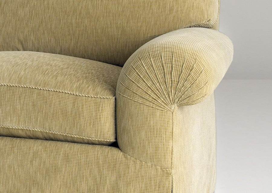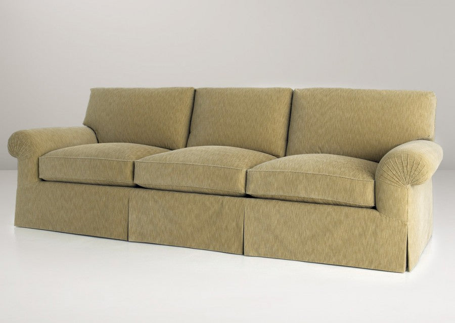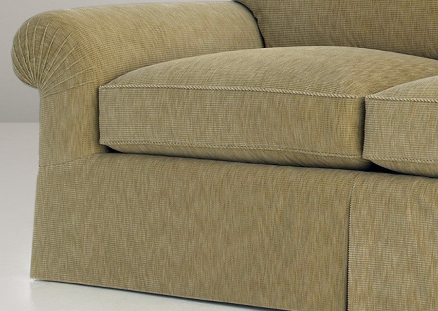 Loose seat cushions, boxed with self welt, 50/50 down and feather fill. Loose back cushions, knife edge with self welt, 50/50 down and feather fill. Dressmaker skirt from deck with pleats at cushion divisions, corners and back. Standard carpet allowance is ¼”.