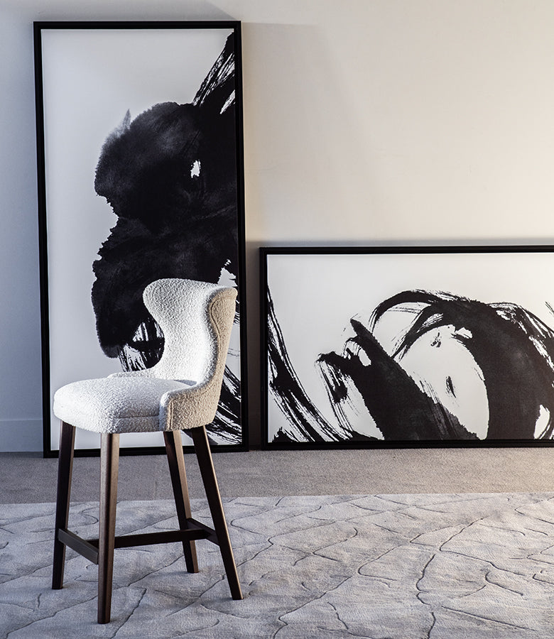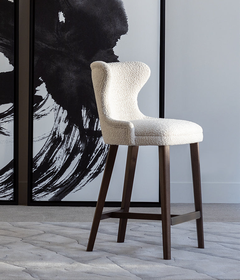 This barstool features a solid wood structure and legs in standard finishes. It is possible in Cat. I-VI fabrics and leathers and also in customer’s own material. Variable seat heights are available with or without arms.