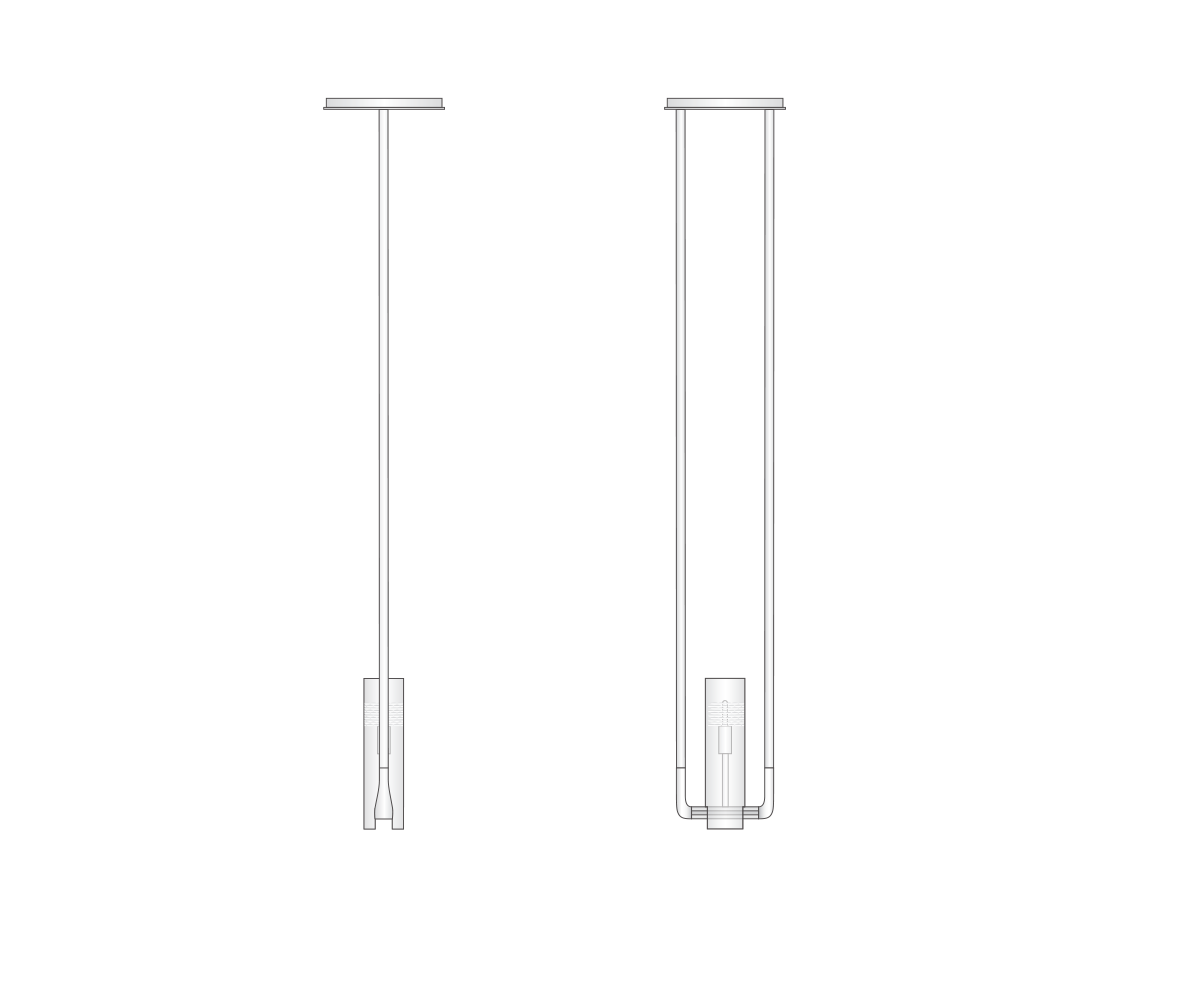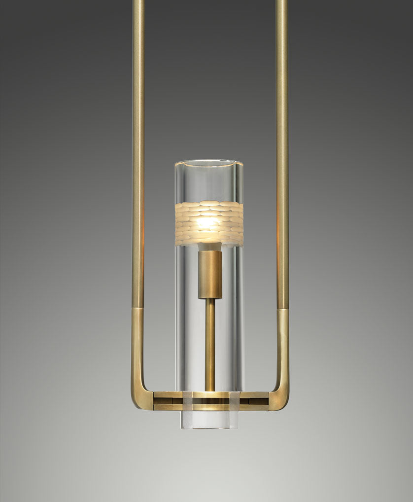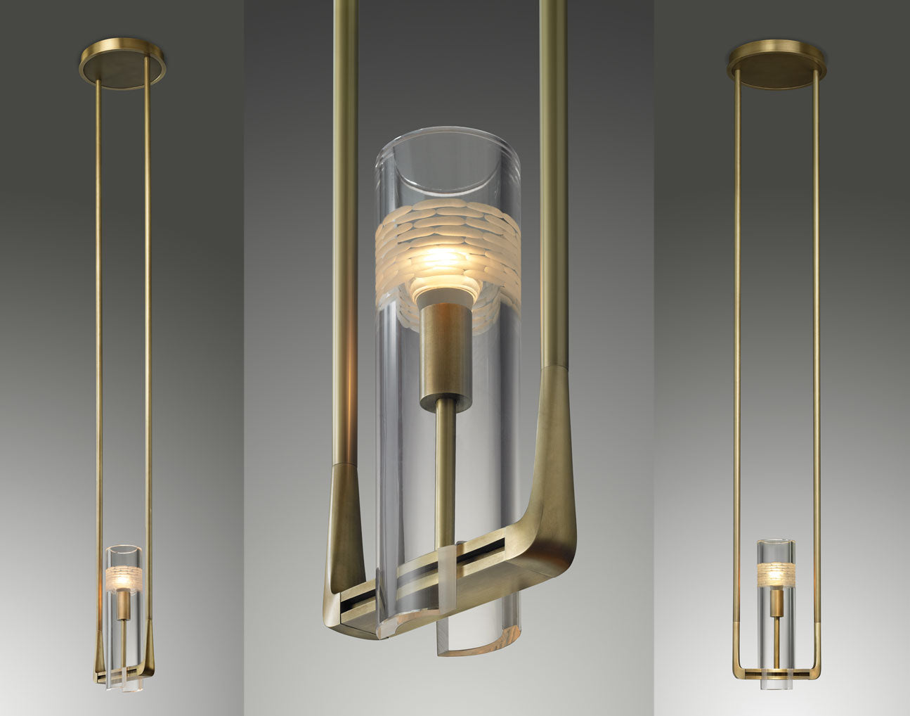 The Chamont Lavalier is machined by hand from solid brass. The round rods of the two arms transform seamlessly into its square spine at each corner. A lead crystal cylinder, with hand carved details, sits along the spine.