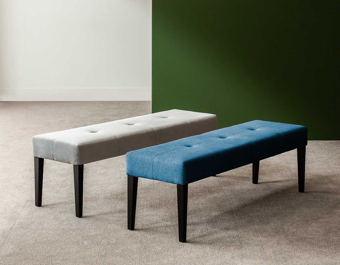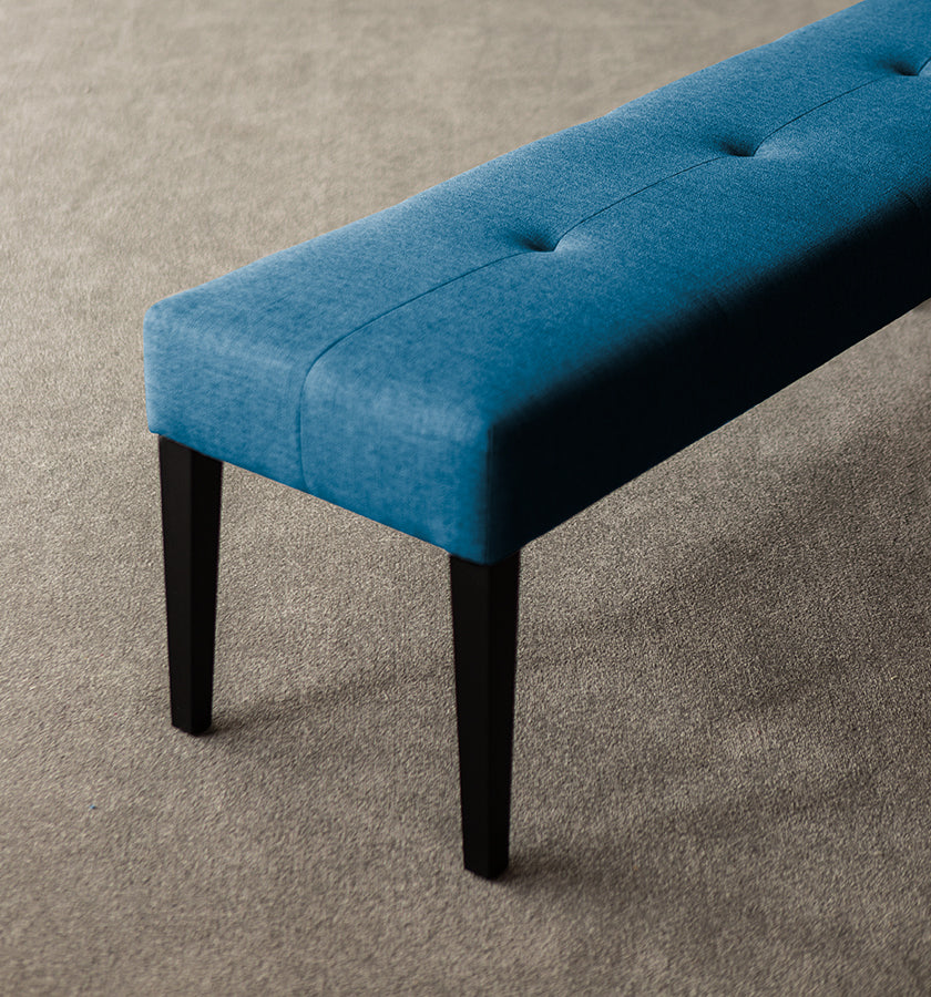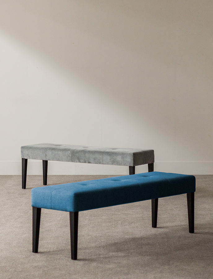This tufted bench has a solid wood structure and legs in standard finishes. It is possible in Cat. I-VI fabrics and leathers (1,5m / un.) and also in customer’s own material.