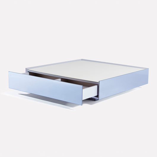 Inspired by a royal chest this clean and representative coffee table bears a secret. A hidden drawer adds to its simplistic yet elegant design a functional component. To personalize it to taste and functionality, the finishes of sides and top can be selected in any material from mirror, leather, wood and lacquer finishes which makes the COFRE a very versatile contemporary coffee table.
