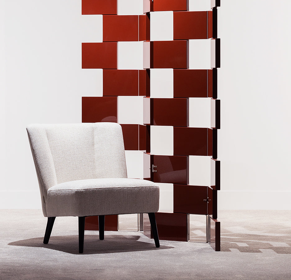 Rather coquette, this lounge chair with solid wood structure and legs in standard finishes is available in Cat. I-VI fabrics and leathers (2,0 m / un.) with the possibility of client fabric.