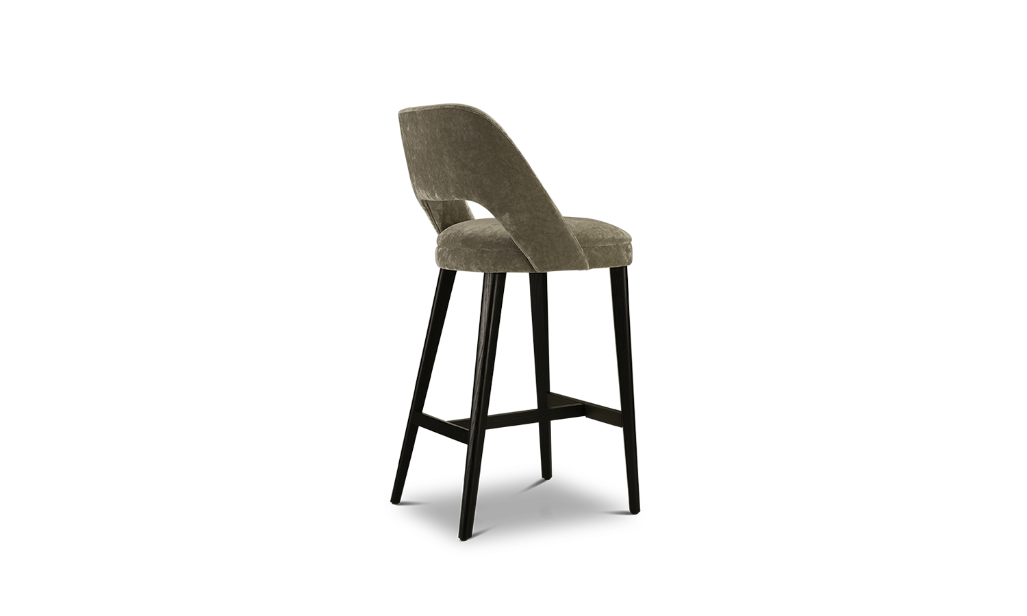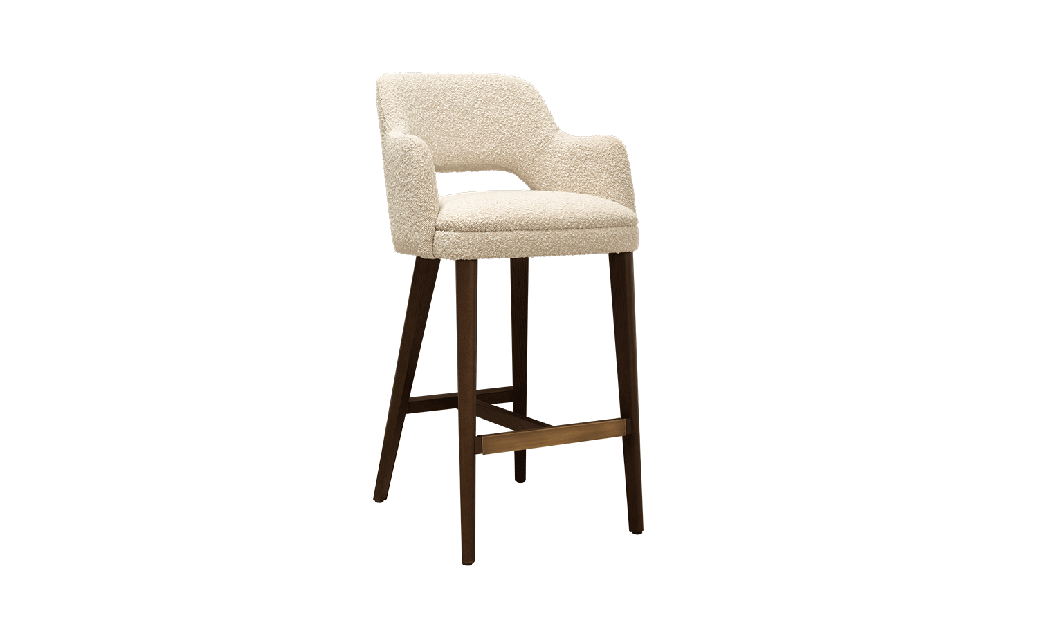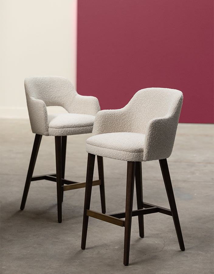 This barstool features a solid wood structure and legs in standard finishes. It is possible in Cat. I-VI fabrics and leathers and also in customer’s own material. Variable seat heights are available with or without arms.