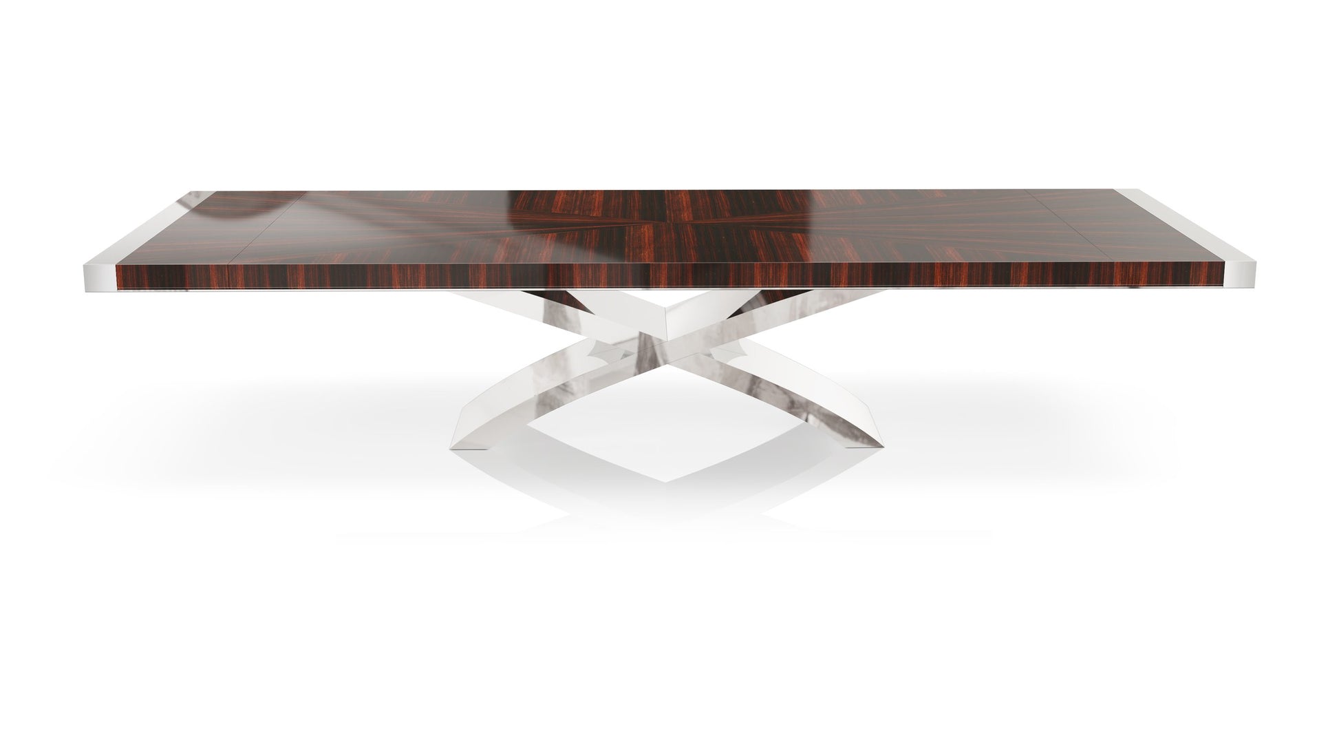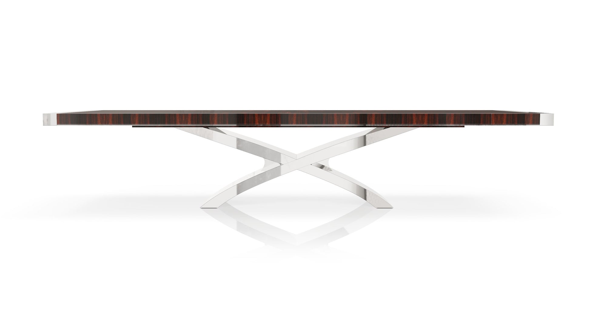With a criss cross base and a geometric patterning on the table top, the Crossroads Dining Table is a pleasing combination of polished Stainless Steel with a Macassar Ebony top.