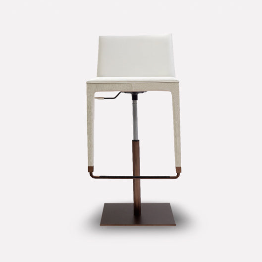 This adjustable bar chair of the CUBÉ collection exudes luxury craftsmanship. It captivates the attention with its modern lines combined with noble metal accents at its top and feet and the posh upholstery with impeccable stitching. The double cushioning on the seat adds to the comfort level while its straight shape and unobstructed silhouette make it a timeless piece that elevates your bar or counter.
