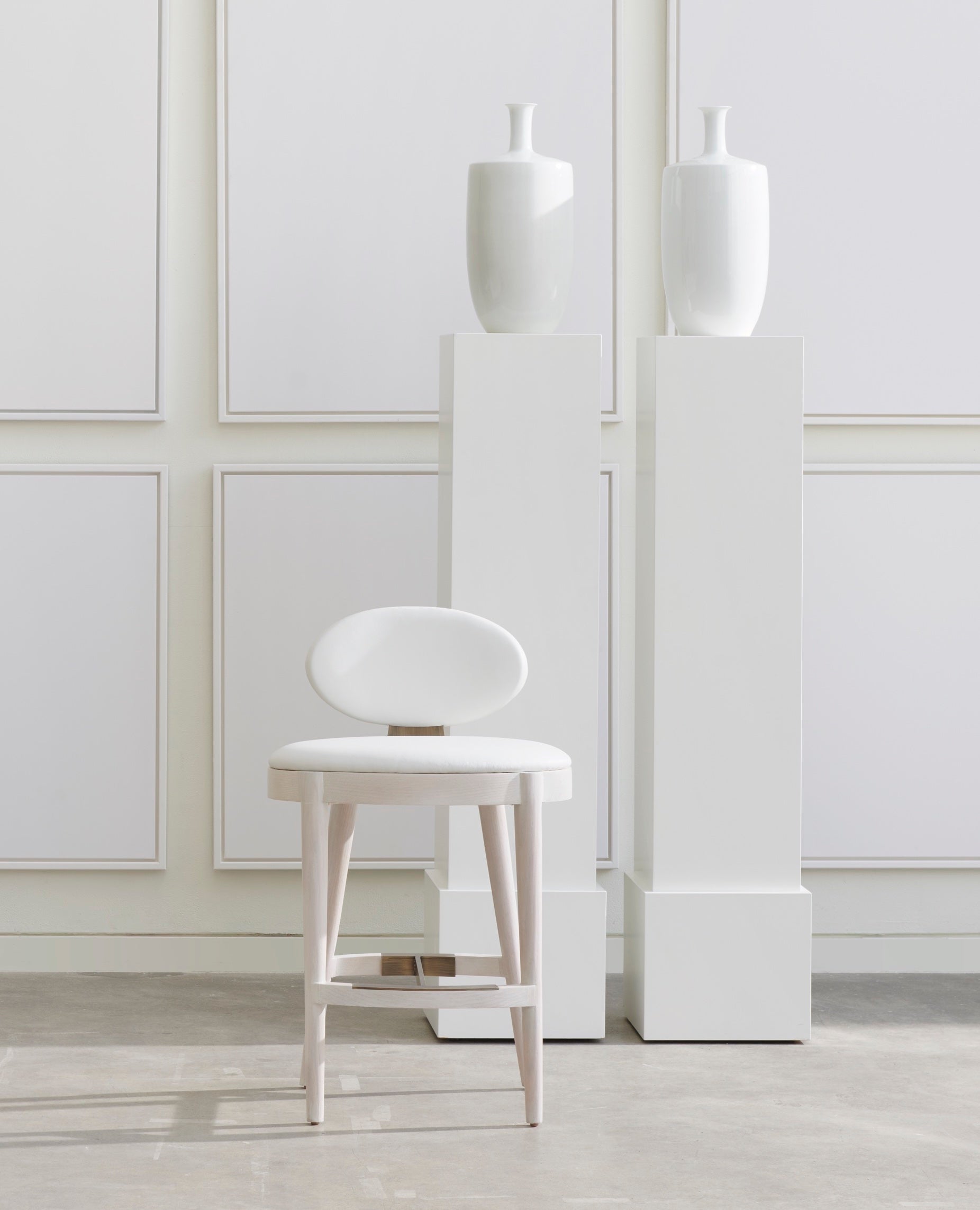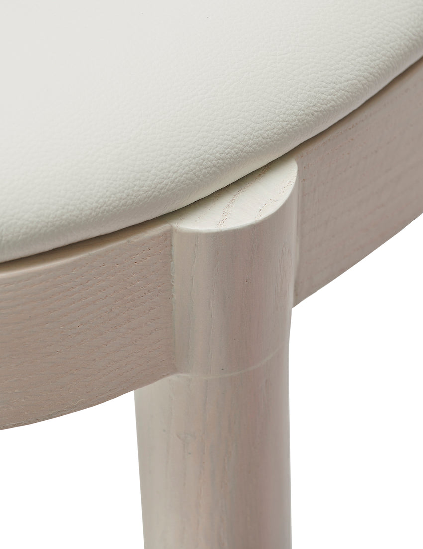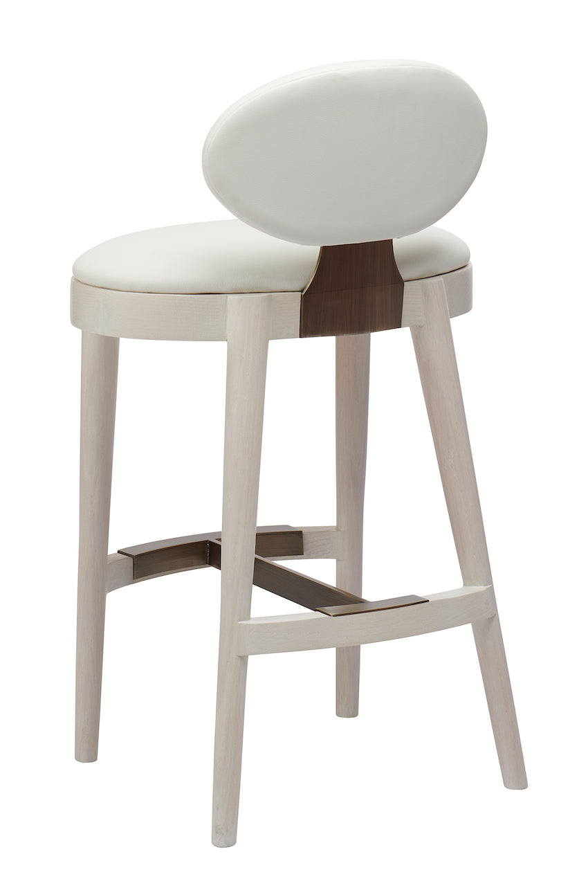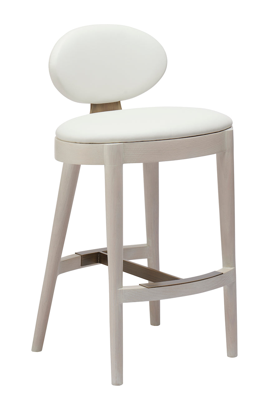 curvaceous oval wood framed stool with upholstered seat and backrest, turned round wood legs and a steel stretcher and back stem support detail.