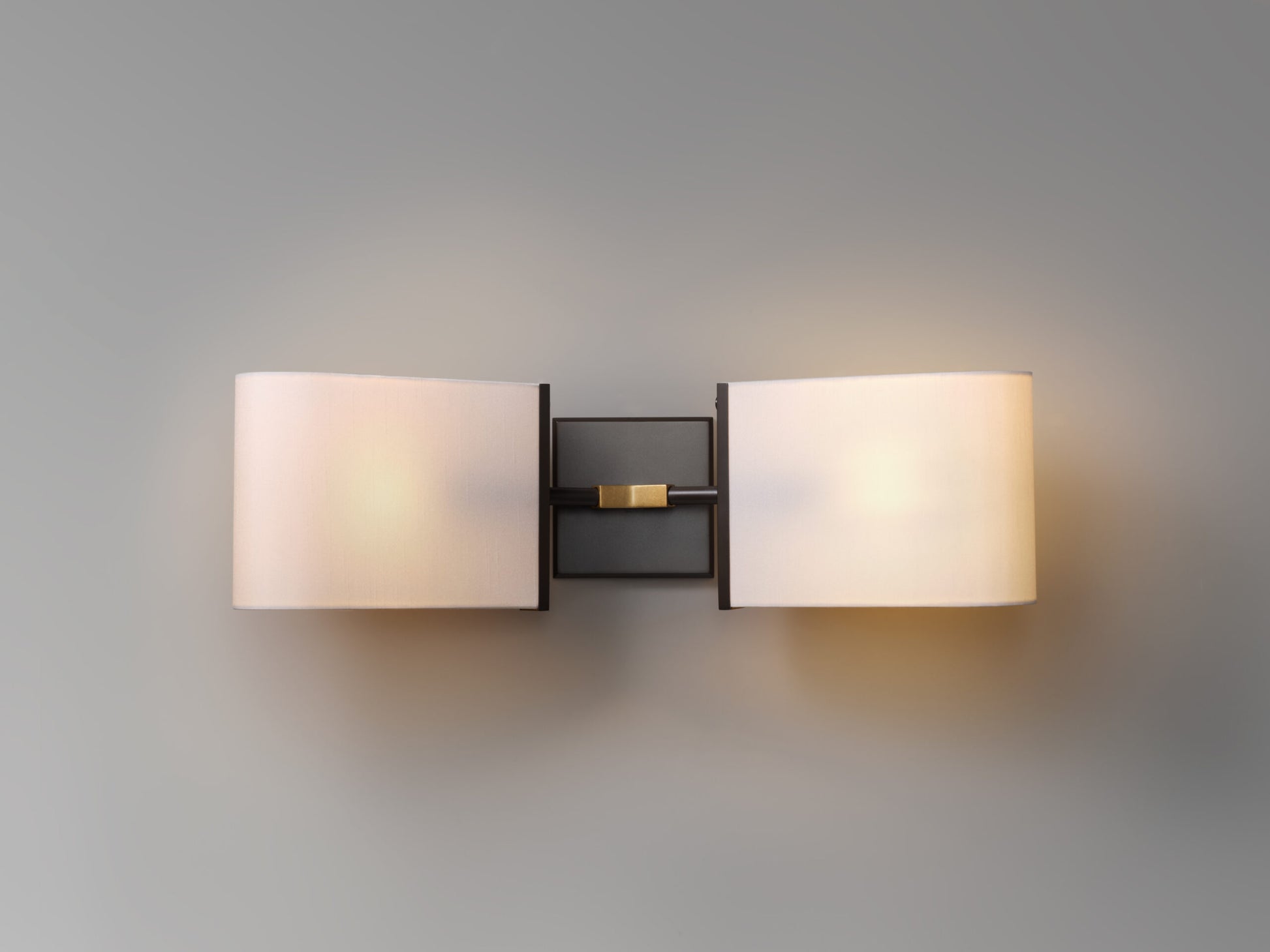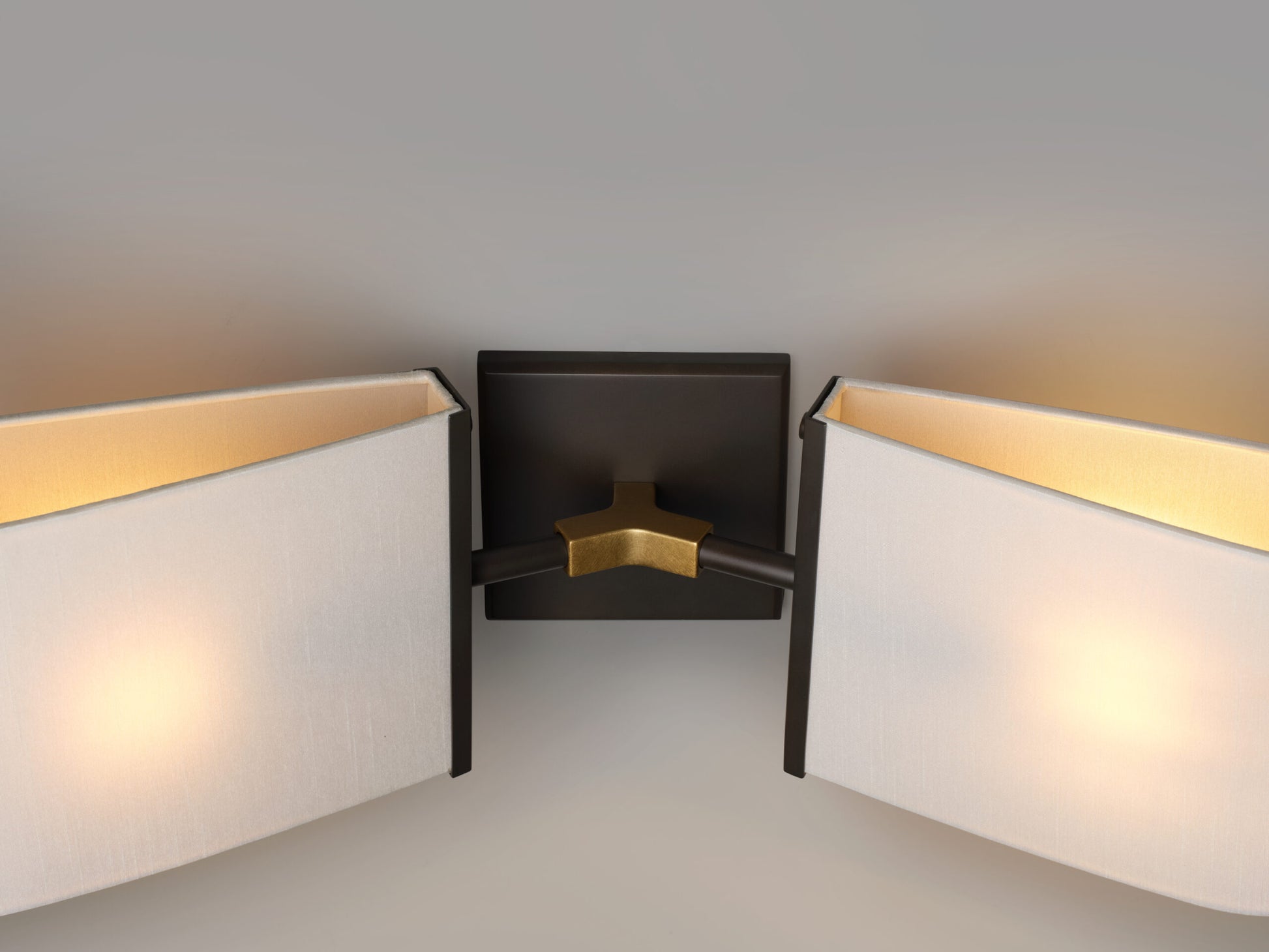 The Dessay Double Sconce is machined from solid brass. All parts are hand polished and patina’d. The shades are made from ivory silk.