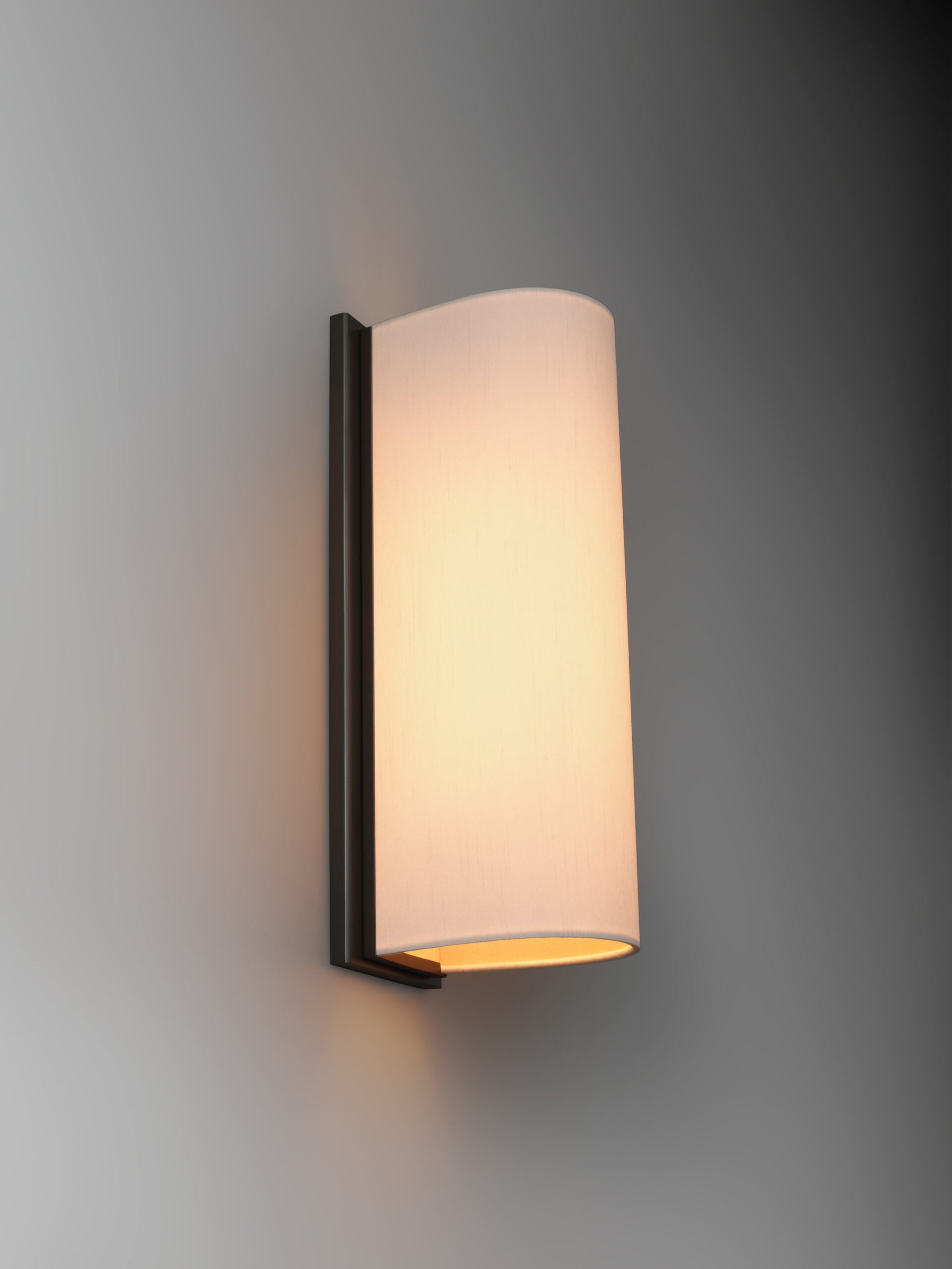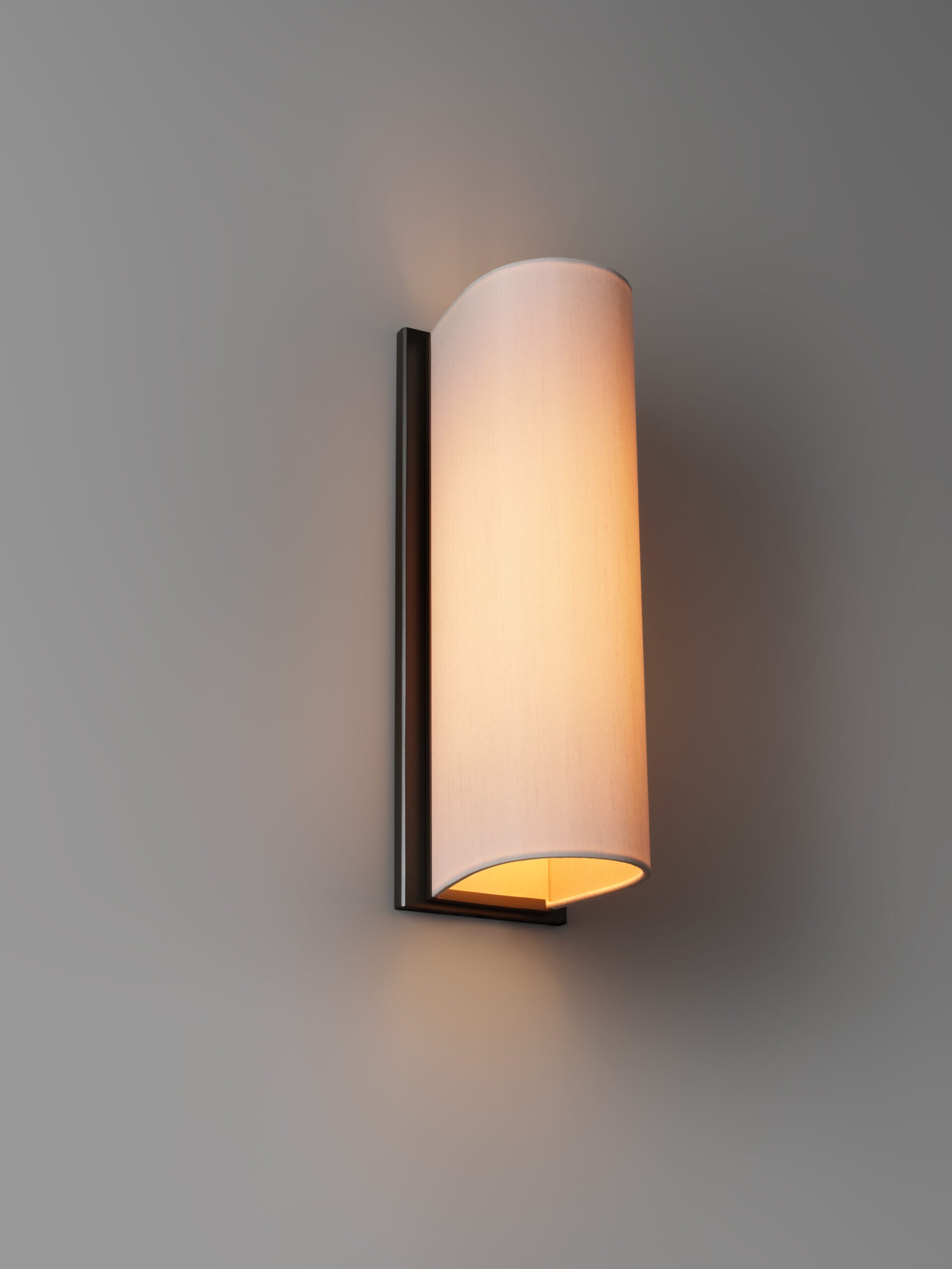 The Dessay Sconce is machined from solid brass. All parts are hand polished and patina’d. The shade is made from ivory silk.