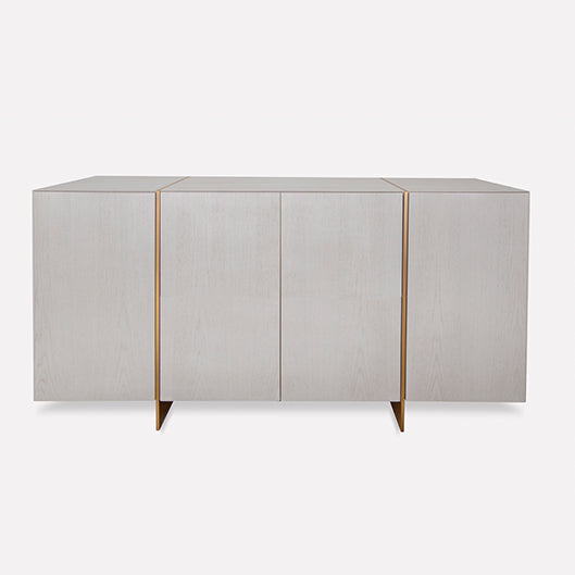 This cleanly designed buffet shines through its combination of European oak and sleek inlayed lines of noble metal. The craftsmanship is shown in every detail of the woodwork as for instance the 45 degree cut edges.The interior distribution accomodates for silverware dravers and porcelaine shelves whitle the exterior doors keep the clean sophisticated look.