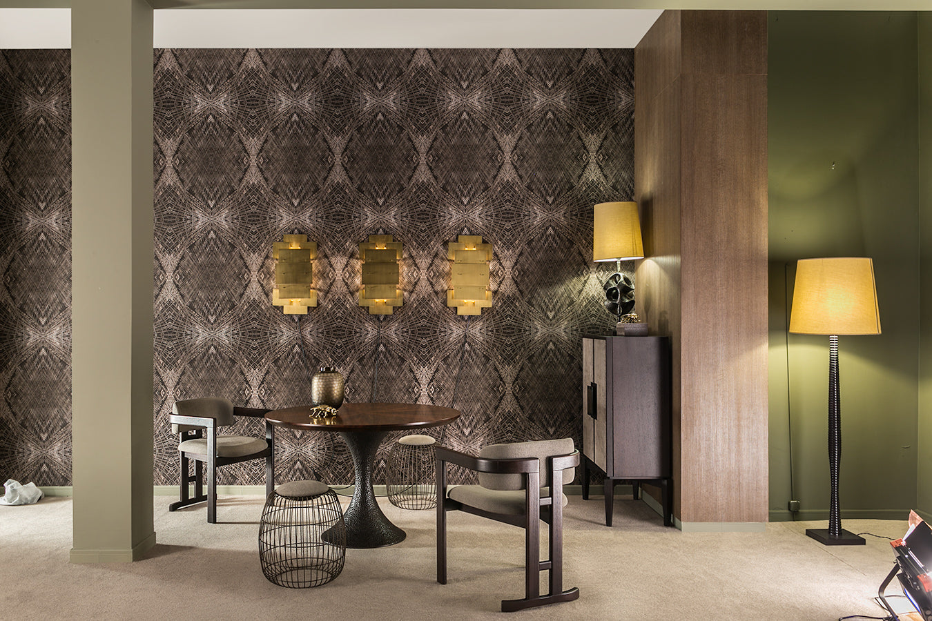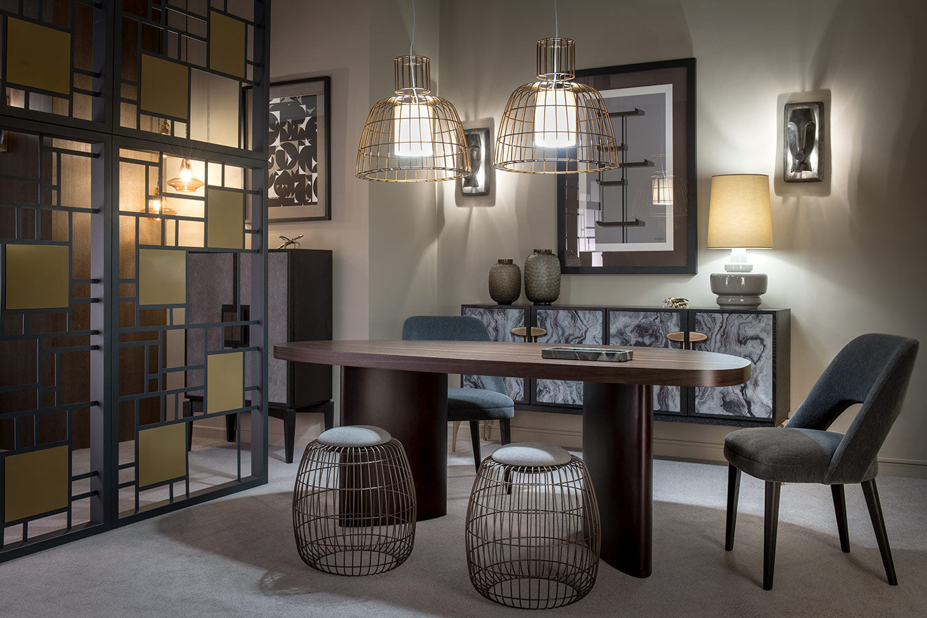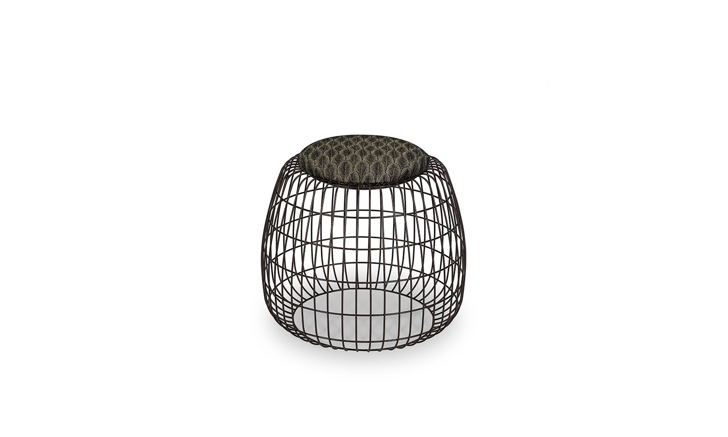 This decorative pouf with metal structure in gold, bronze or copper finish is available in Cat I-VI fabrics and leathers (0,5m / un.) and is possible in customer’s own material.