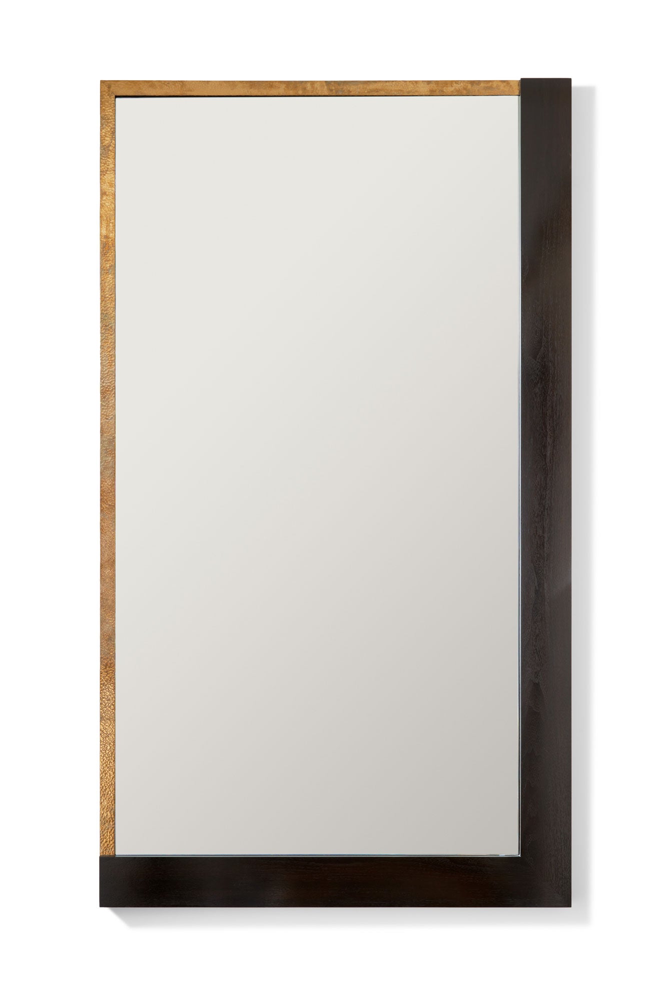 This mirror was originally crafted as a pair, with a defined right and left side – although they hang beautifully on their own. The Due Mirror features an asymmetrical frame with a combination of Nimmo’s signature hand hammered bronze and walnut. The imposing scale can be modified to fit any location or situation.