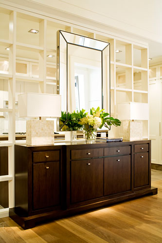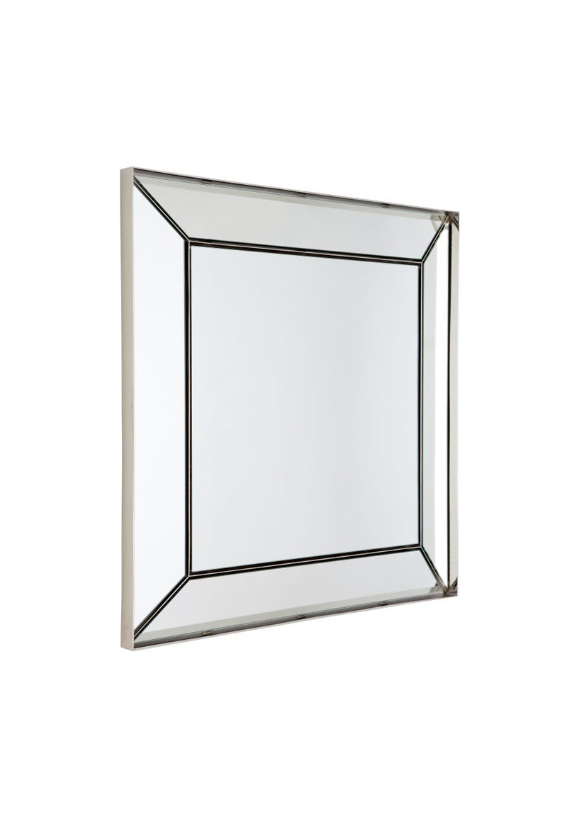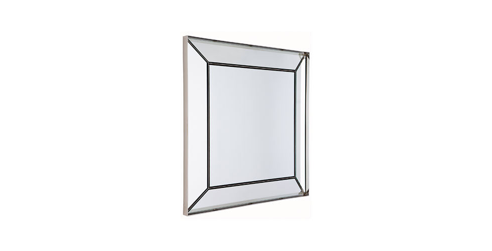iron framed floating mirror with inward or outward slanting reflective panes.
