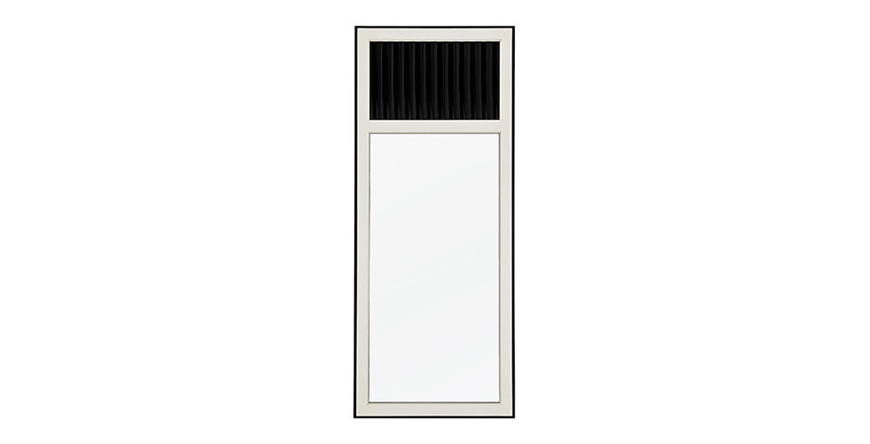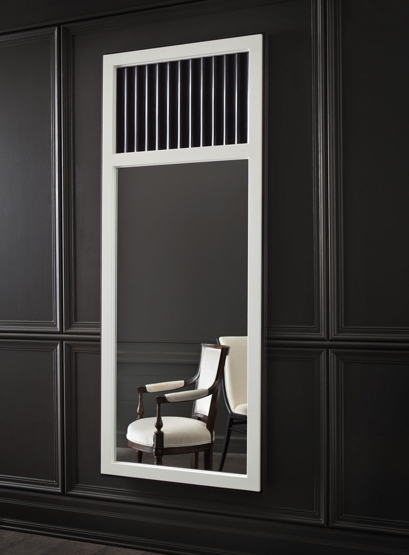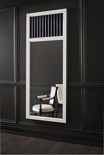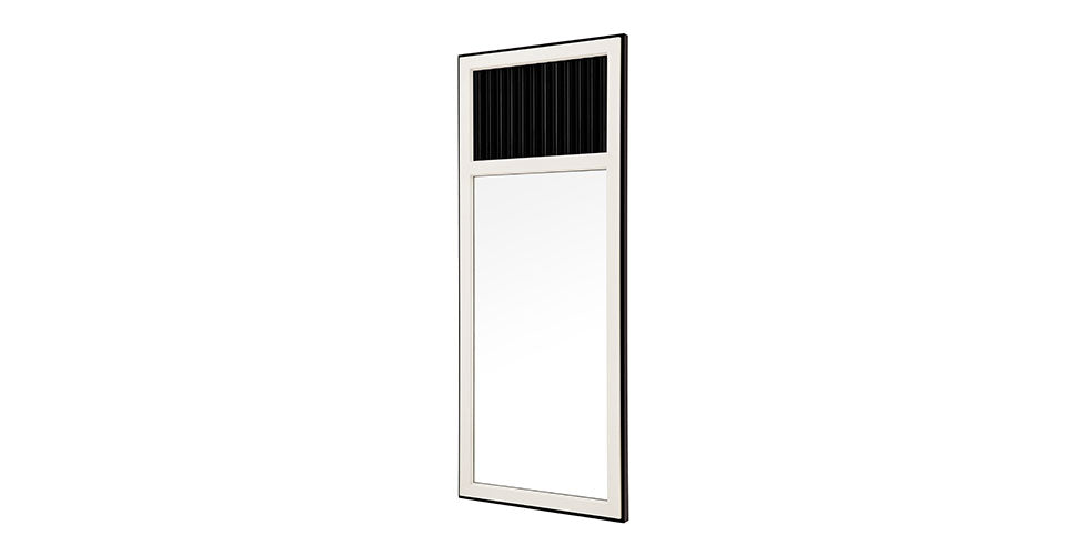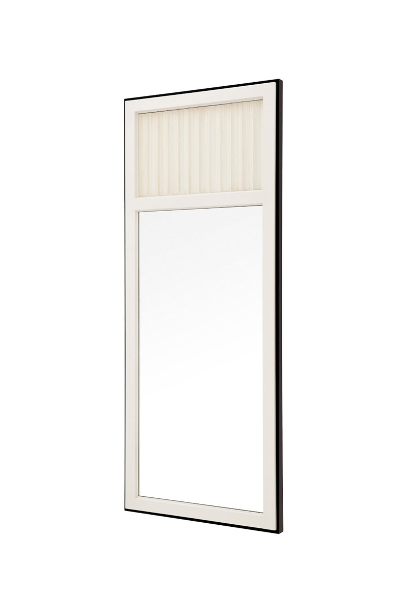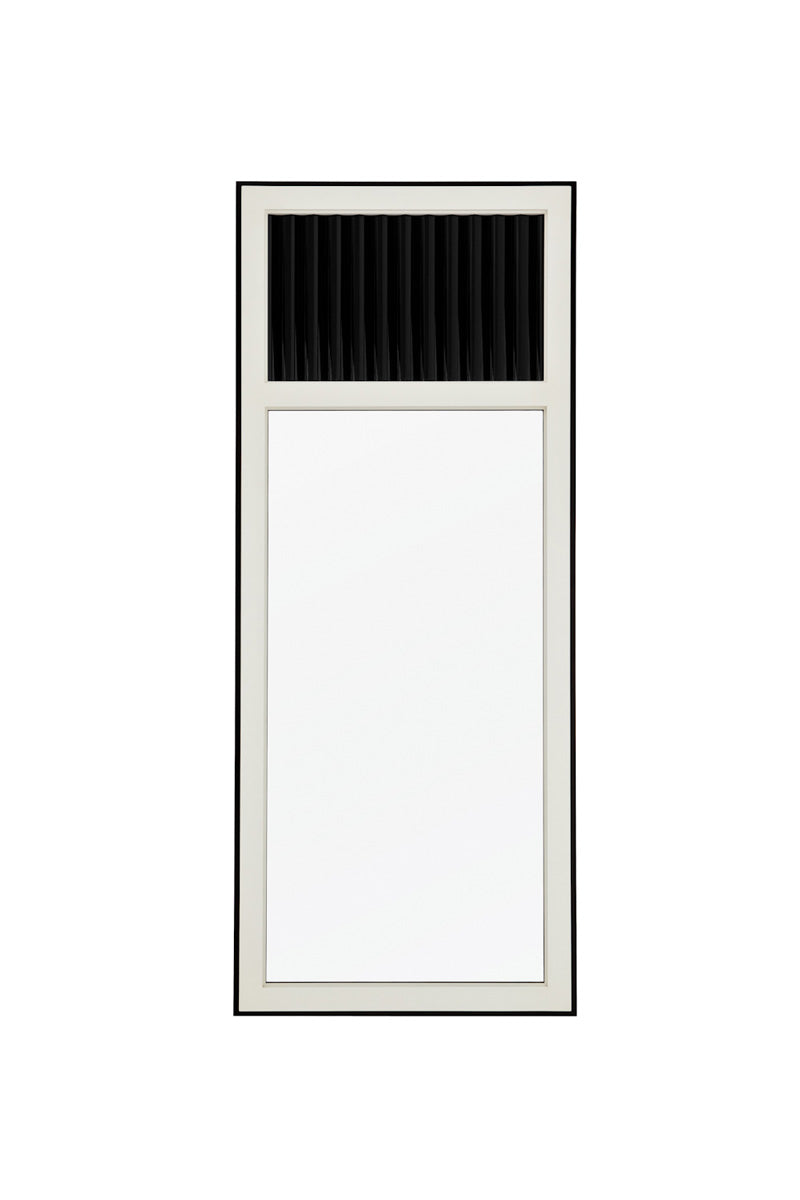 lacquer fluted surmount atop a clear or antique mirror. wood with lacquer border frame.