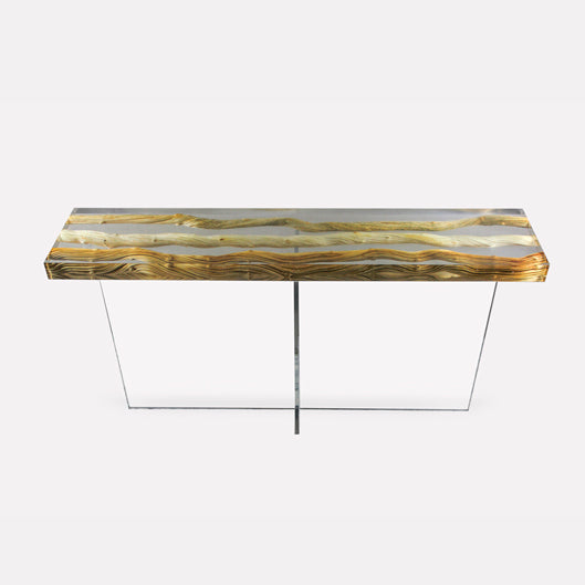 Nature and Innovation come together in this console as the naturally twisted Liana woods are floating in an extra clear lake of Resin and resting on a glass base. The straight shape of top and base provide the contemporary “invisible” background to have nature be the unique design element.