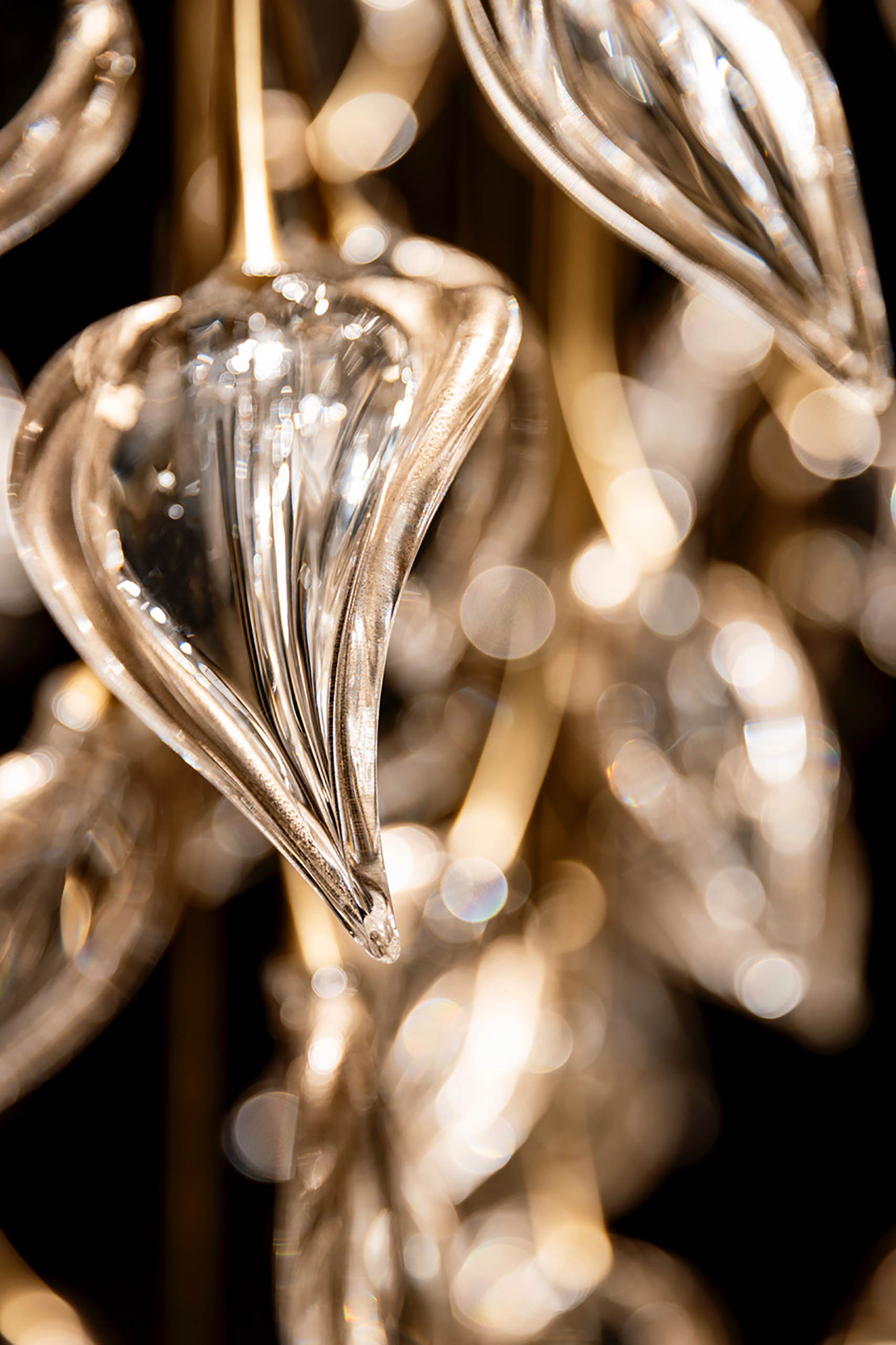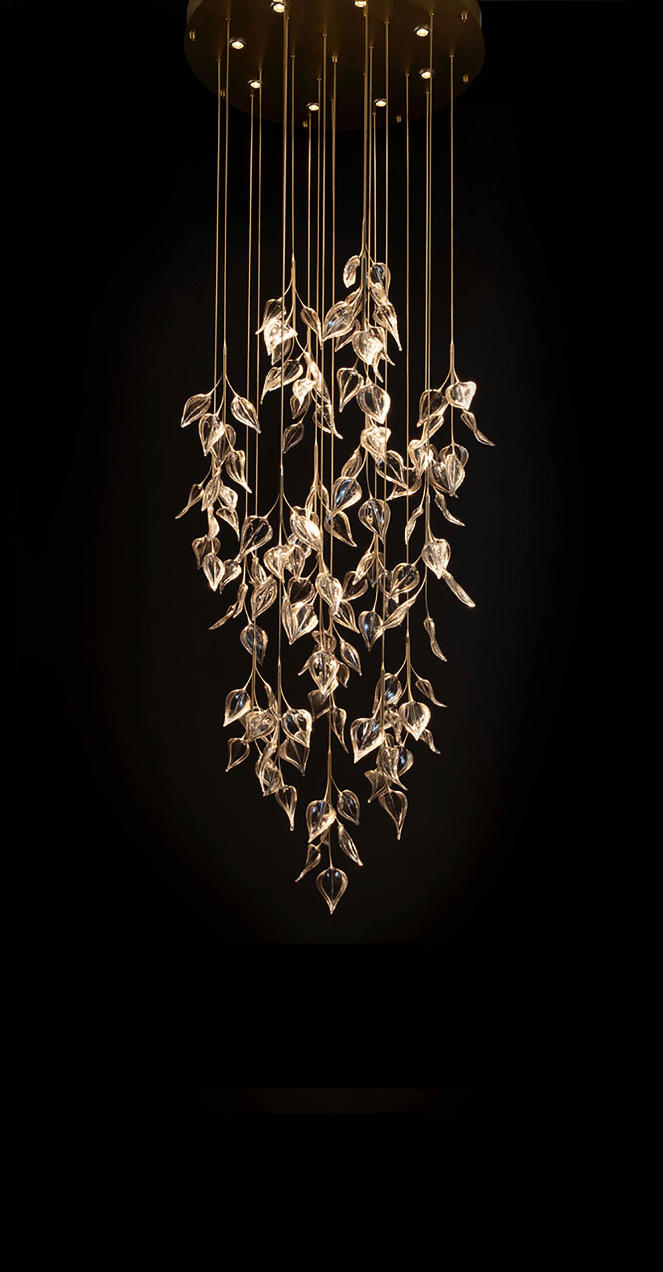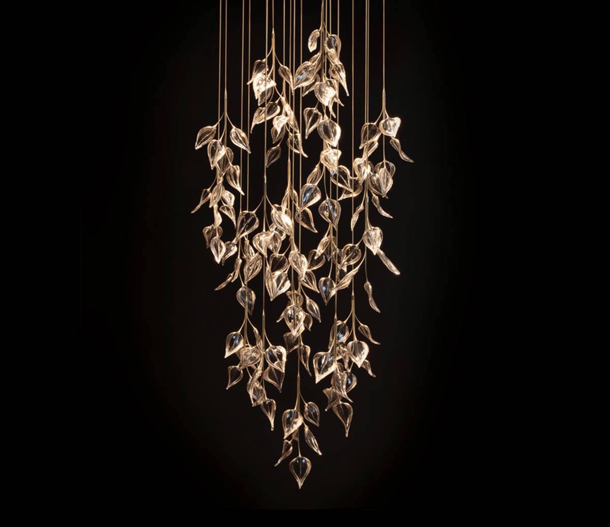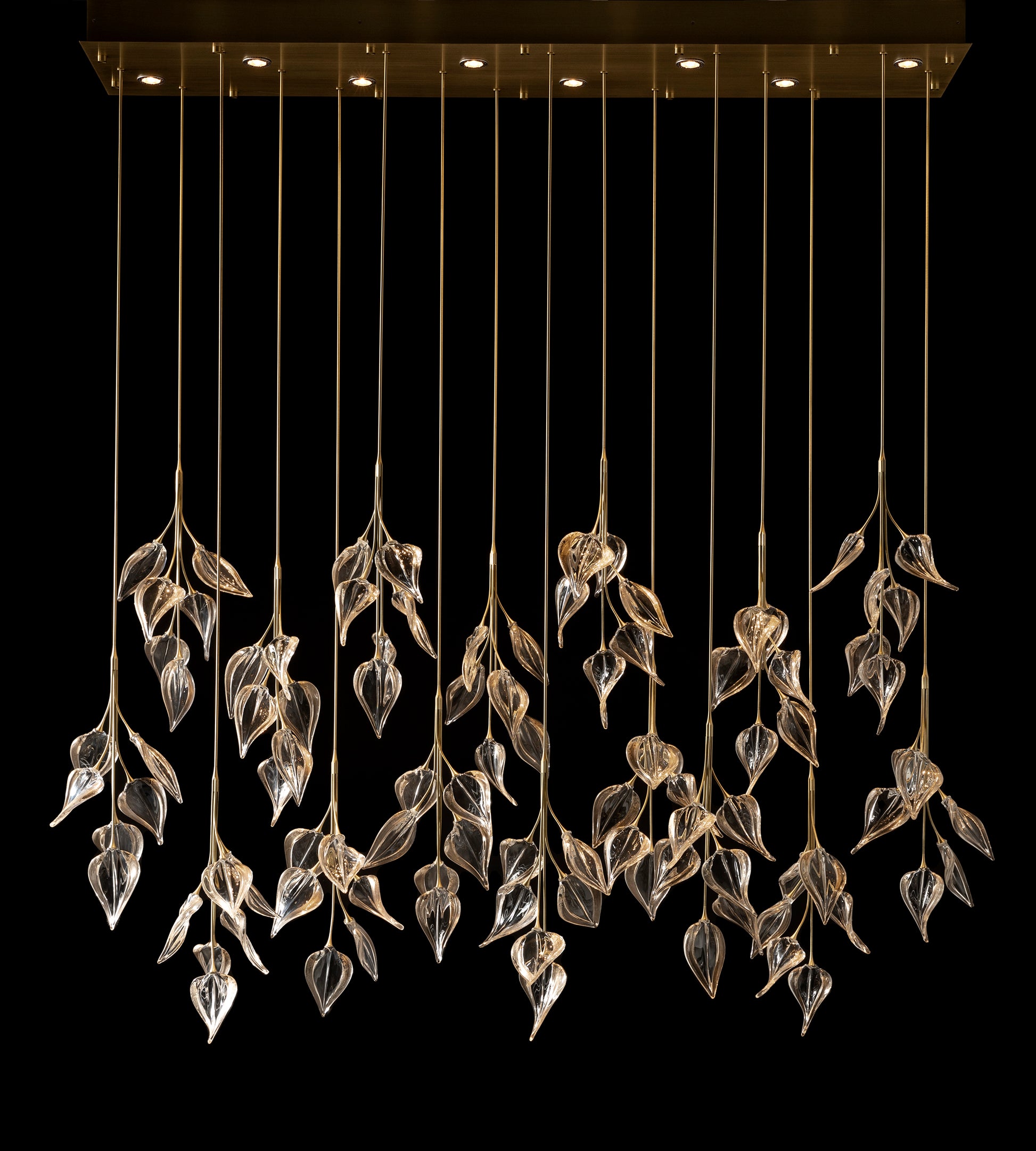Sensuous and feminine in form, the Foglia chandelier evokes the random and untamed foliage of branches and leaves in nature. Juxtaposed on metal strands that seamlessly integrate the stems and leaves with no visible hardware to distract from the natural flow of the chandelier. It is at once organic and structured, blurring the lines between lighting and sculpture.