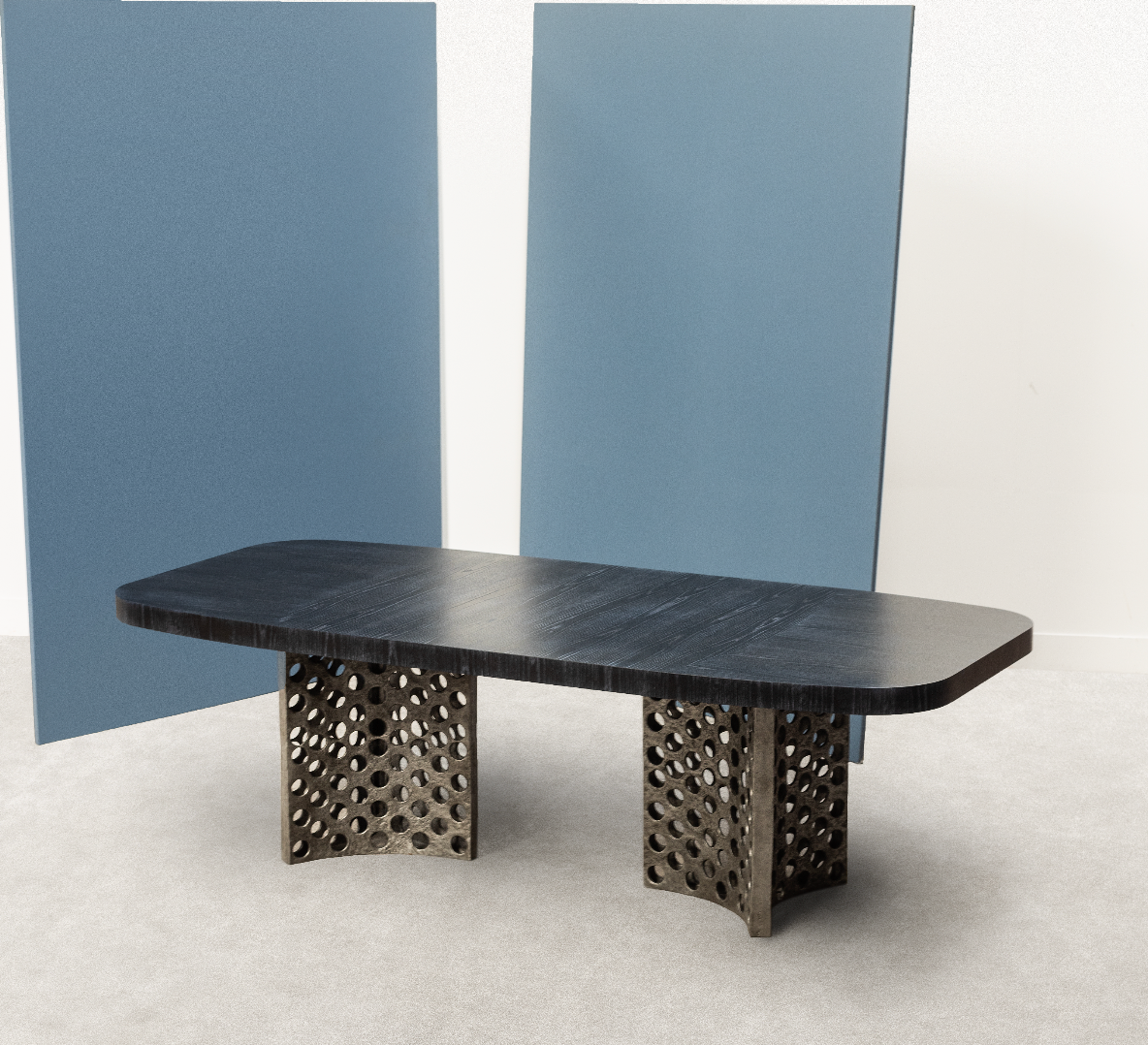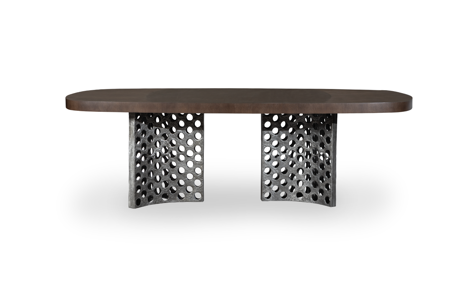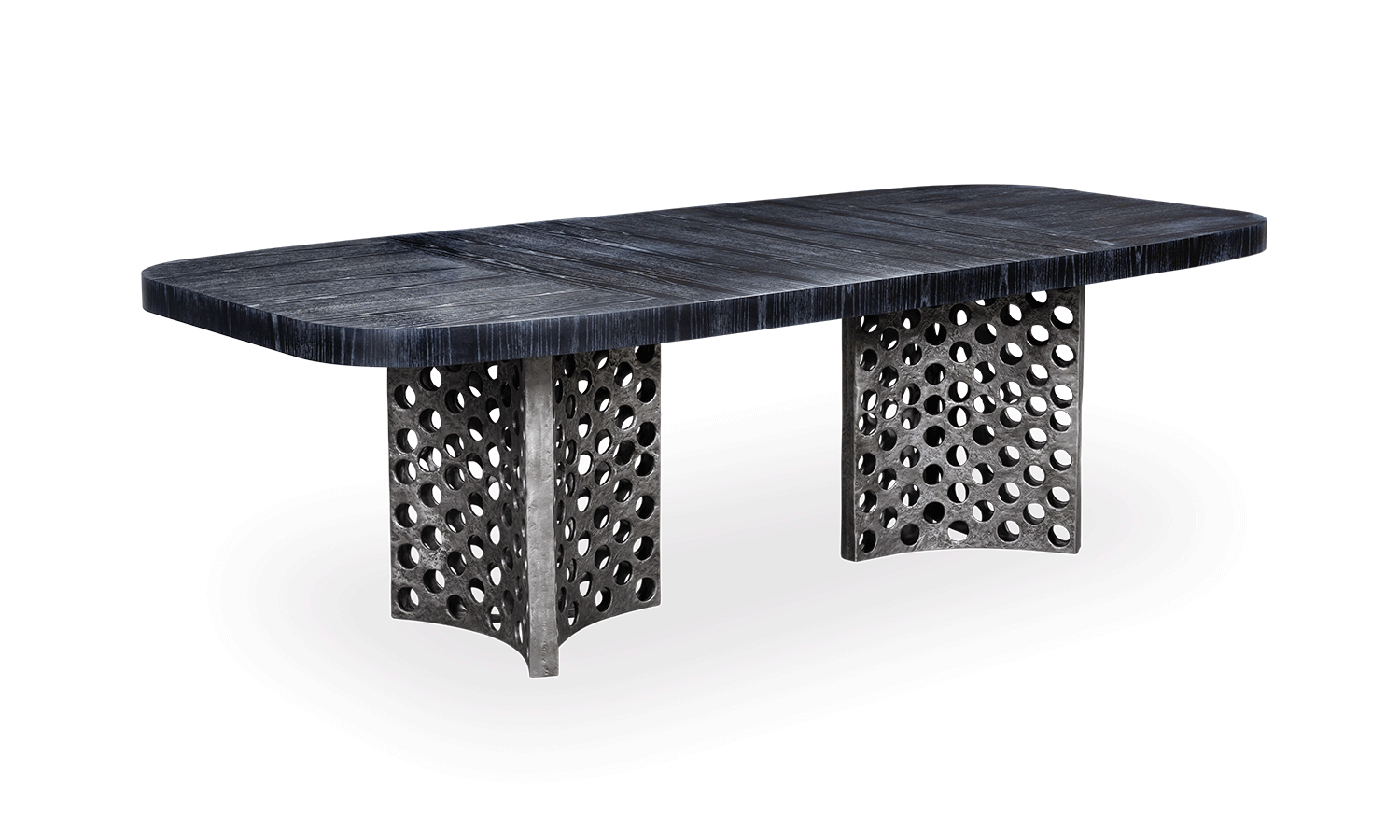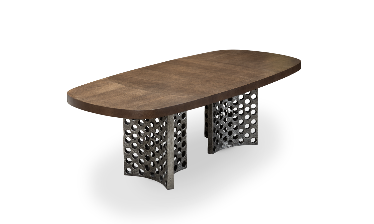 Handcrafted in Portugal, this dining table features two burnt cast aluminium bases and the surface is available in oak veneer with standard finishes. Alternate sizes and finishes are available on request.