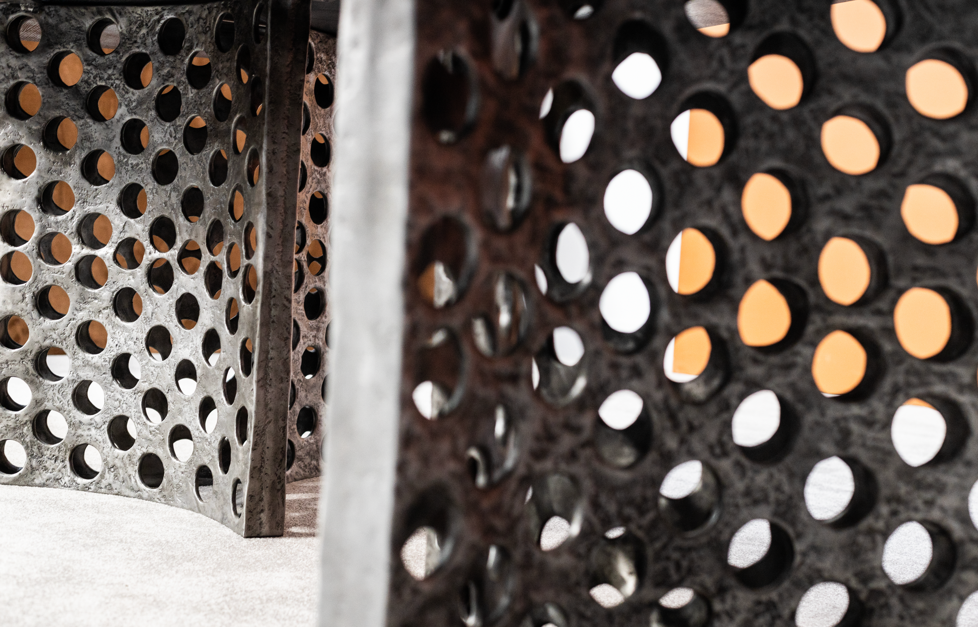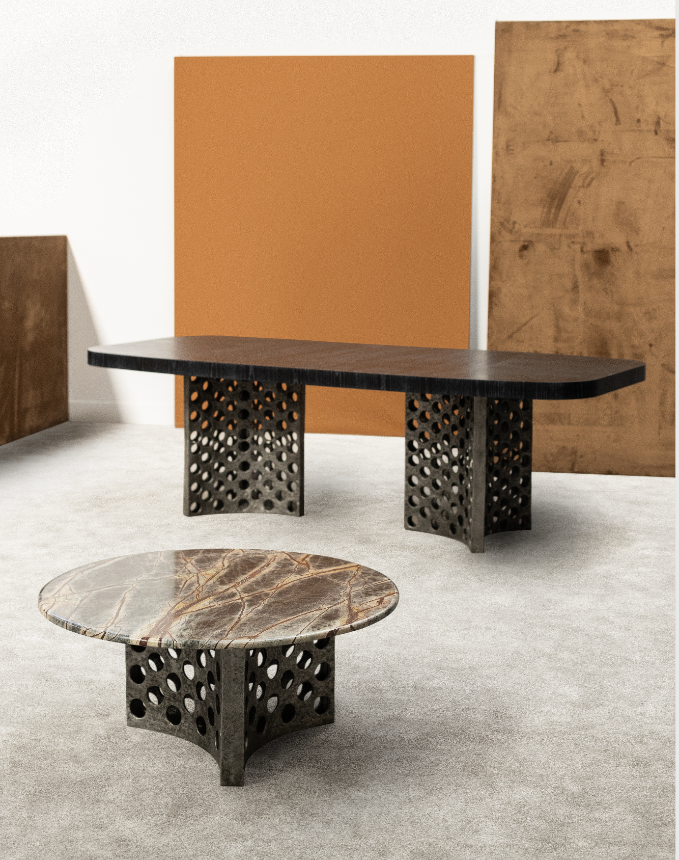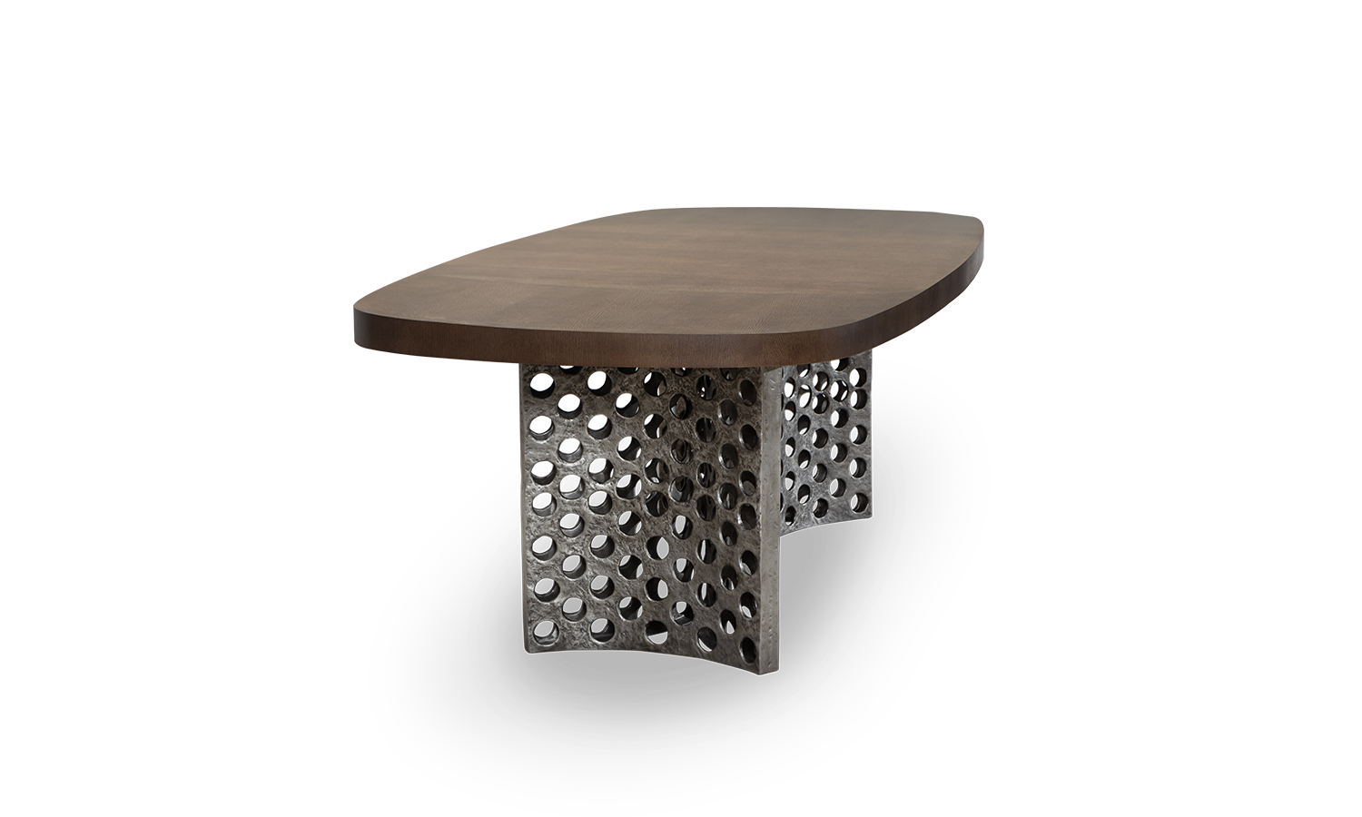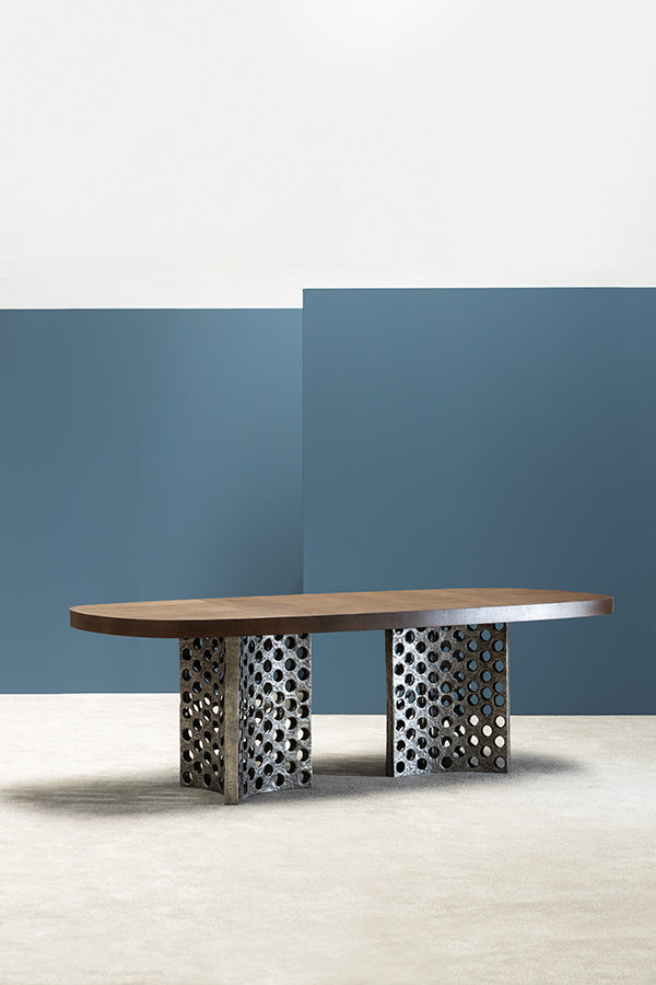 Helika dining table draws its name from the propeller shape of its base which is softened by the sculptural honeycomb texture of its cast aluminium base. This variant of Helika Dining has two bases in cast aluminium and an oak veneered top that can be customised in size or colour to create the perfect ambiance. Be it for a mountain vibe or an urban loft, it is a versatile piece that will not go unnoticed.