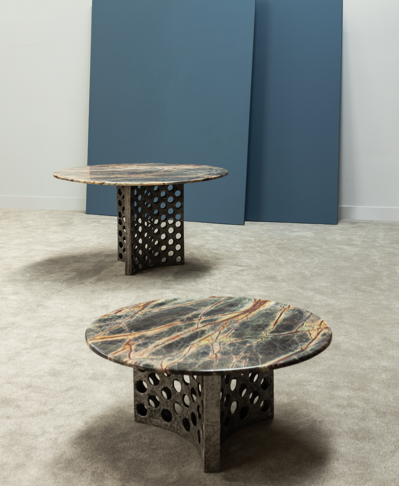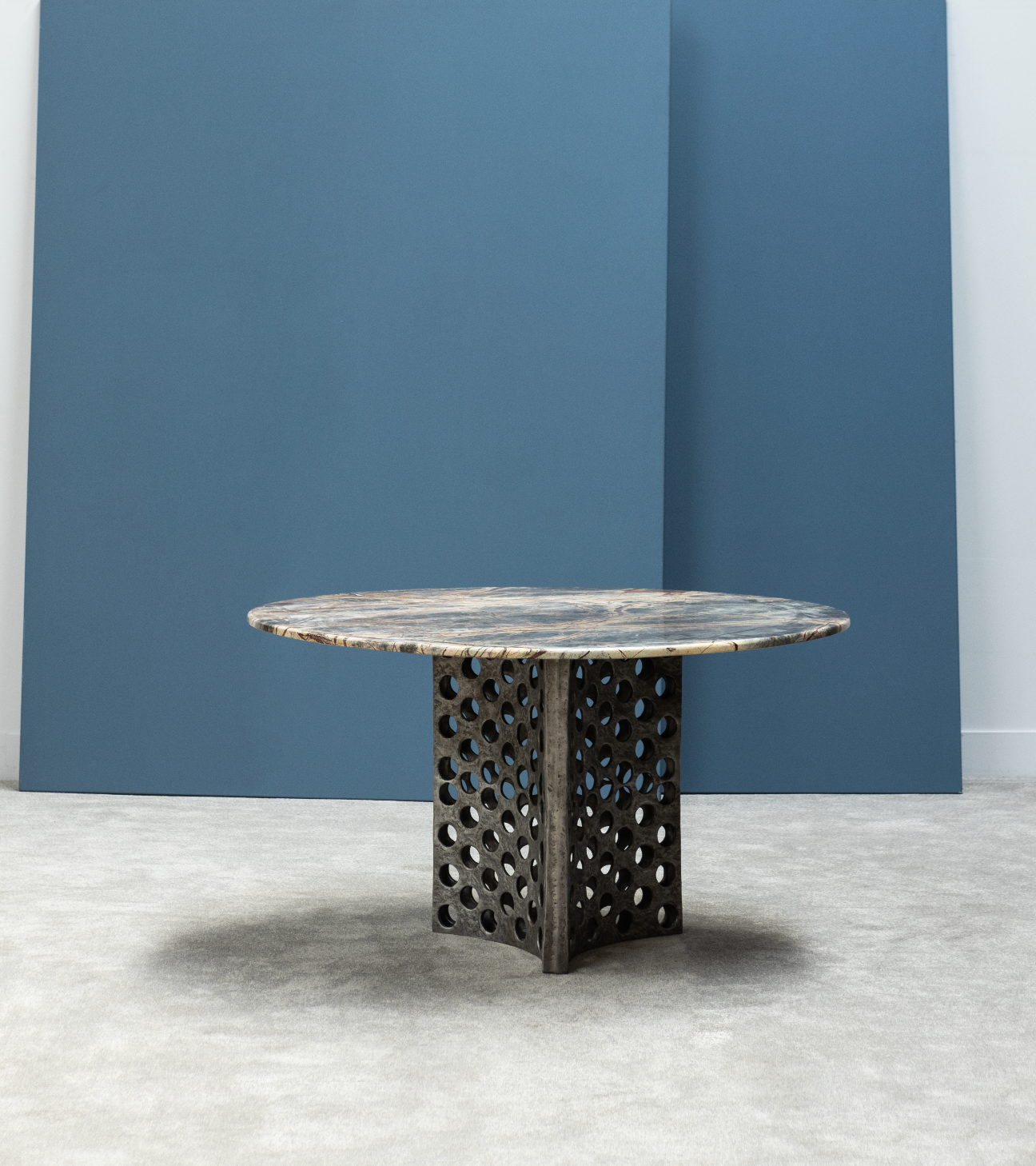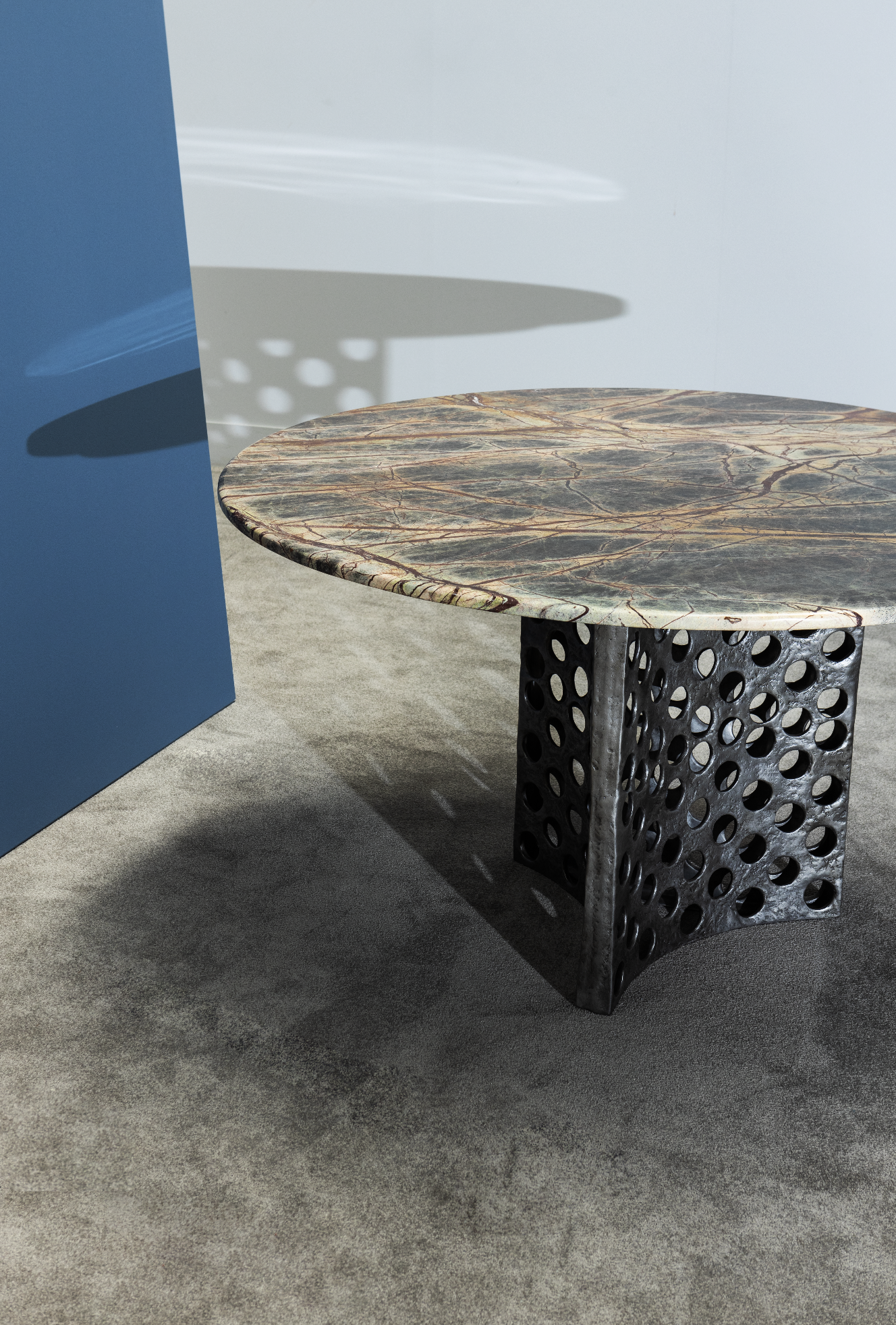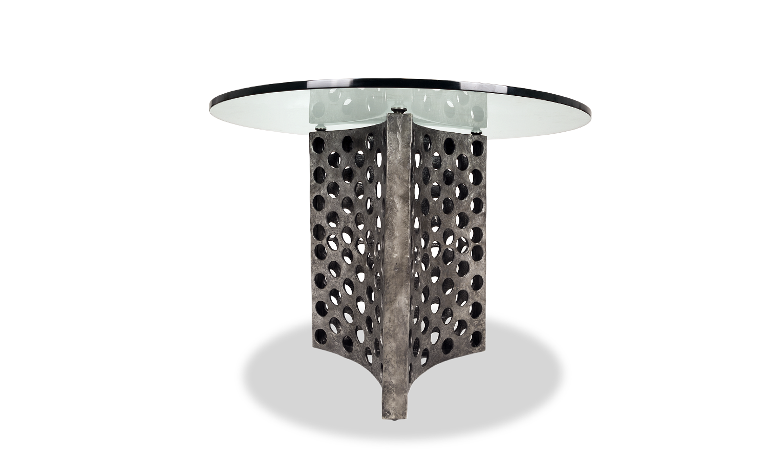Available in coffee and dining table versions, Helika draws its name from the propeller shape of its base which is softened by the sculptural honeycomb texture of its cast aluminium base.