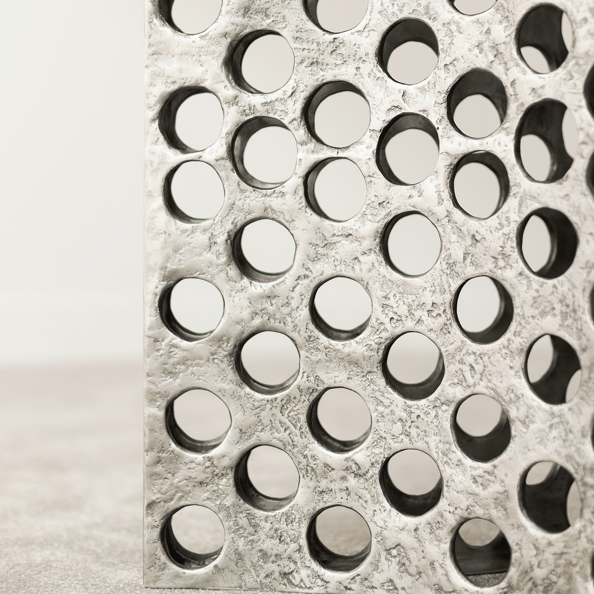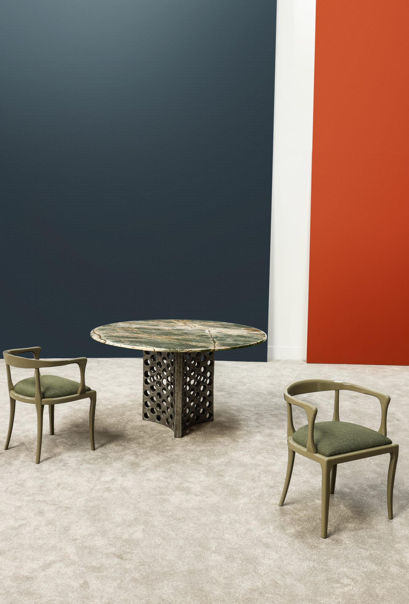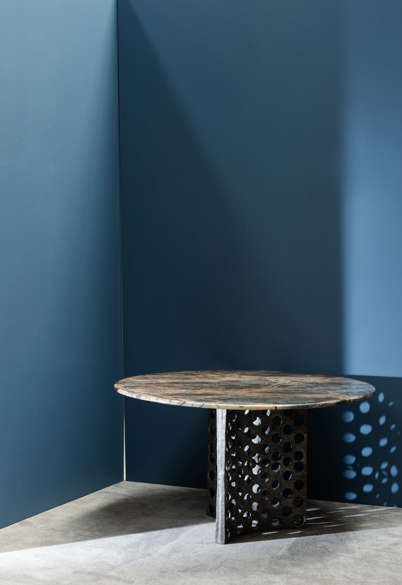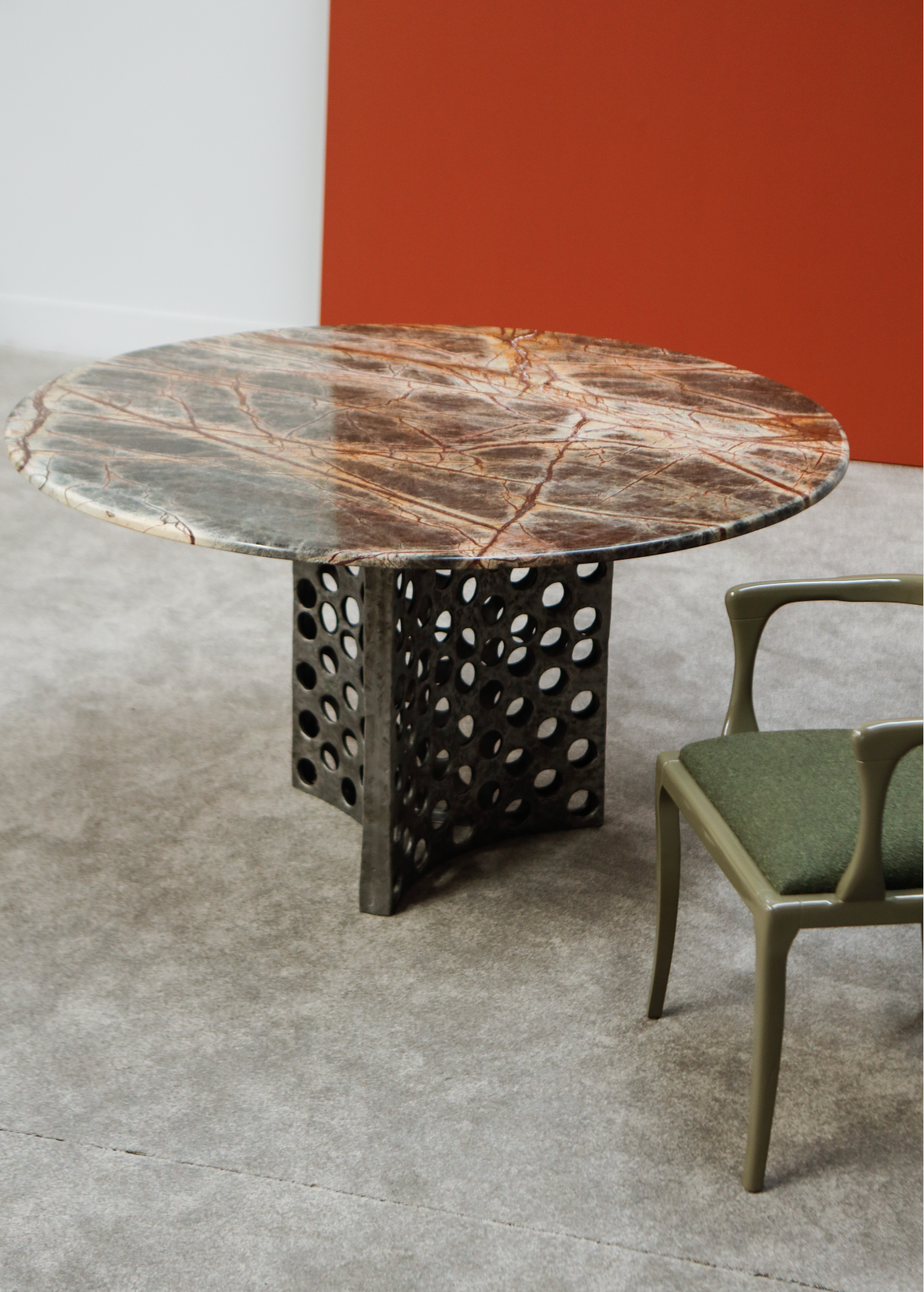Available in coffee and dining table versions, Helika draws its name from the propeller shape of its base which is softened by the sculptural honeycomb texture of its cast aluminium base.
