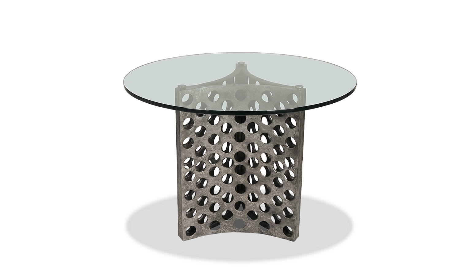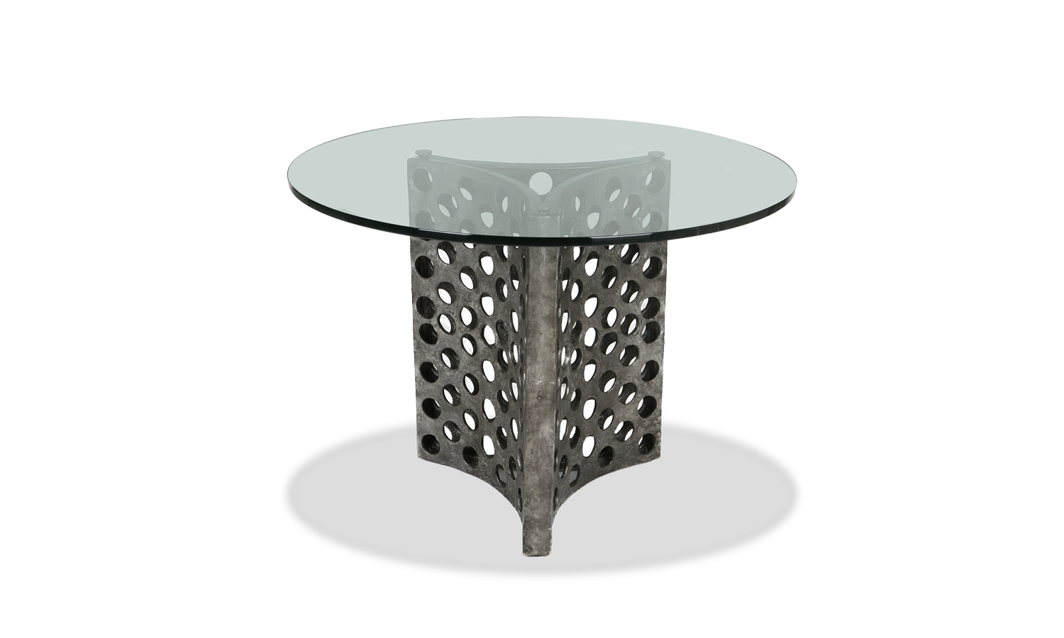 This dining table features a burnt cast aluminium base with glass surface. Other finishes and sizes may be available on request.