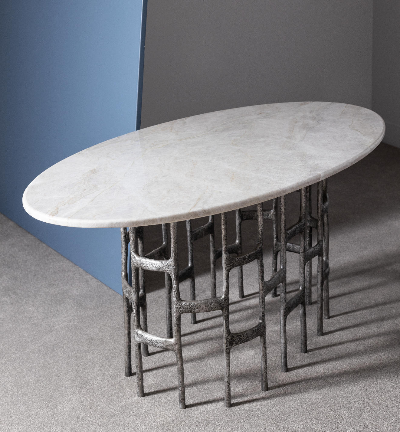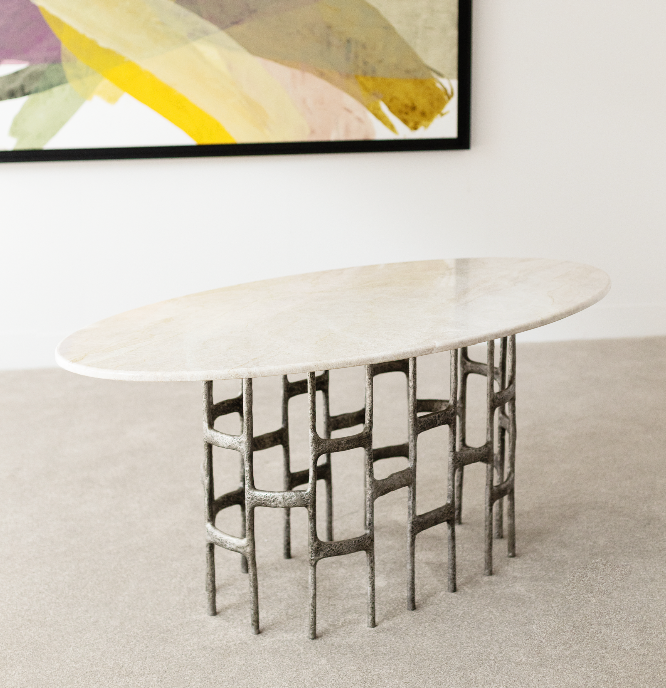 The Hoffman range includes dining tables in different sizes and shapes, coffee tables, side tables and a console. Made from cast aluminium or cast brass, these tables are handcrafted by artisans. The surface is available in natural stone or wood. These tables are made to order, allowing great flexibility in customisation in both dimensions and finishes. Contact our sales team for further advice on this product.